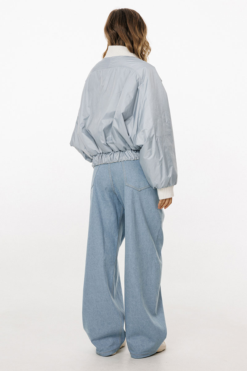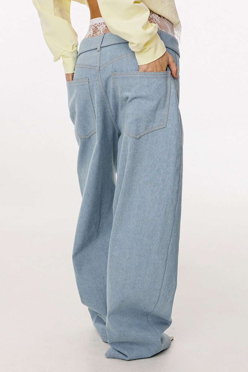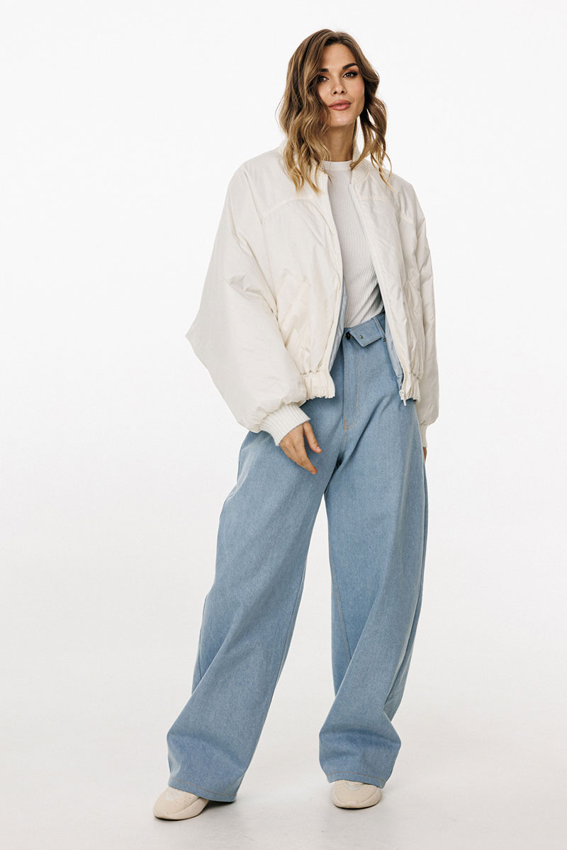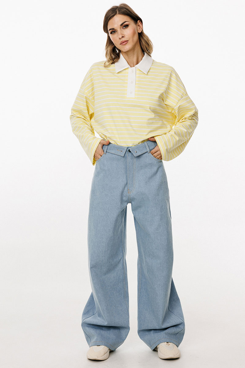Брюки выполнены из плотного джинса. Брюки прямого силуэта, на притачном поясе, длиной в пол. На передних частях обработаны фигурные боковые карманы и застёжка на металлическую молнию и пуговицу. На задних частях обработаны кокетки и накладные карманы. Пояс выполнен с декоративным отворотом на лицо. По поясу обработаны 5 шлевок и декоративная петля.