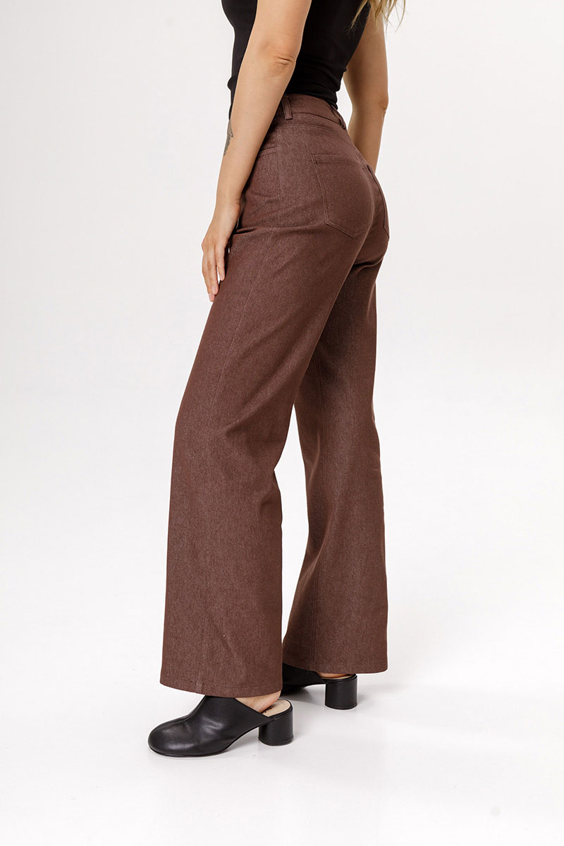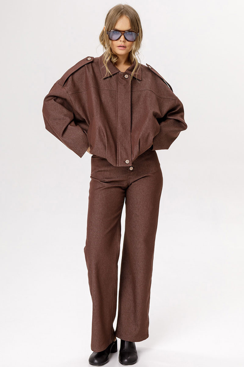 Детали: брюки с высокой посадкой, прилегающий силуэт, притачной пояс со шлевками, застежка на пуговицы, перед с боковыми карманами, спинка с кокеткой и двумя накладными карманами.