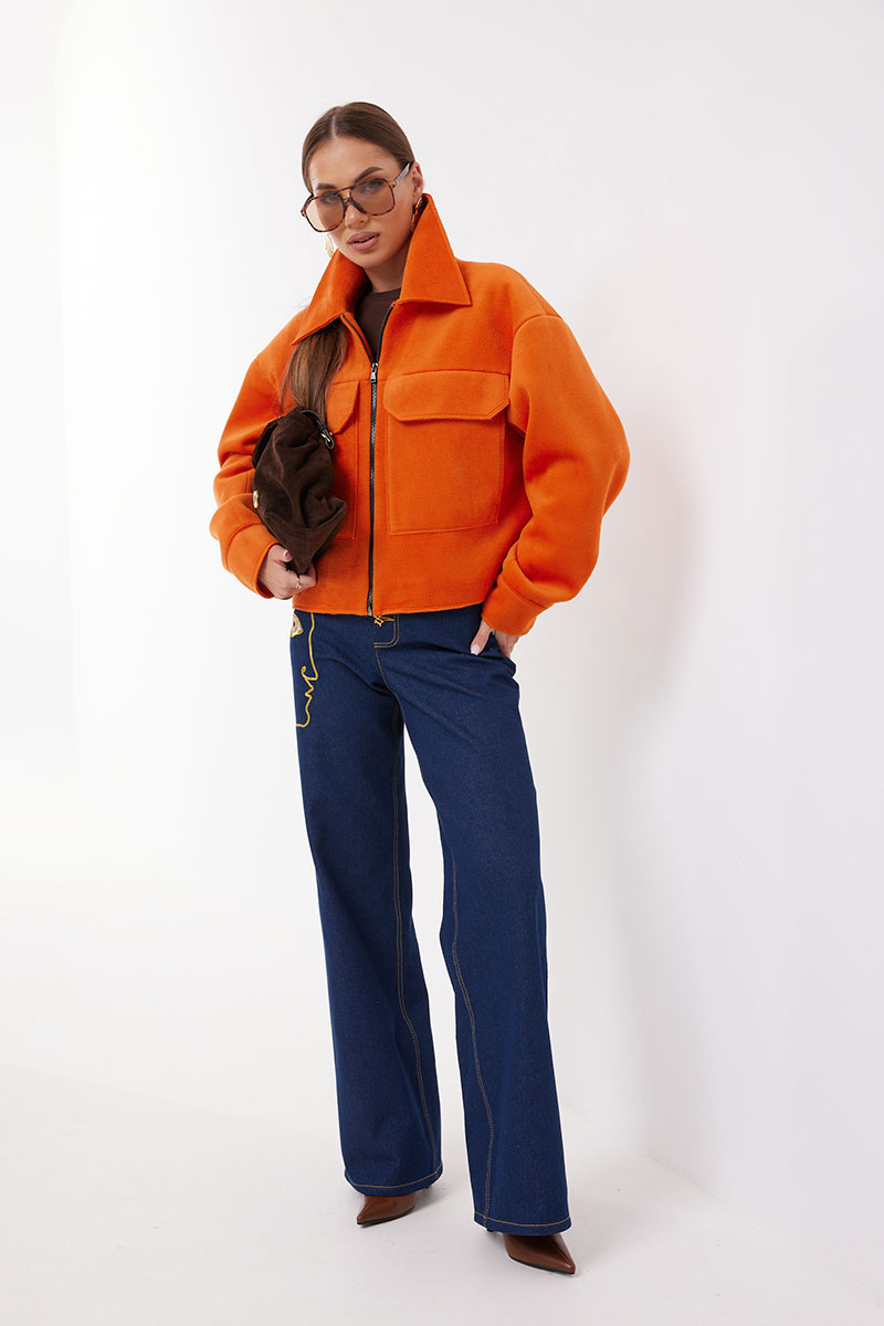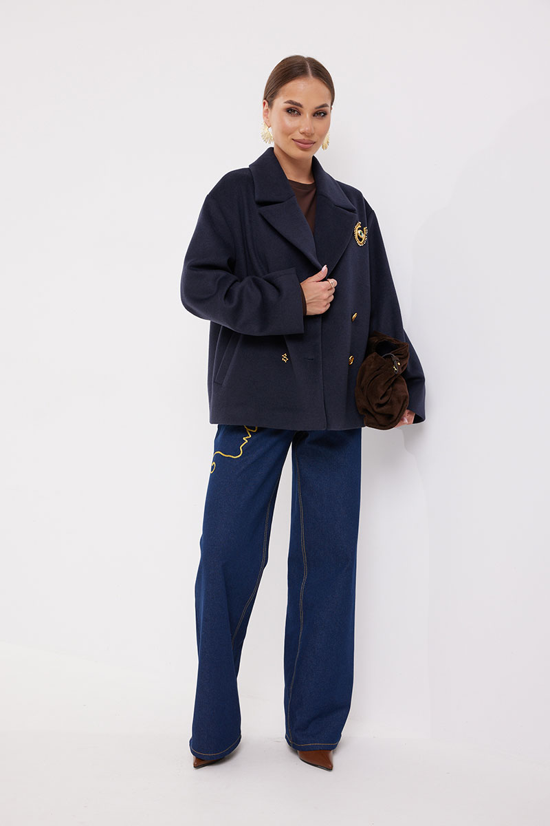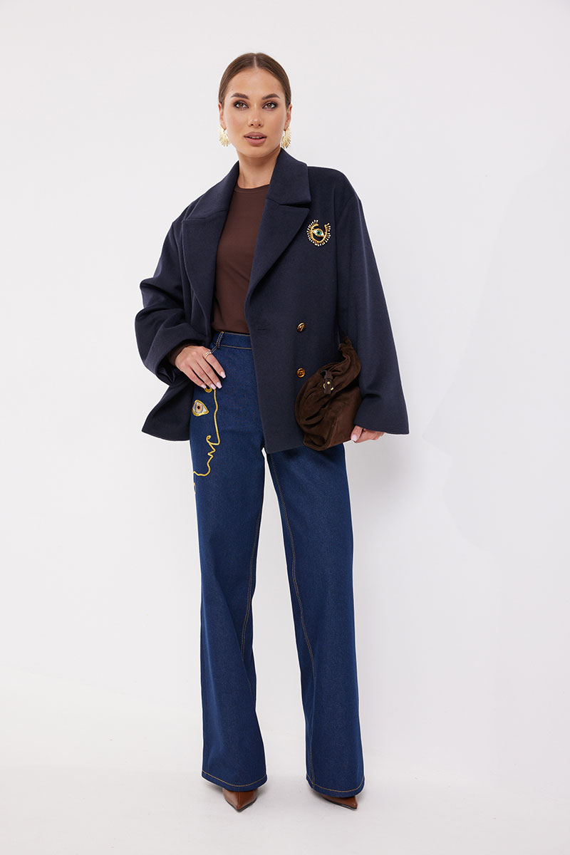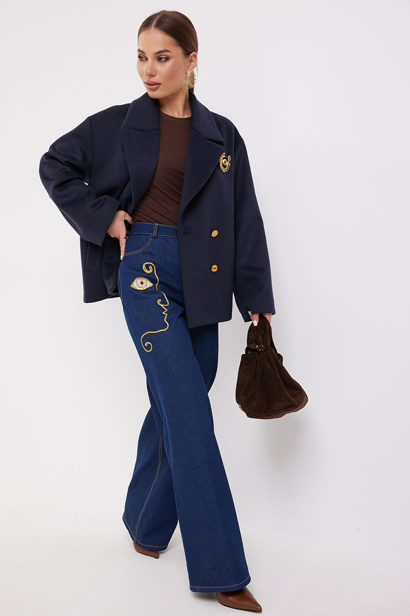 Джинсы с высокой посадкой прямого силуэта. Застежка на петли и декоративные пуговицы. По переду карманы, сзади накладные карманы. По швам контрастная отделочная строчка. На правой передней половинке брюк стильная вышивка.