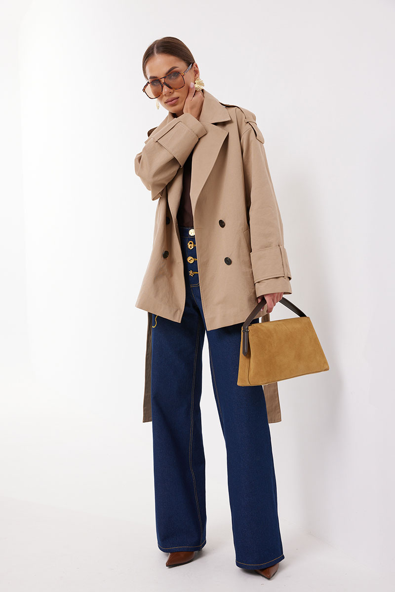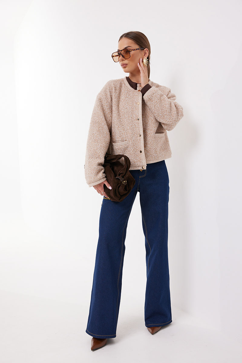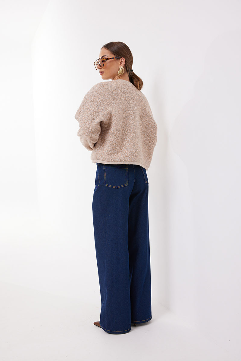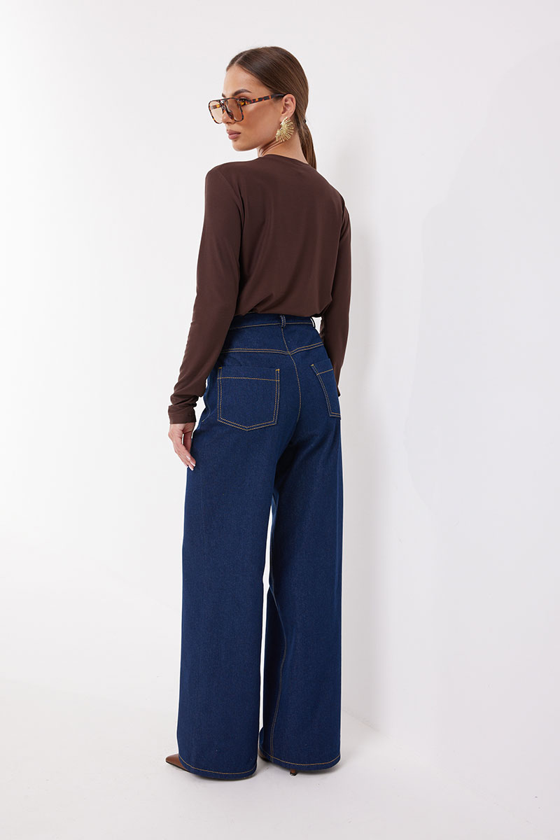 Джинсы с высокой посадкой прямого силуэта. Застежка на петли и декоративные пуговицы. По переду карманы, сзади накладные карманы. По швам контрастная отделочная строчка. На правой передней половинке брюк стильная вышивка.