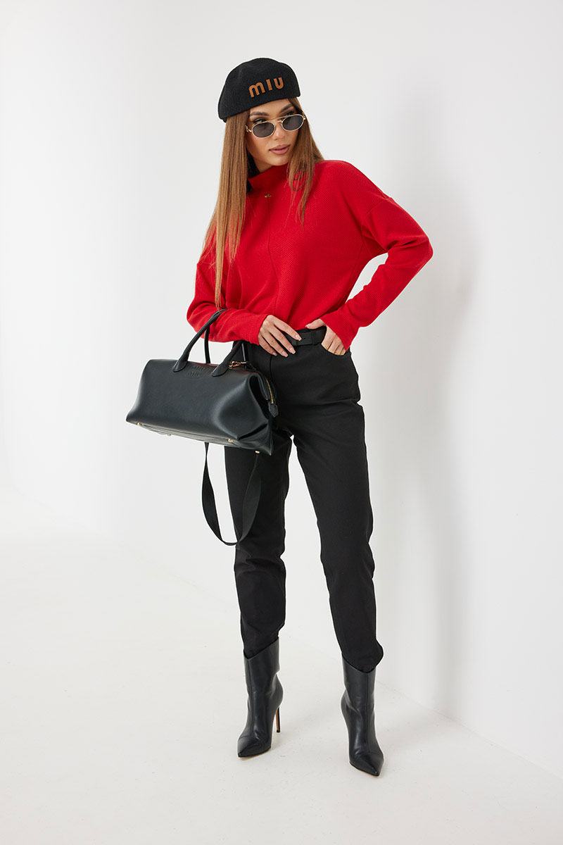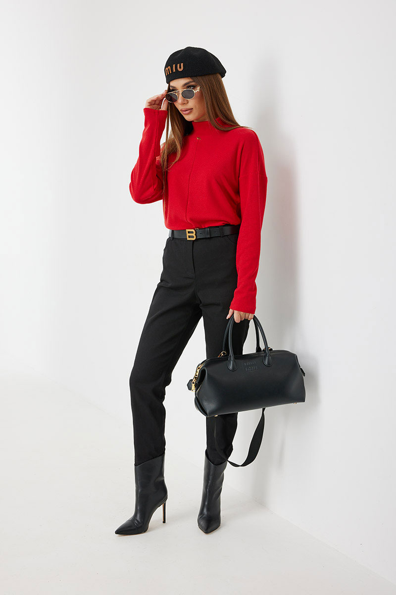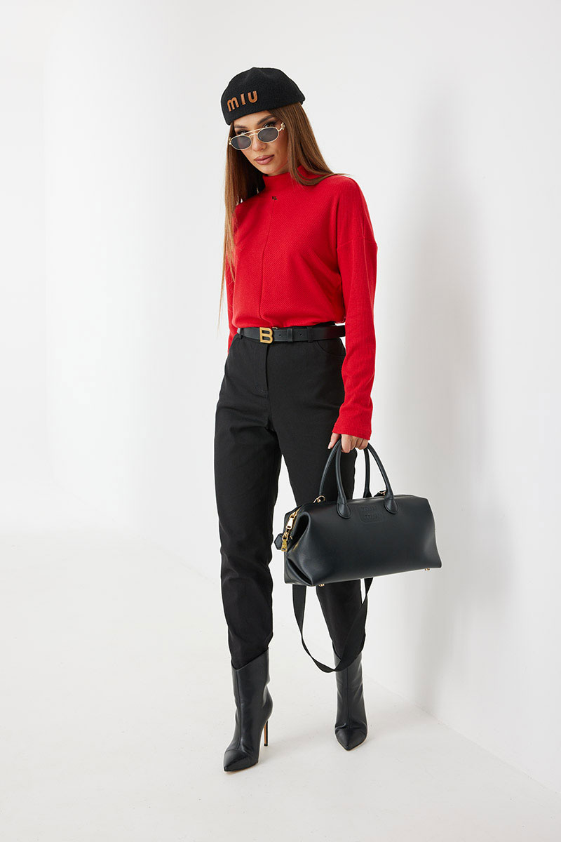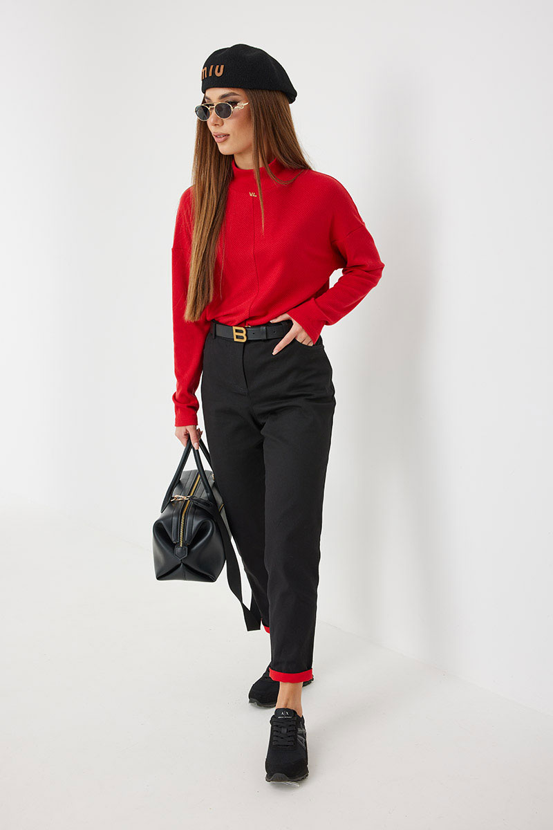 накладные карманы. Внутренний пояс и отвороты по низу брюк красного цвета.