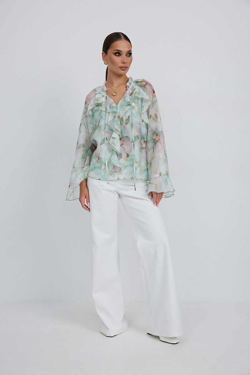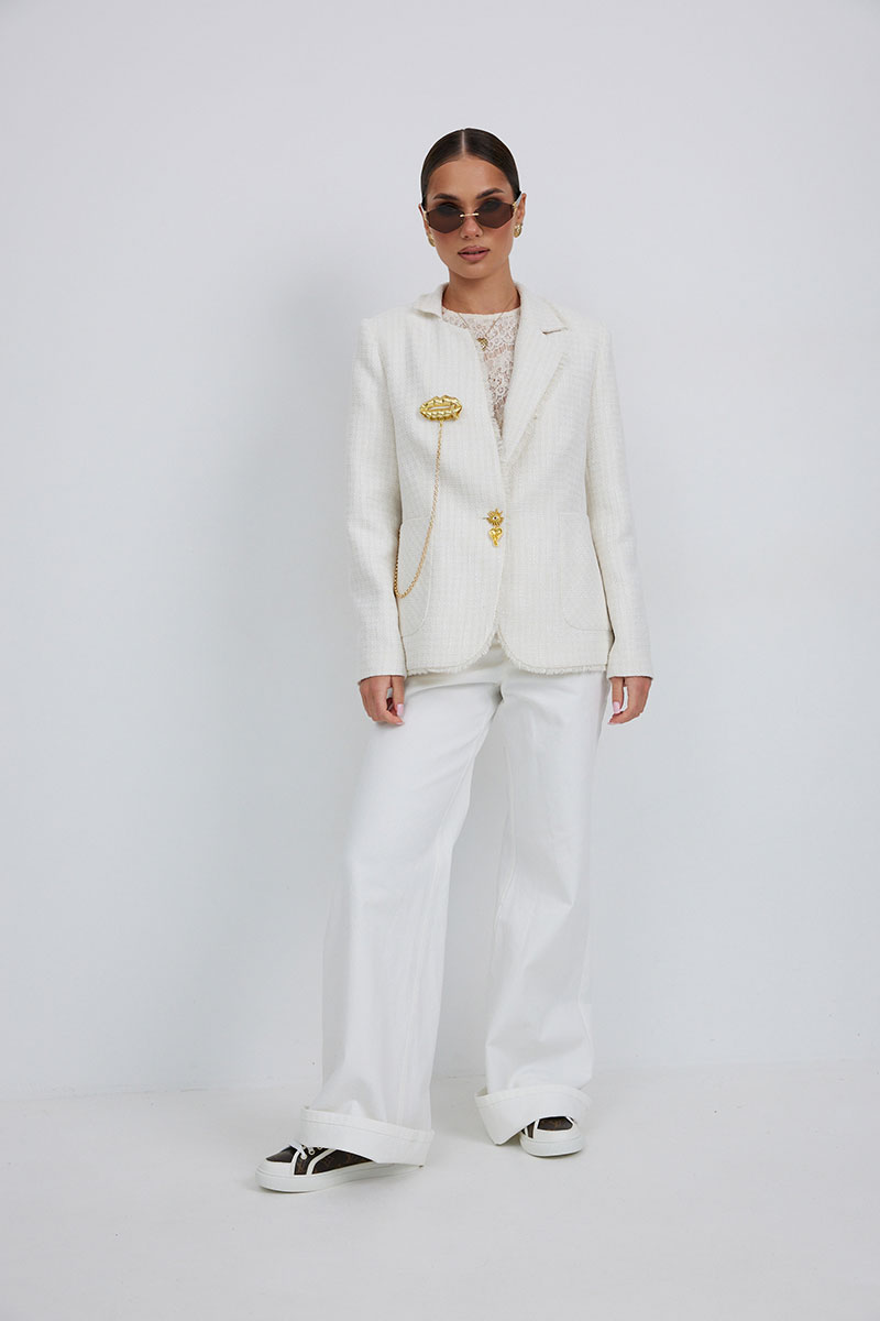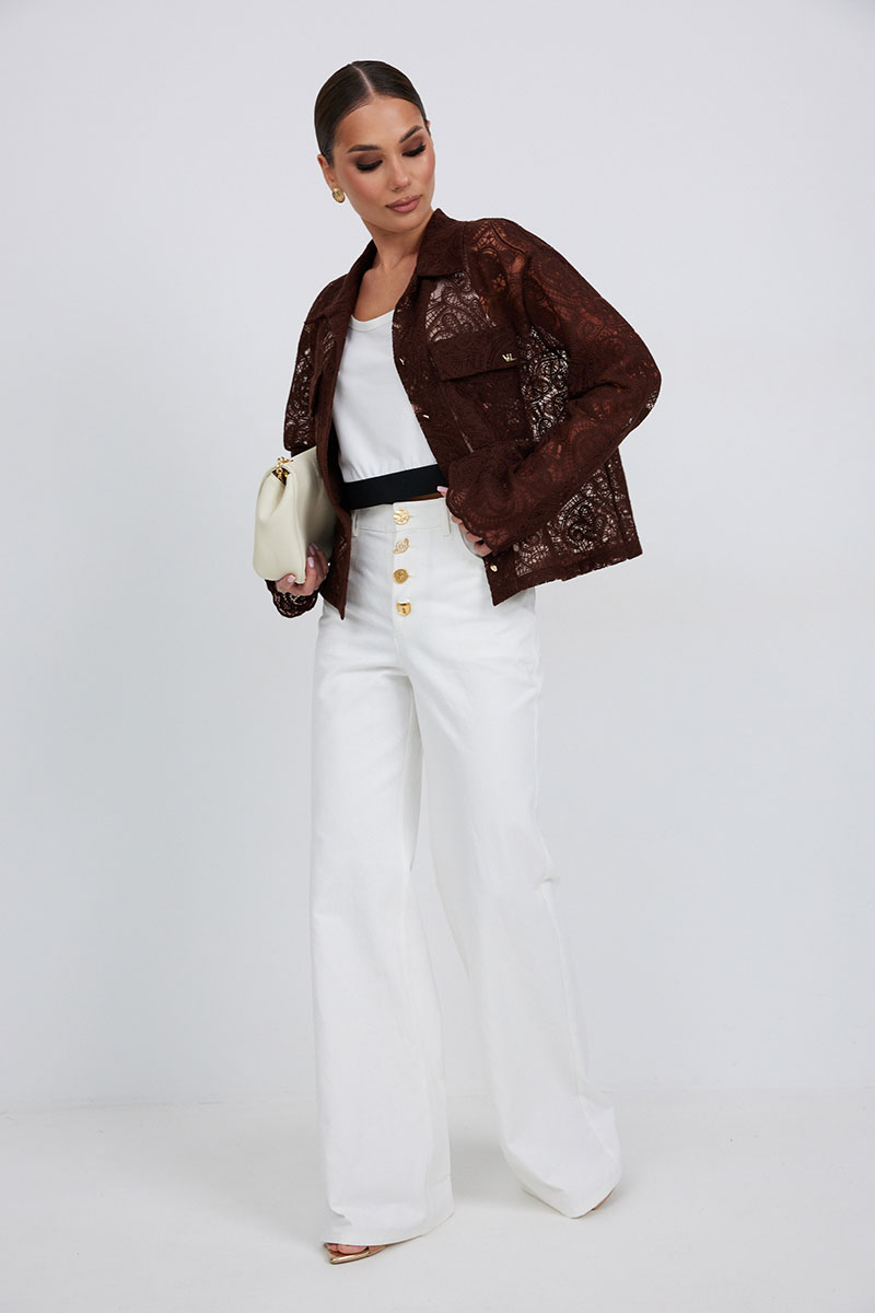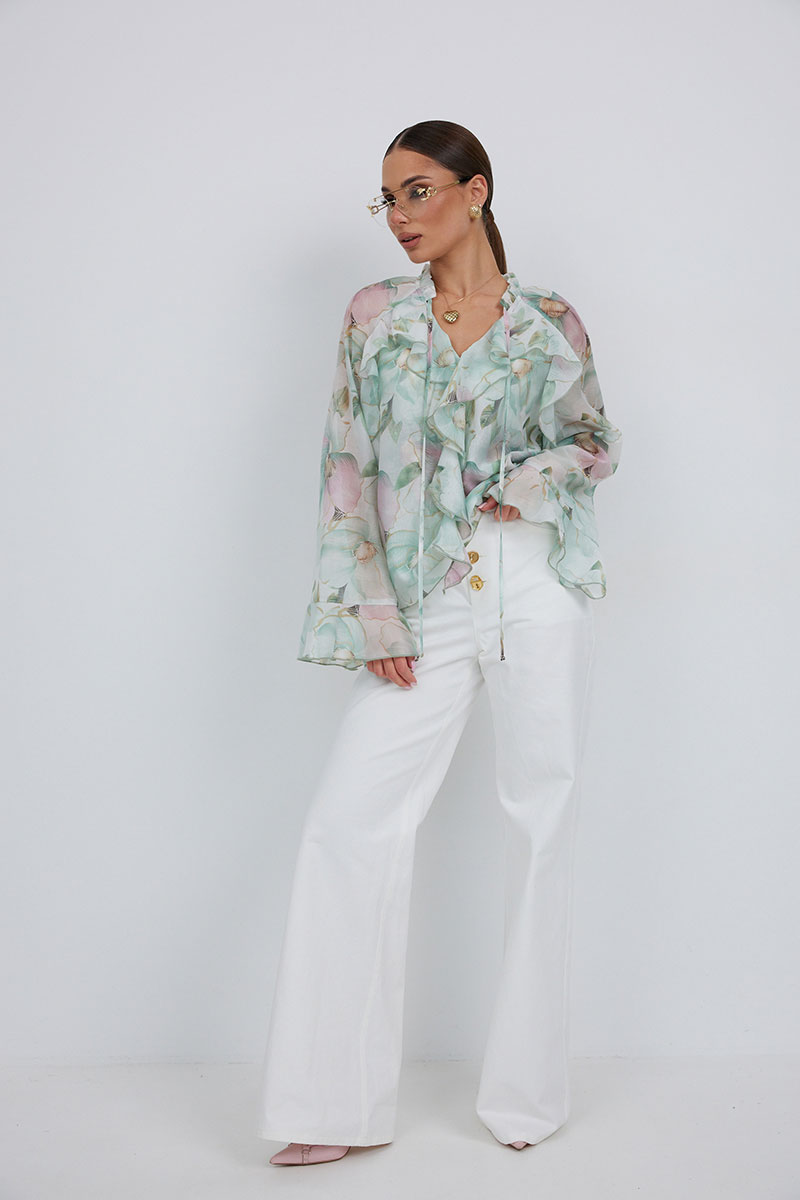 Джинсы с высокой посадкой прямого силуэта. Застежка на петли и декоративные пуговицы. По переду карманы, сзади накладные карманы. По швам контрастная отделочная строчка.