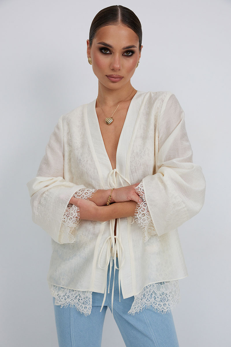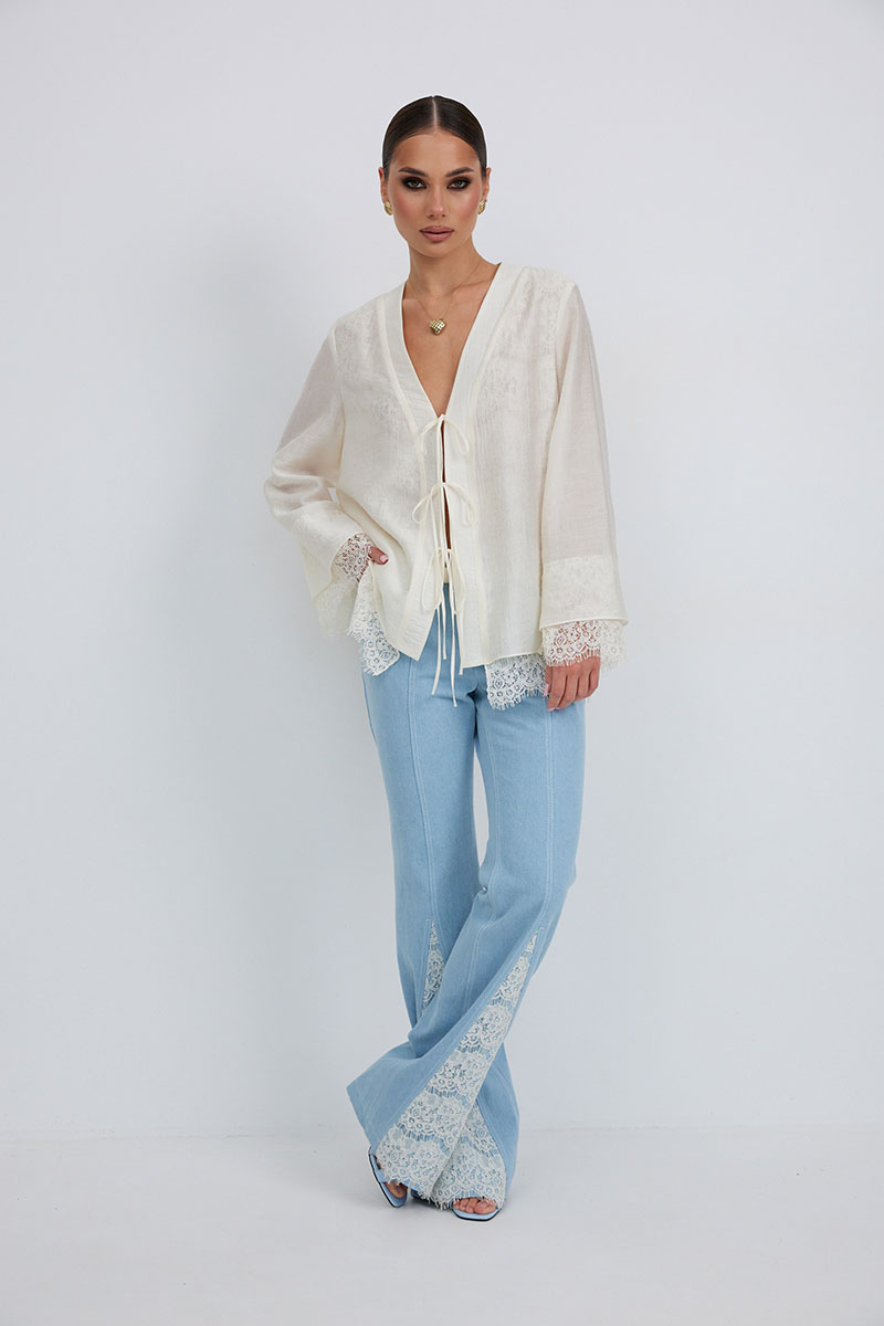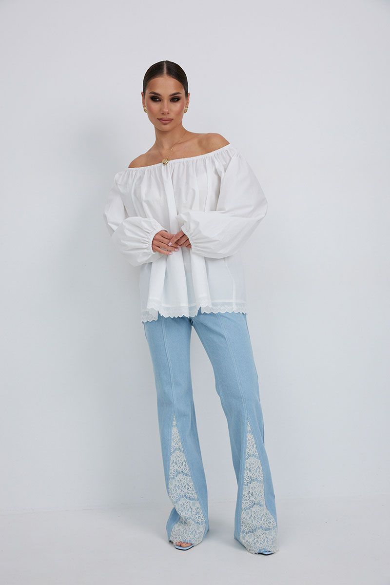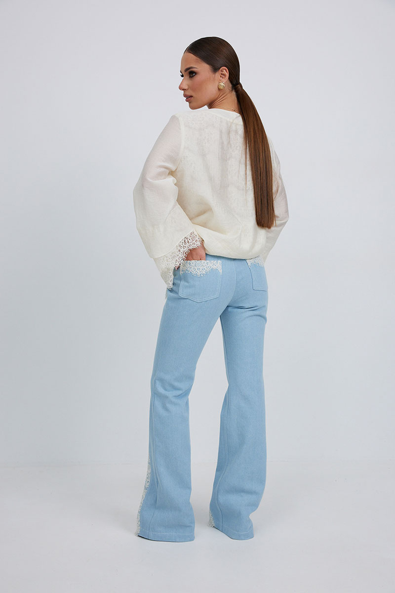 Брюки из джинса, прилегающего силуэта, слегка расклешенные к низу. Средняя посадка, пояс притачной, застежка спереди на молнию и пуговицу. По переду боковые карманы, вертикальные швы заканчиваются вставкой из кружева, сзади под кокеткой накладные карманы с кружевной отделкой.