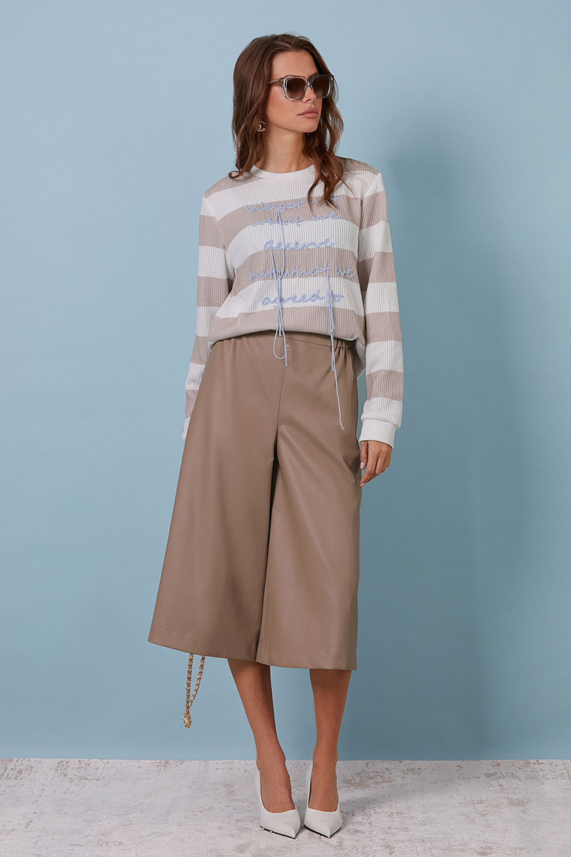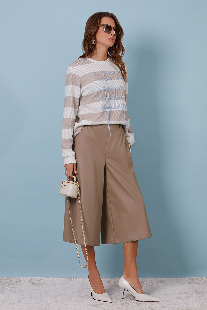 Кюлоты выполнены из премиальной эко-кожи на хлопковой основе. Длина ниже колена. Изделие без застежки. В боковых швах карманы. В пояс частично вставлена резинка. Сзади прорезные карманы(обманки) с листочками.