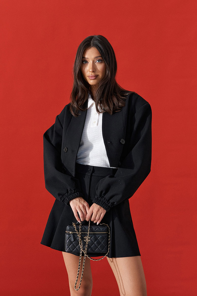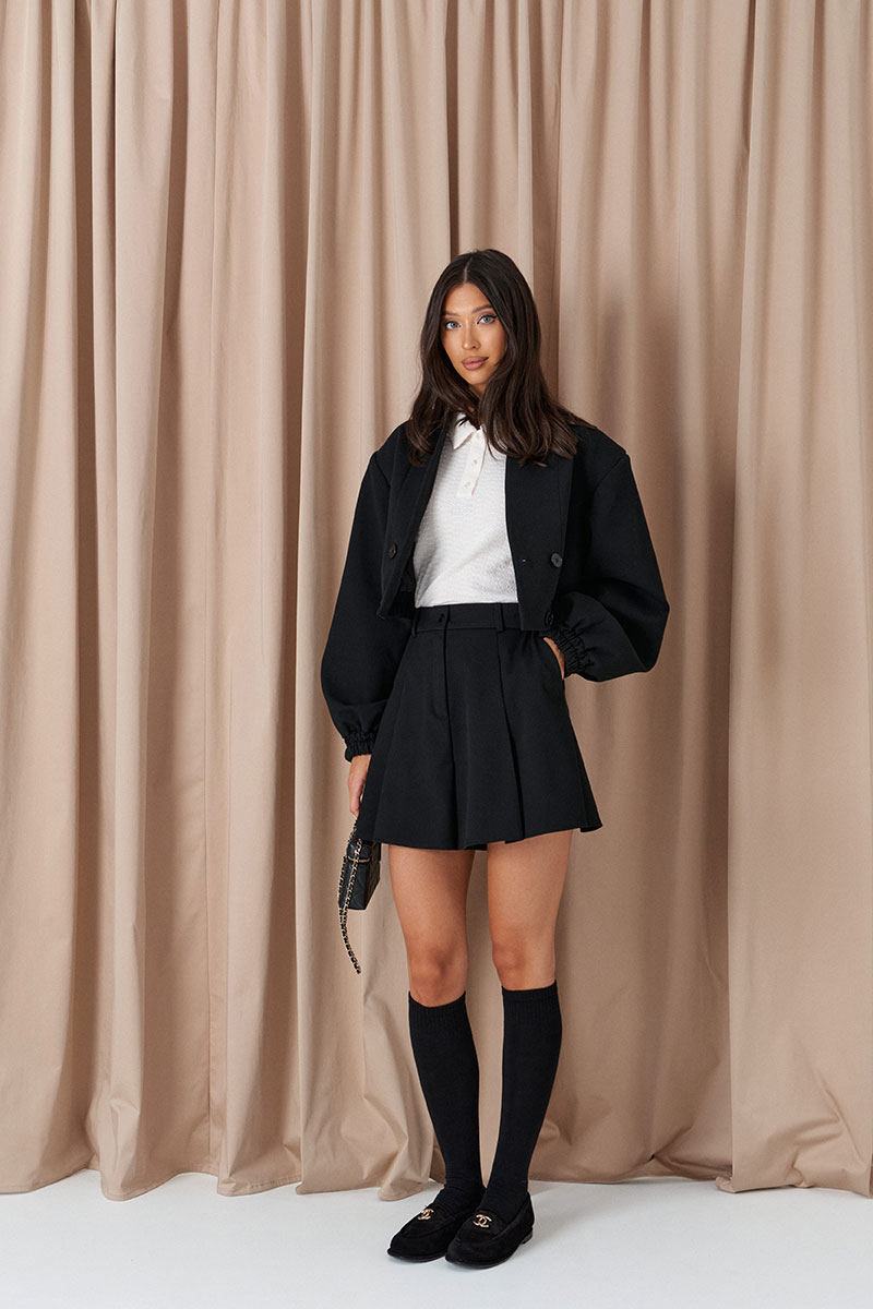 Шорты-трапеция выполнены из костюмной ткани черного цвета. Харектеристики: силуэт трапеция, ткань плотная с минимальным начесом, пояс стабильный с шлевками, застежка на молнии и петле-пуговице, складки, в боковых швах карманы.