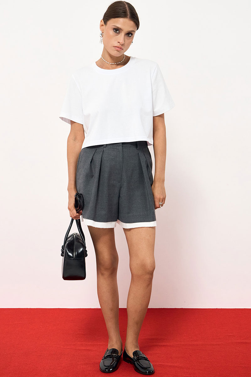Шорты прямого кроя, по переду складки, переходящие в стрелки, по бокам функциональные карманы, по низу съемная декоративная оборка.