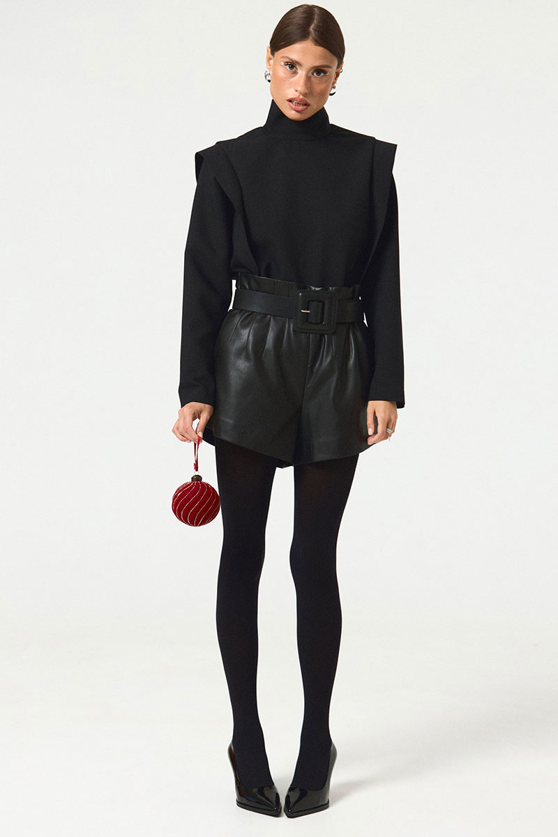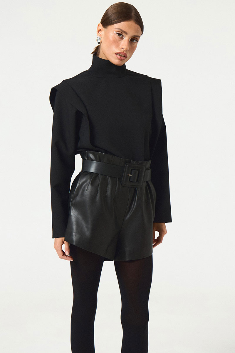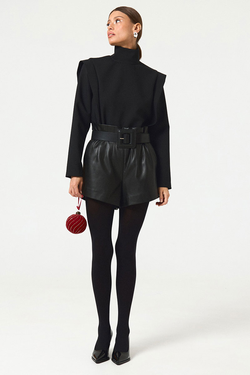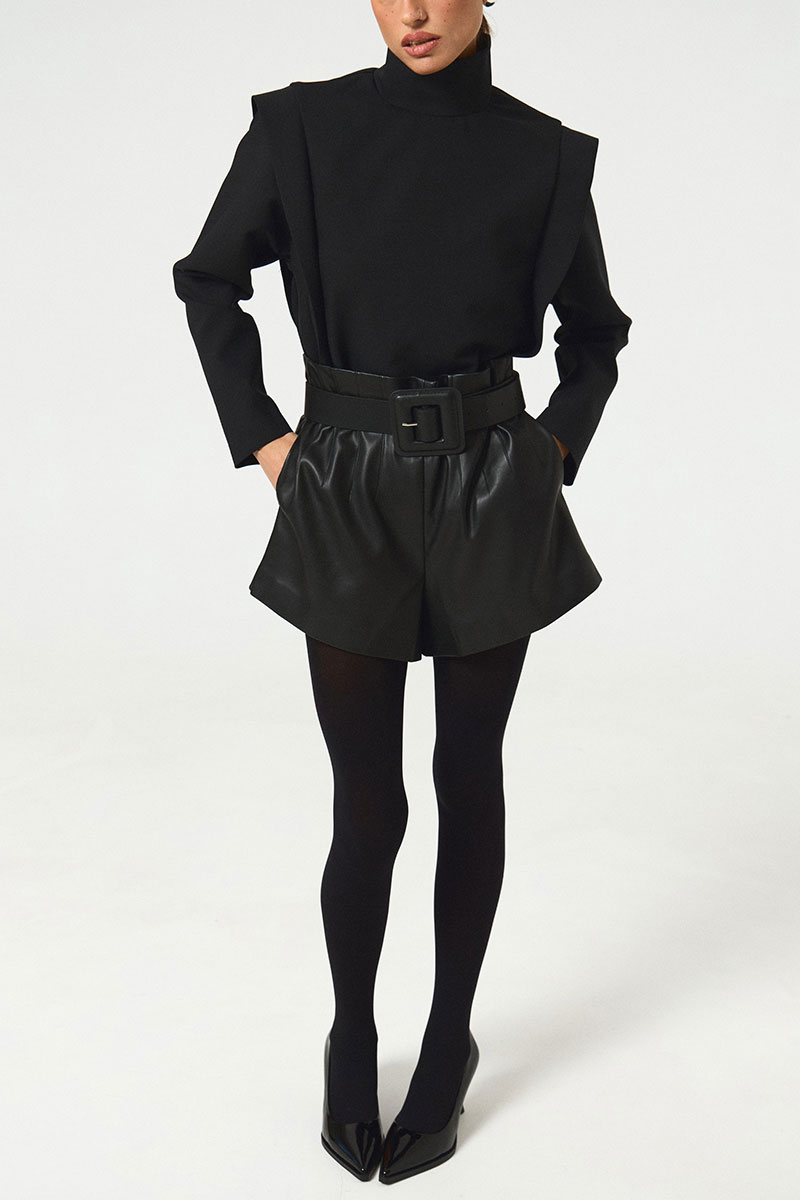 Шорты в длине мини из экокожи. Посадка высокая, по талии декоративные выточки, потайная молния по спинке изделия. Длина по спинке 42.