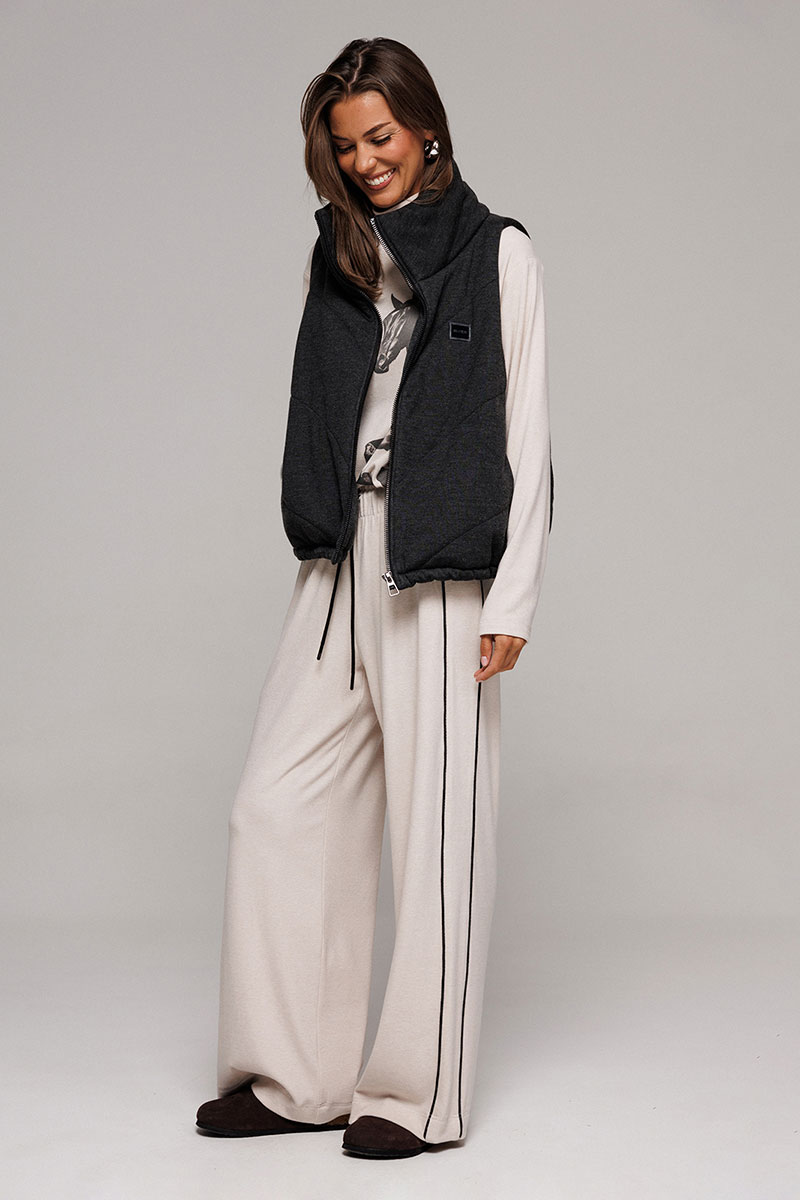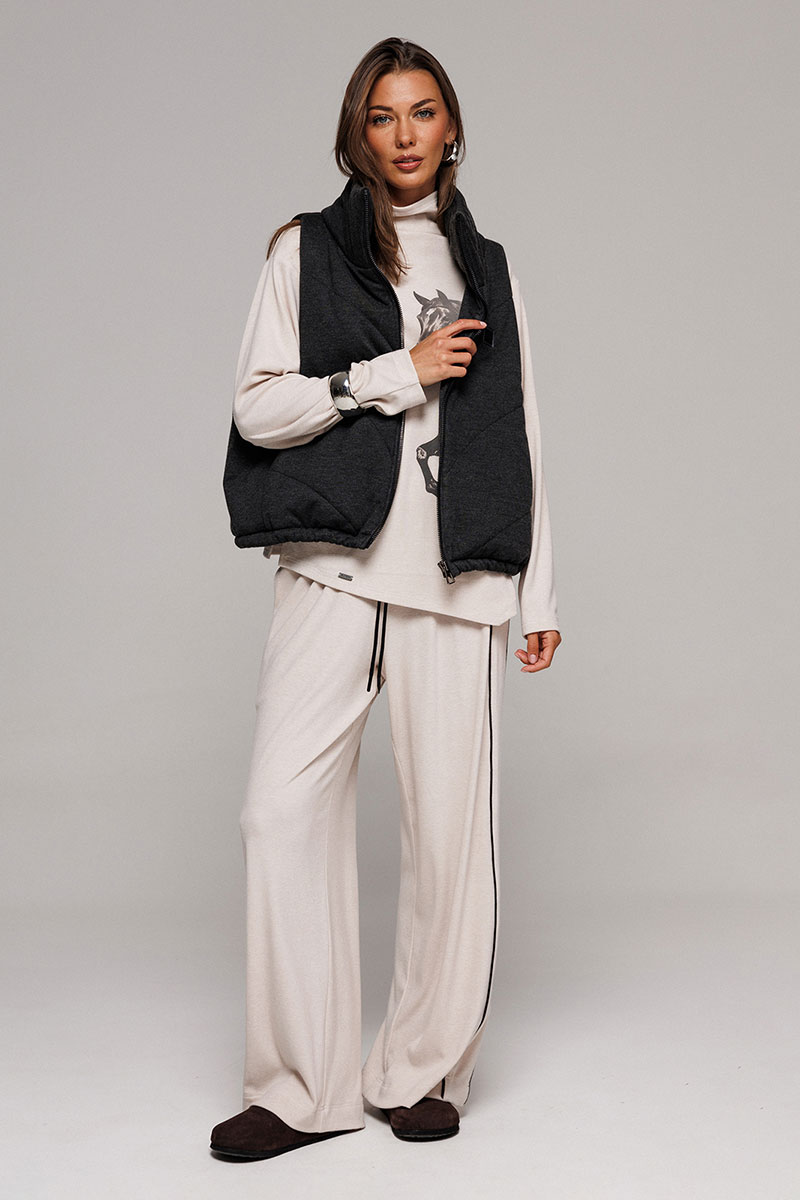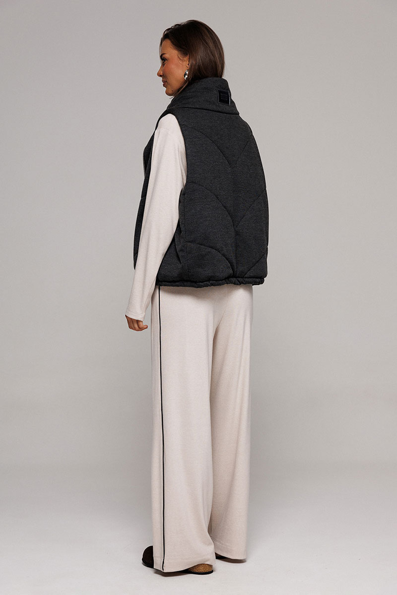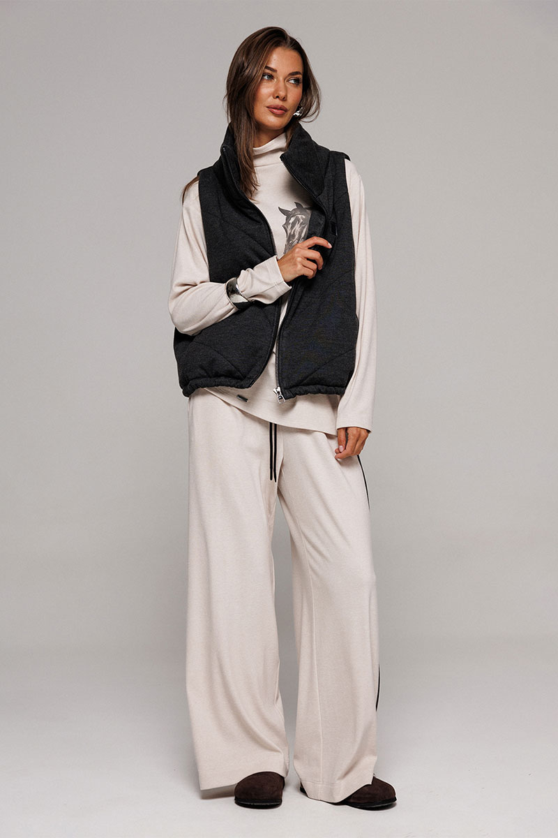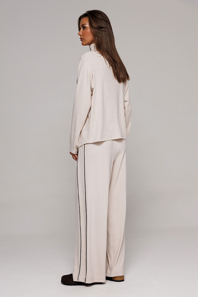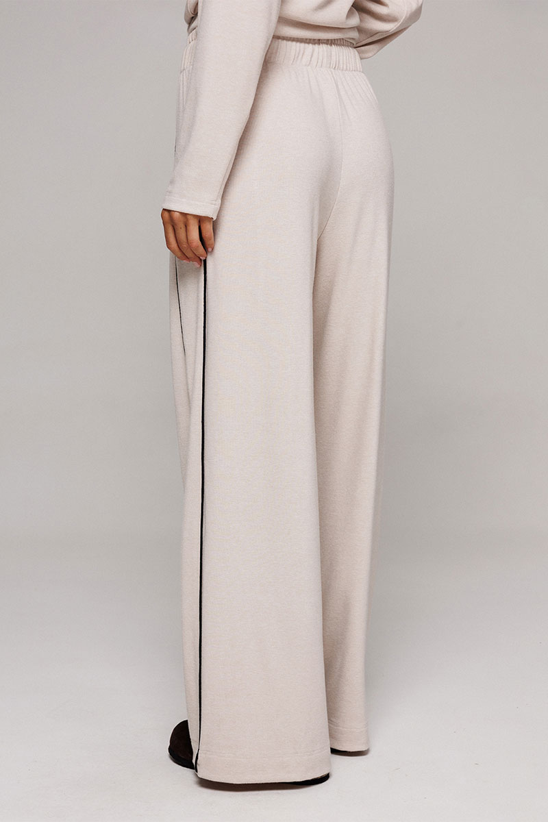 Брюки из трикотажного полотна прямого силуэта на цельнокроеном отстроченном поясе со вставленной в него резинкой и декоративным шнурком. Справа отрезной бочок с кантом, слева в боковом шве карман.