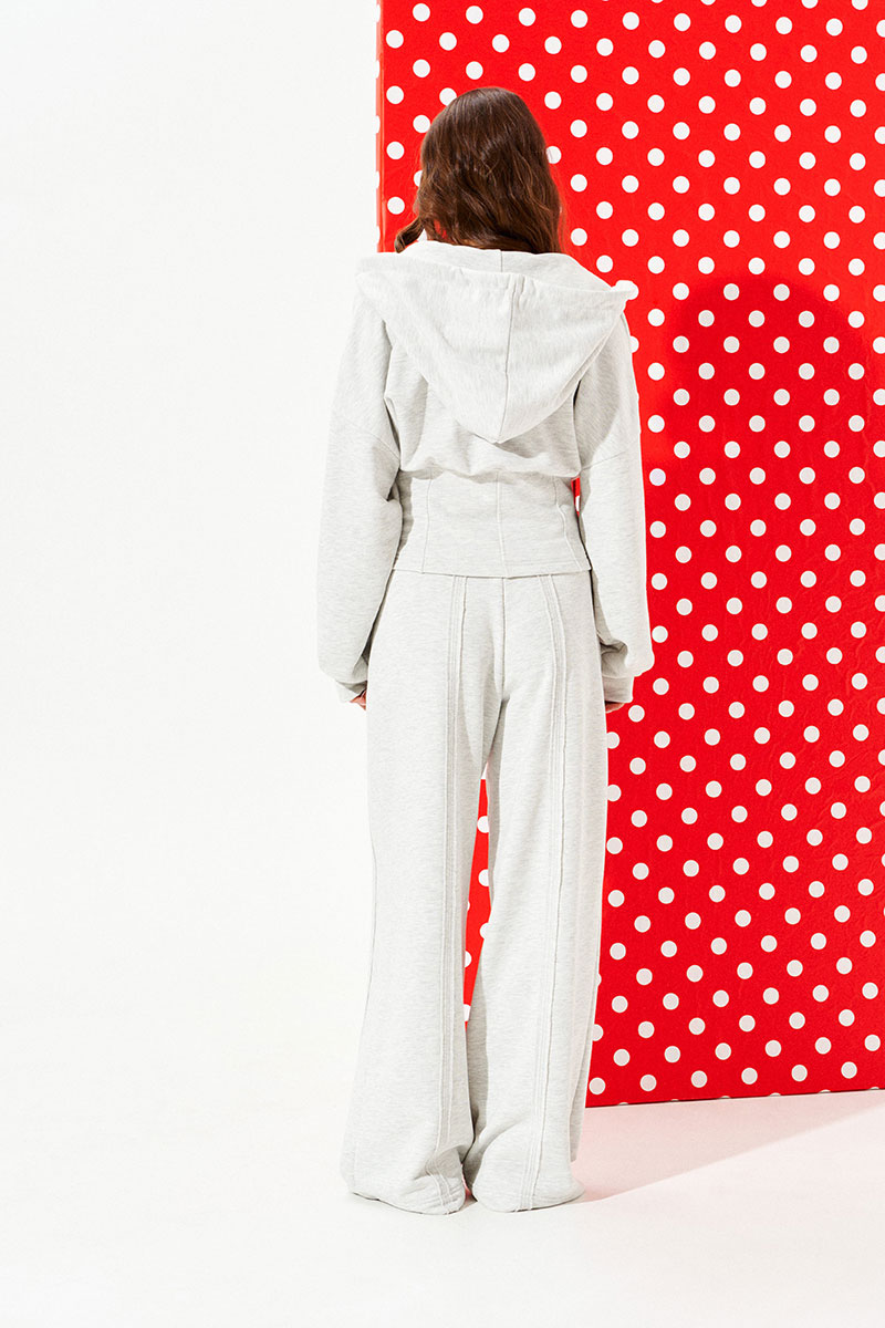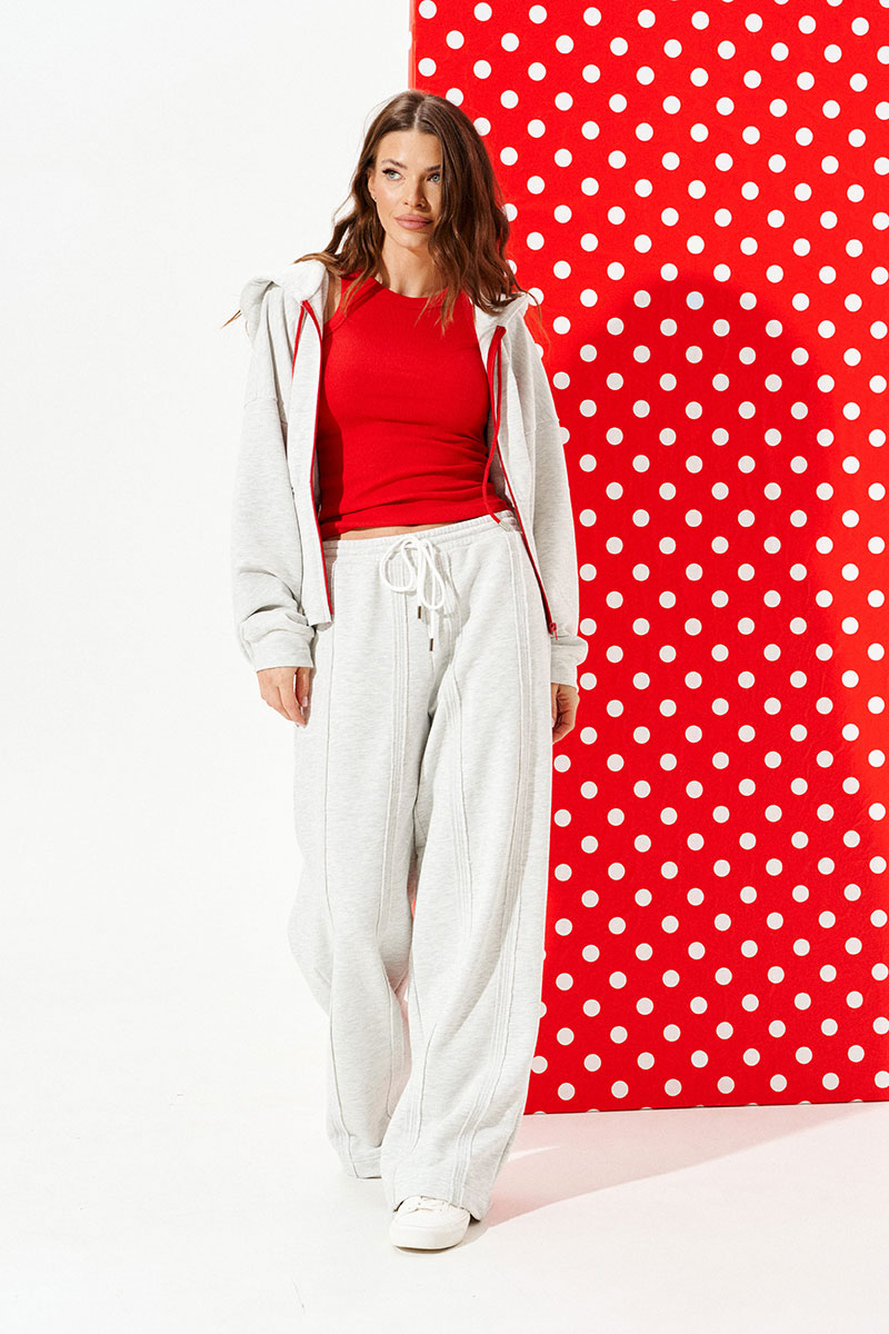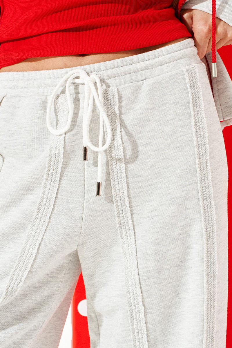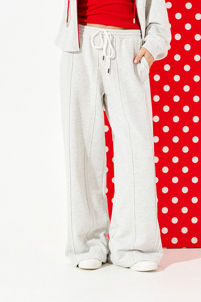 Брюки из трикотажного полотна свободного объема, прямого силуэта. Пояс притачной на резинке с отделочными строчками, образующими кулиску, в которую продет декоративный шнур-завязка с наконечниками. Детали переда и спинки с вертикальными швами вразутюжку с необработанными краями. В боковых швах расположены карманы.
