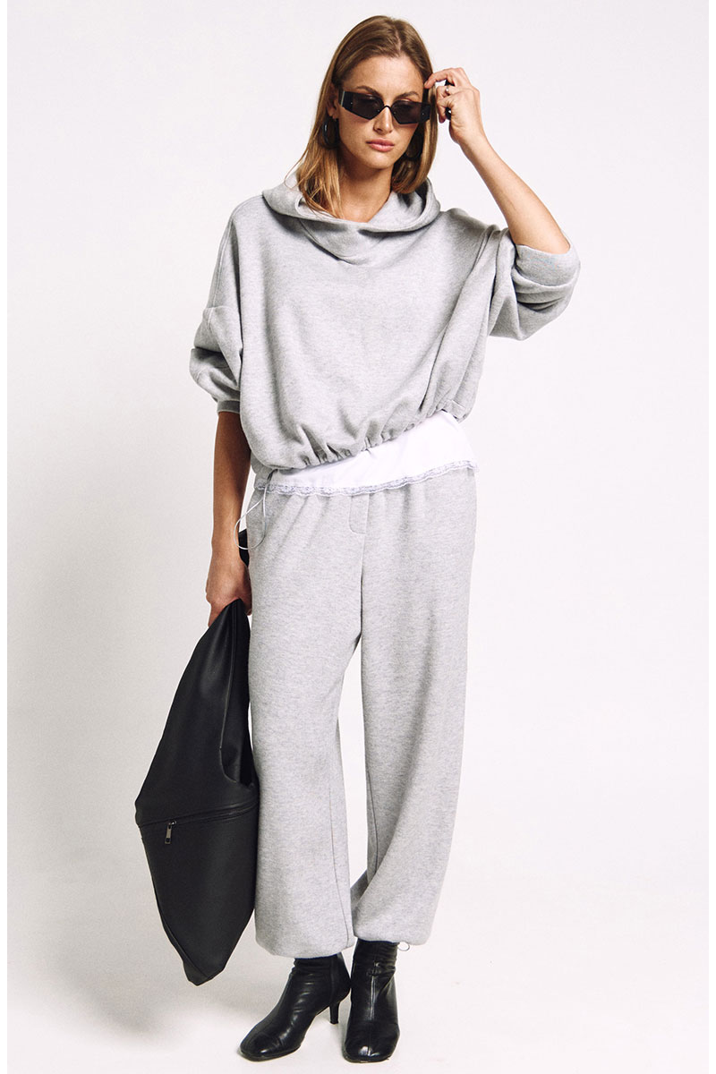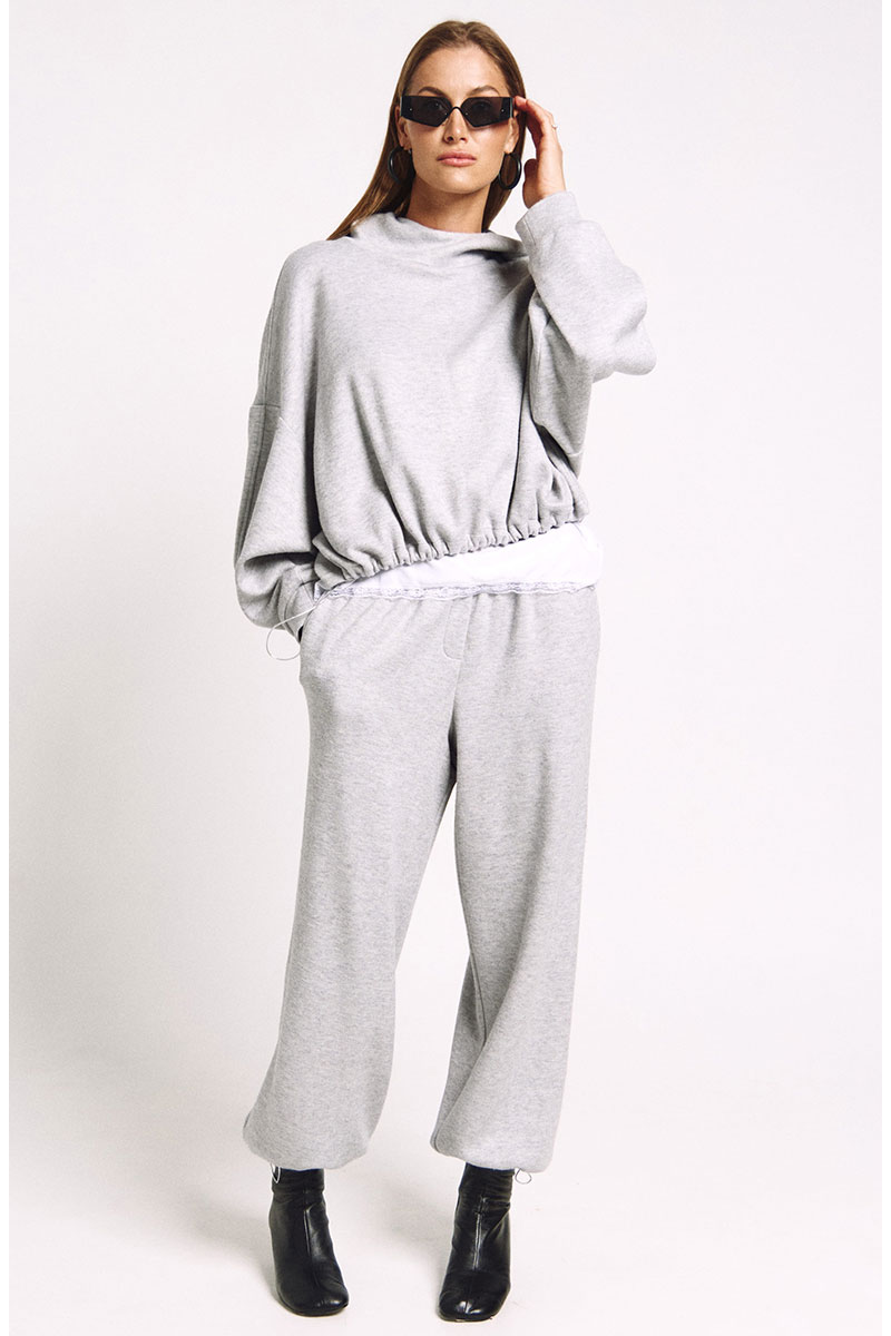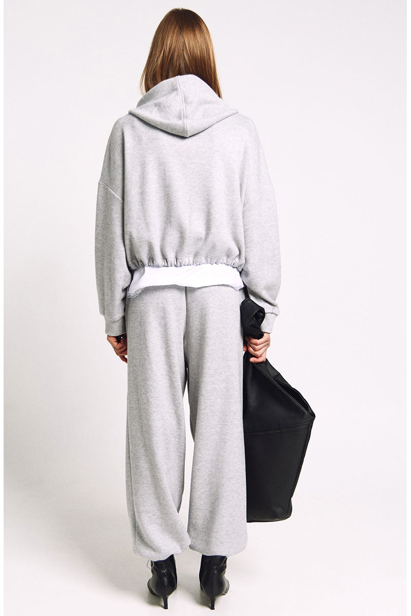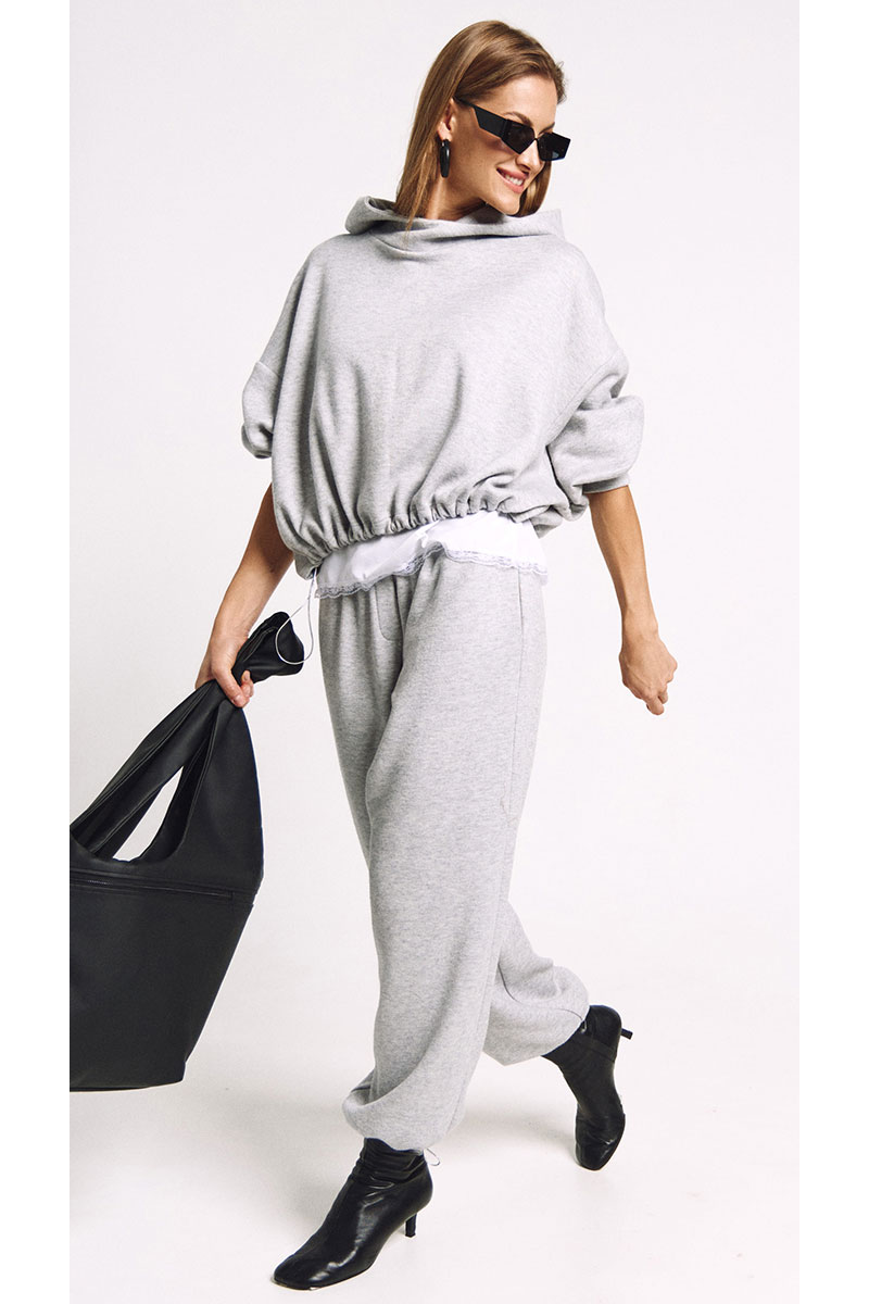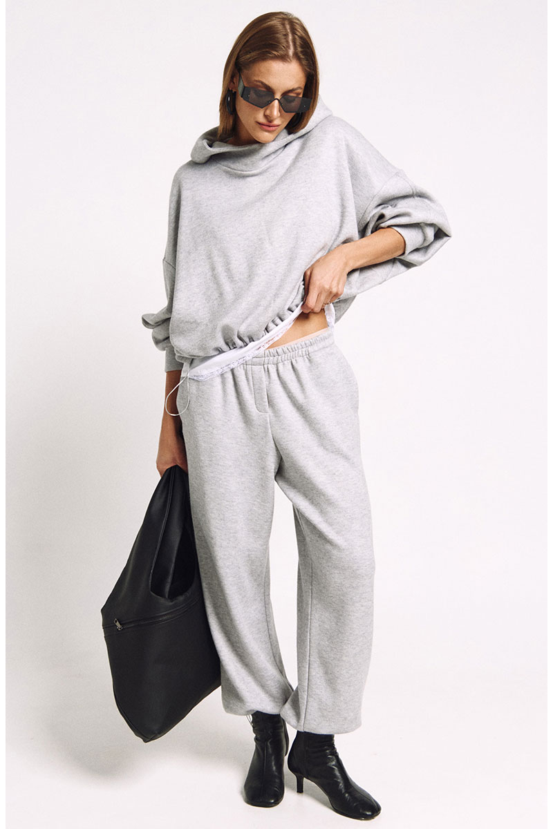 Джоггеры из мягкого трикотажа, в классическом сером. Джоггеры умеренного объема. По низу ширина регулируется металлизированной резинкой и фиксаторами.