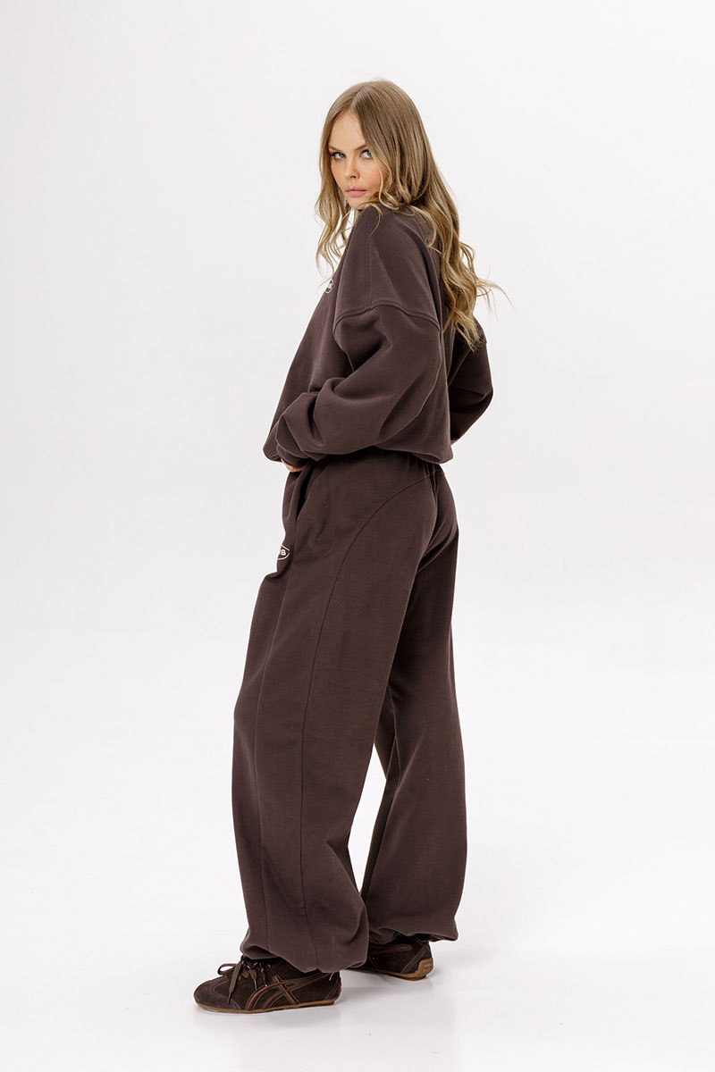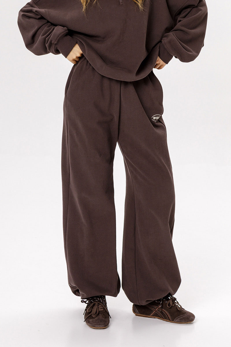 Детали: брюки широкие с рельефными швами и регулировкой по низу, боковые карманы. На передней части нанесен небольшой фирменный логотип.