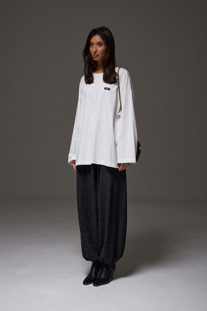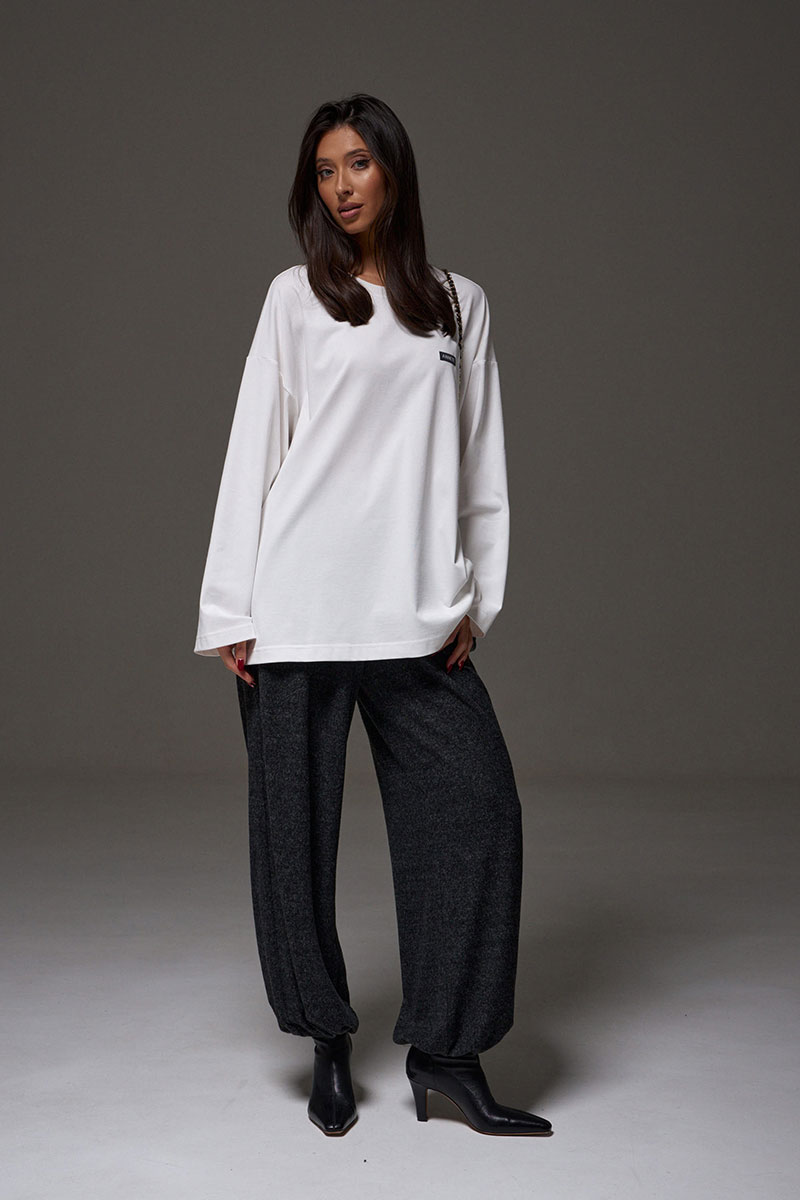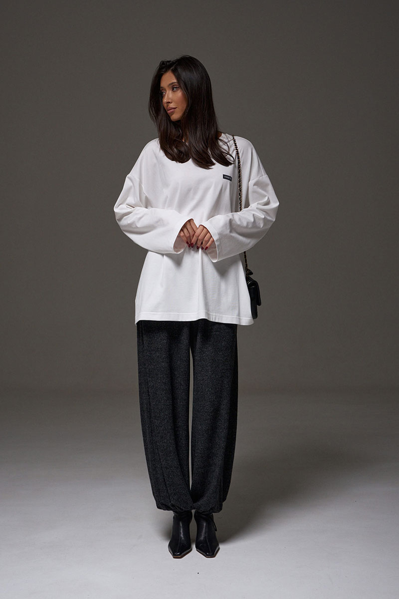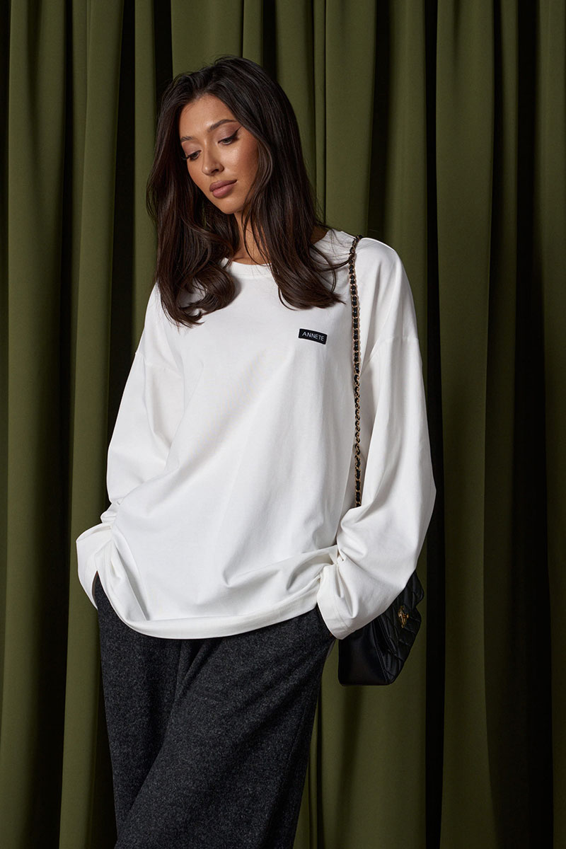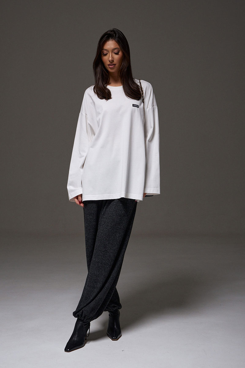 Джемпер прямого свободного кроя, выполнен из трикотажного полотна белого цвета. Характеристики: прямой крой, овальный вырез горловины, спинка цельнокроеная, по переду брендированная нашивка. Рукав длинный спущен.