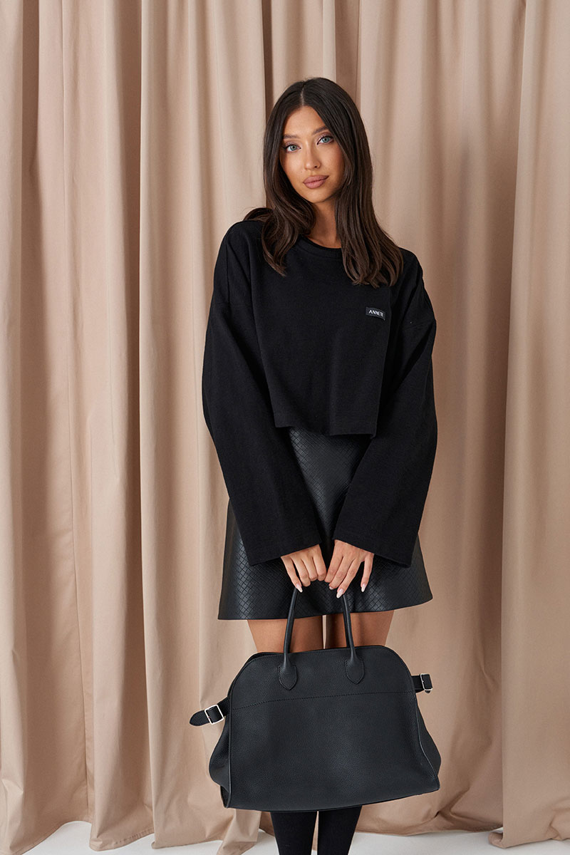 Джемпер прямого свободного кроя,выполнен из трикотажного полотна черного цвета. Характеристики: прямой крой, овальный вырез горловины, спинка цельнокроеная, по переду брендированная нашивка, рукав спущен.