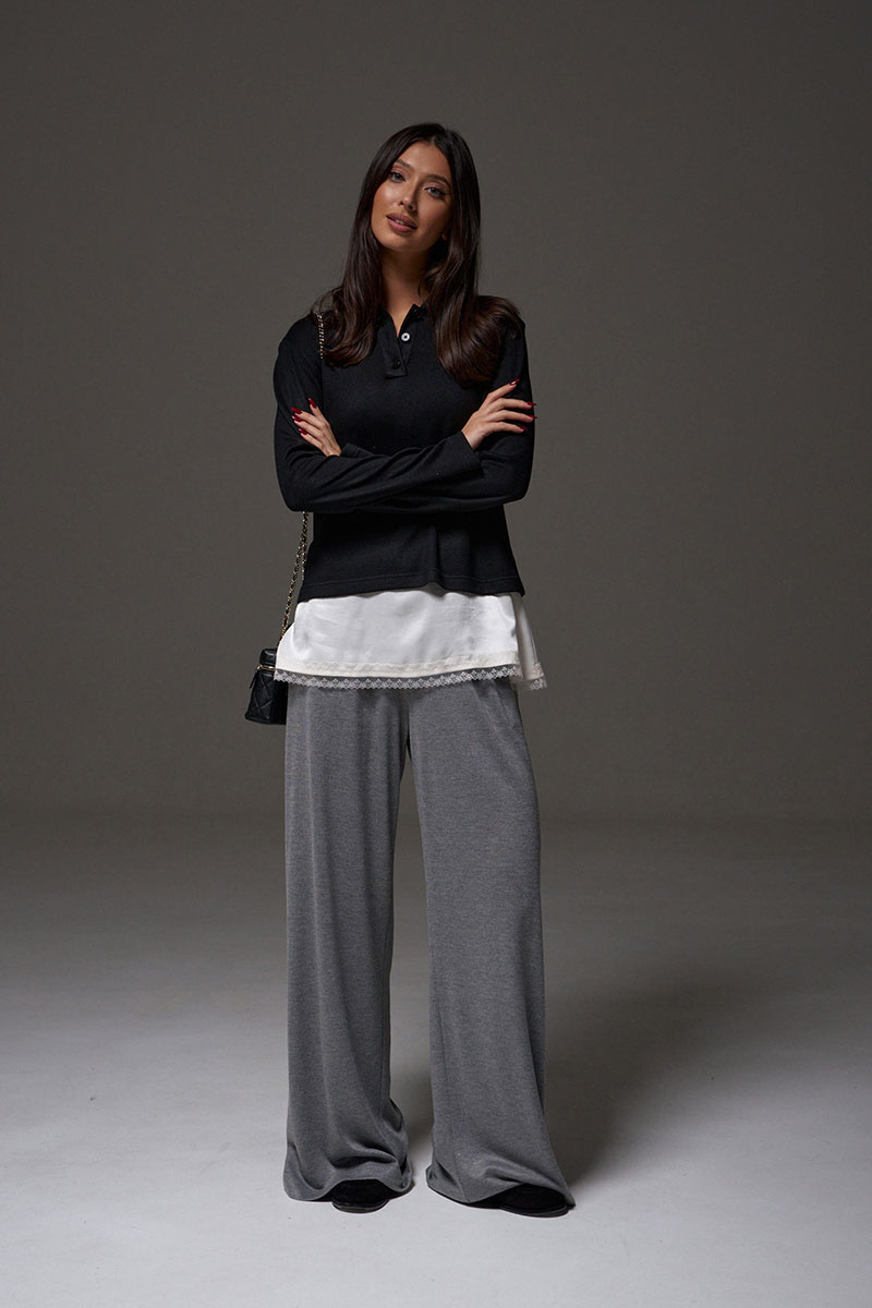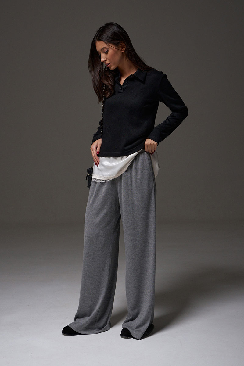 Джемпер прямого кроя. Выполнен из мягкого трикотажного полотна. Отложной воротник. В области горловины застежка на планке на петли пуговички. Рукав втачной.