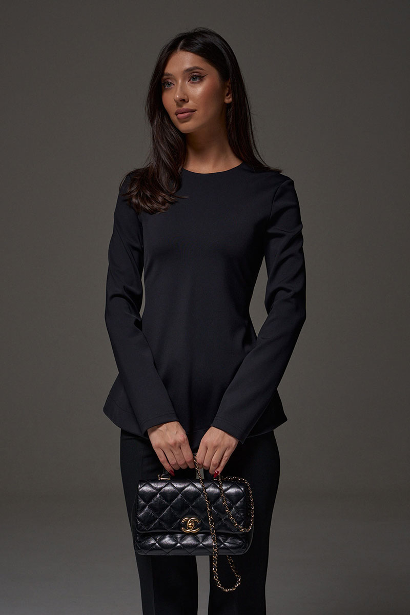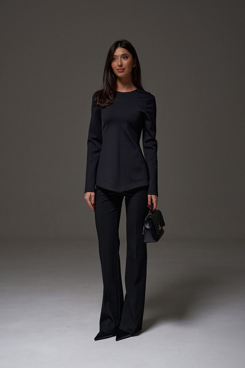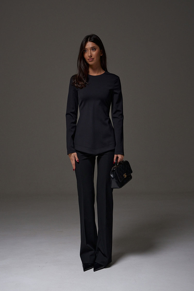 Джемпер приталеного кроя выполнен из полотна ткани черного цвета. Характеристики: плотная ткань водолаз, приталеный крой, овальный вырез горловины, рукав втачной, прямой, на спине потайная молния.