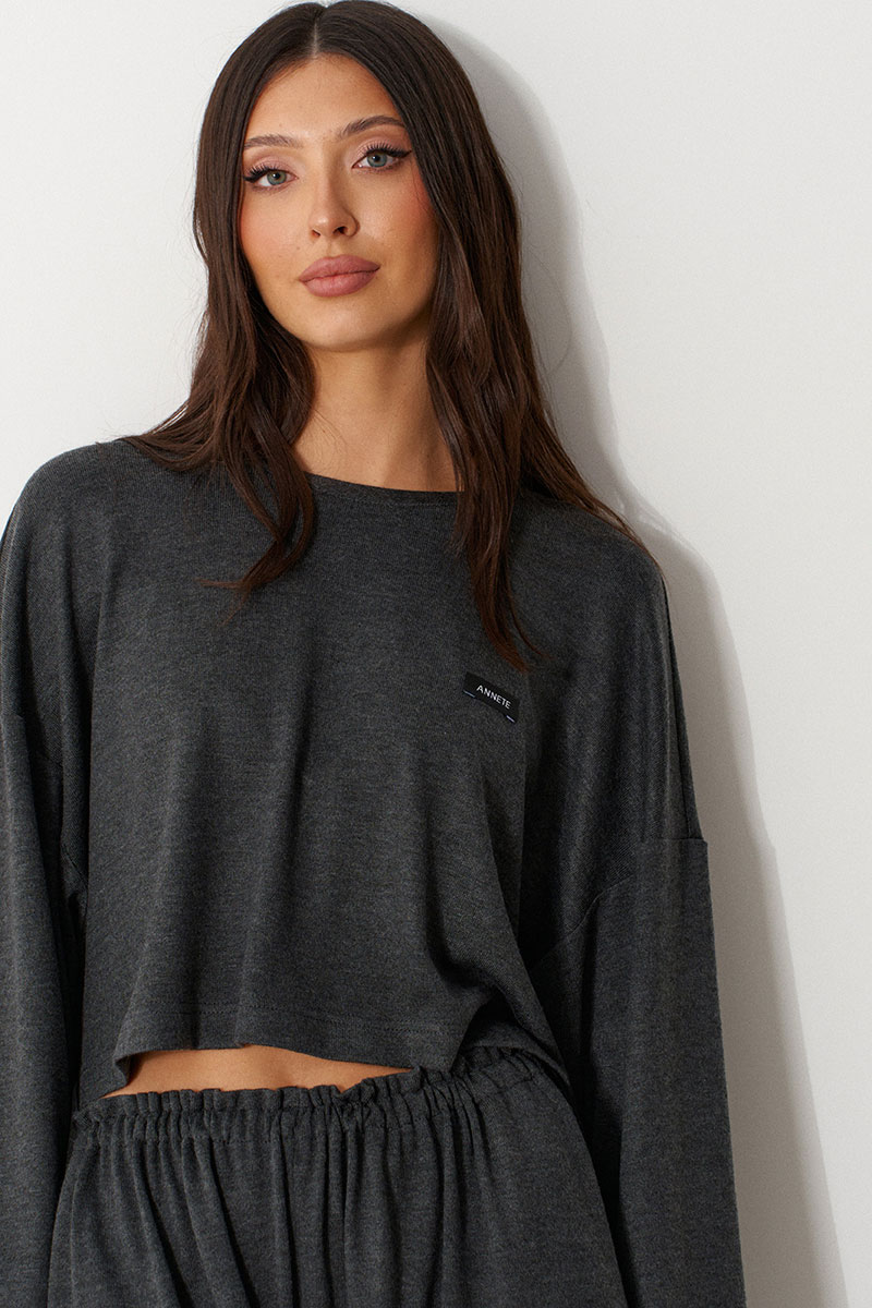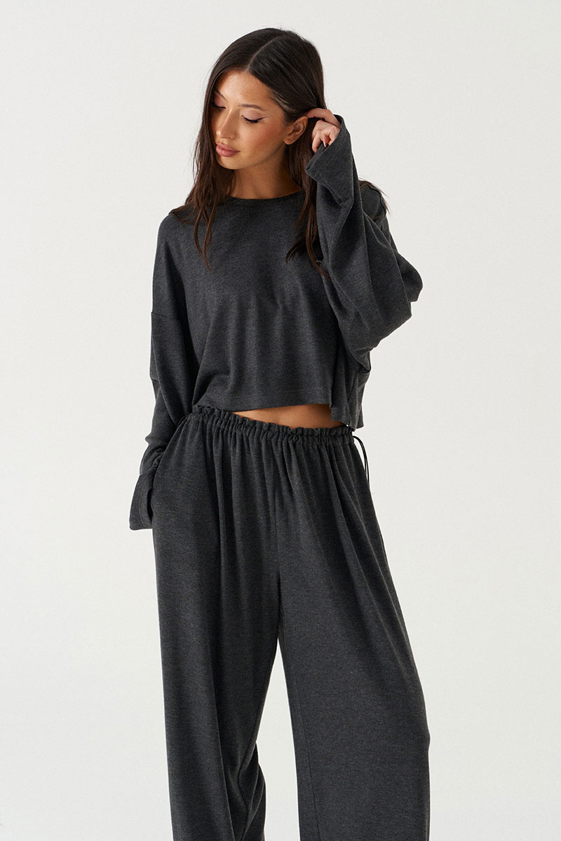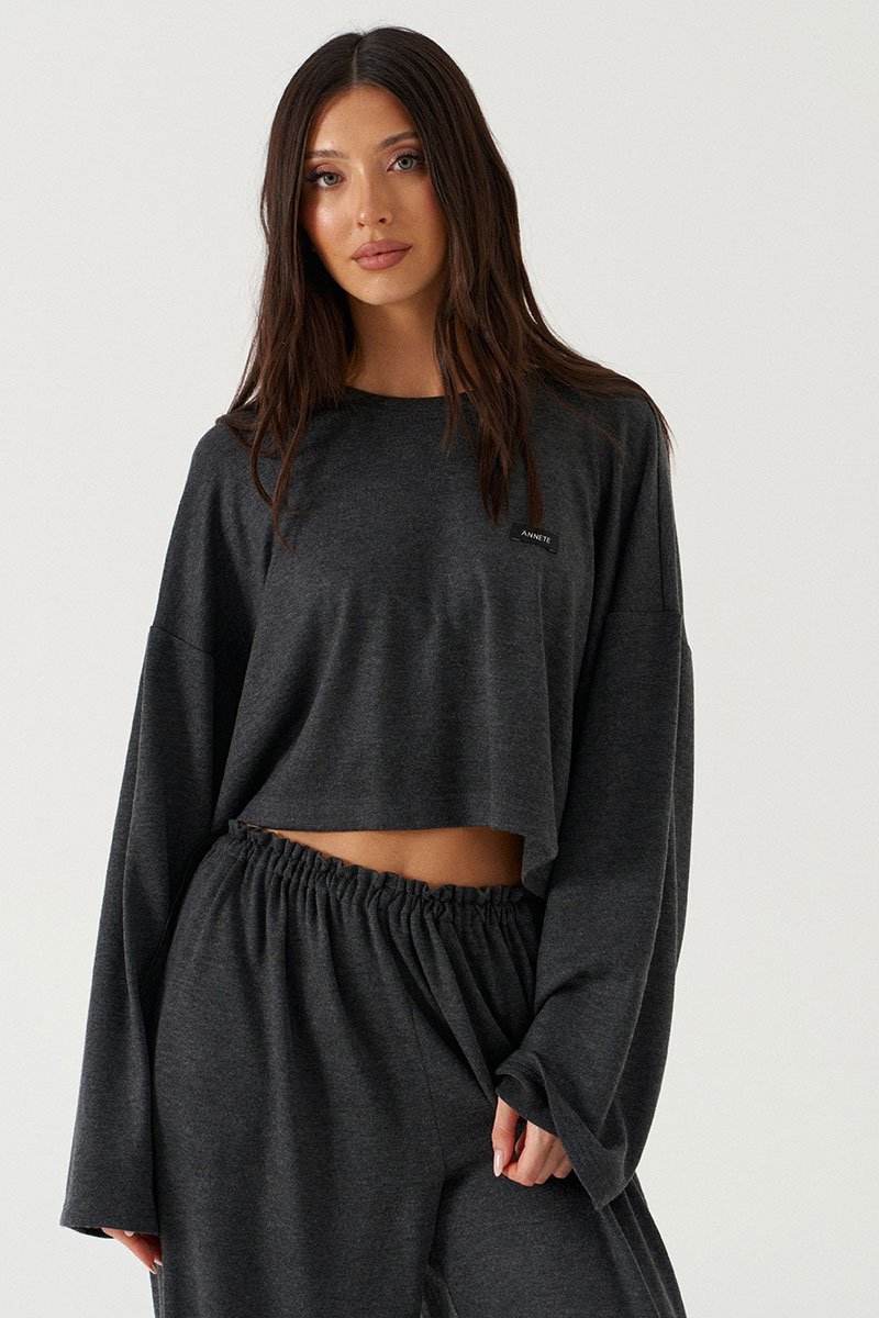 Джемпер прямого силуэта, укороченный, широкий. Выполнен из трикотажного полотна в графитовом оттенке. Характеристика: горловина круглая обработана притачной планкой. На полочке брендированная нашивка. Спинка цельнокроеная. Рукав одношовный, втачной. Низ рукава и джемпера обработан на распошивальной (плоскошовной) машине.