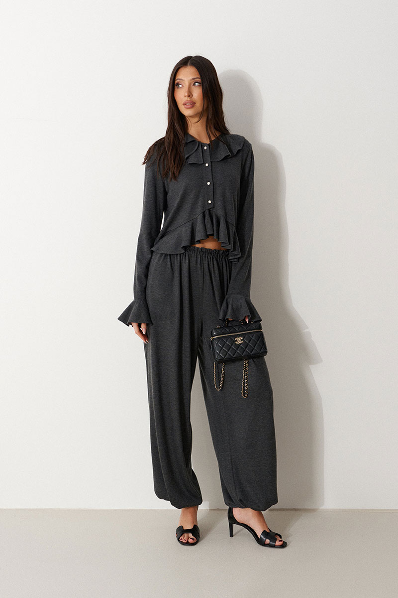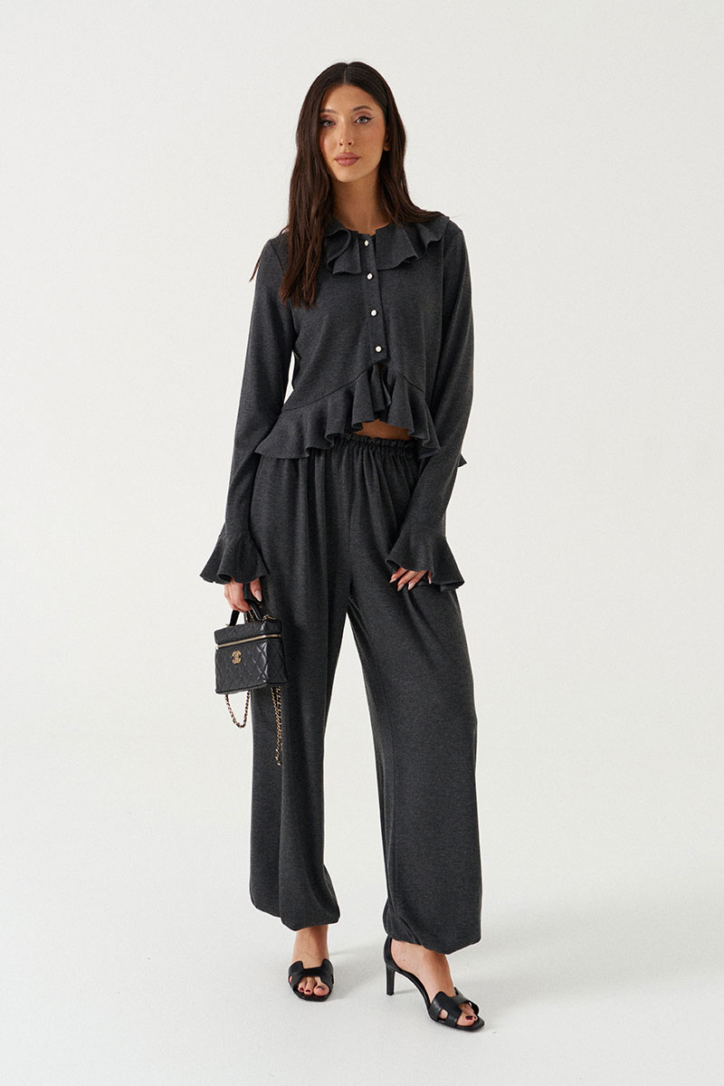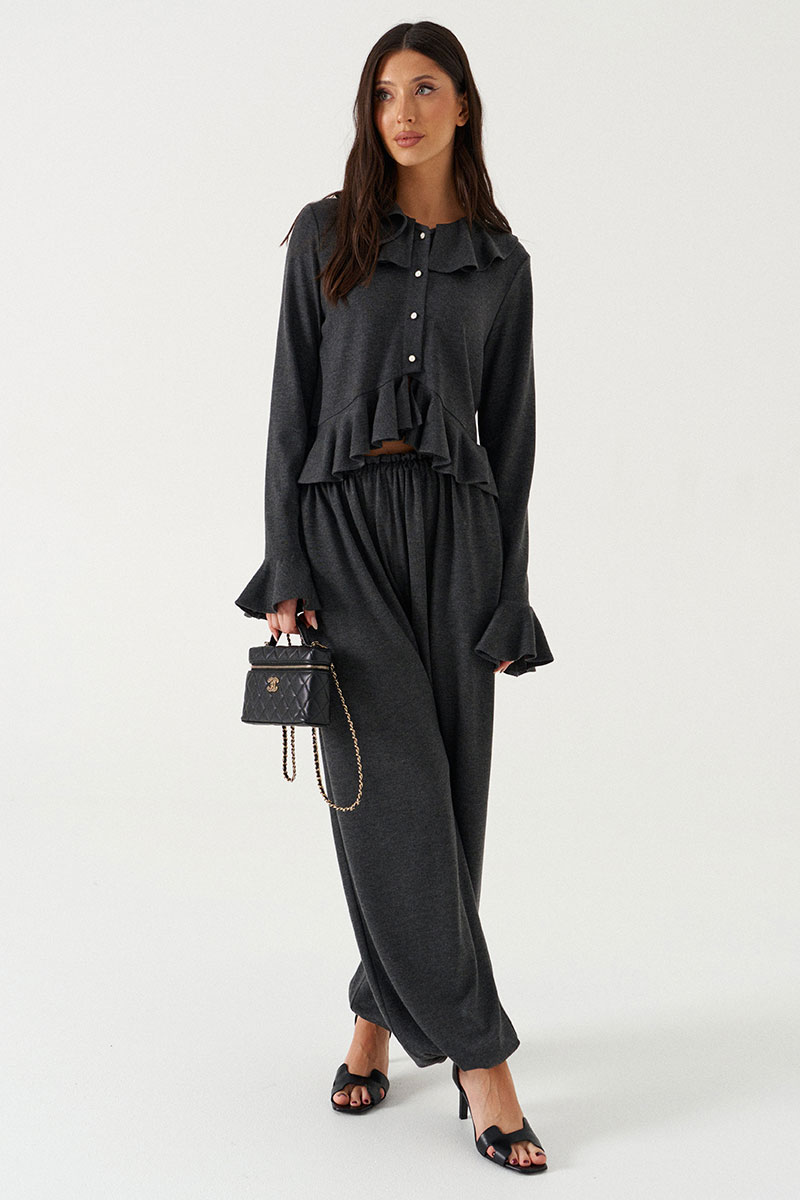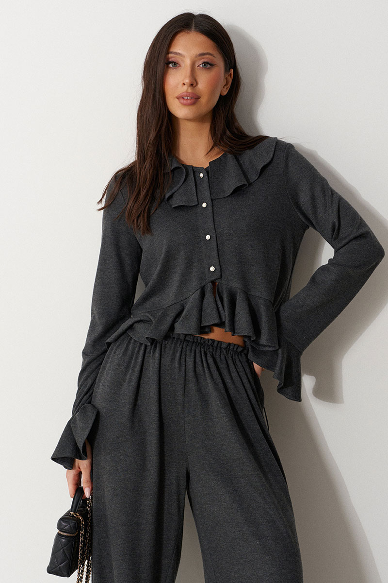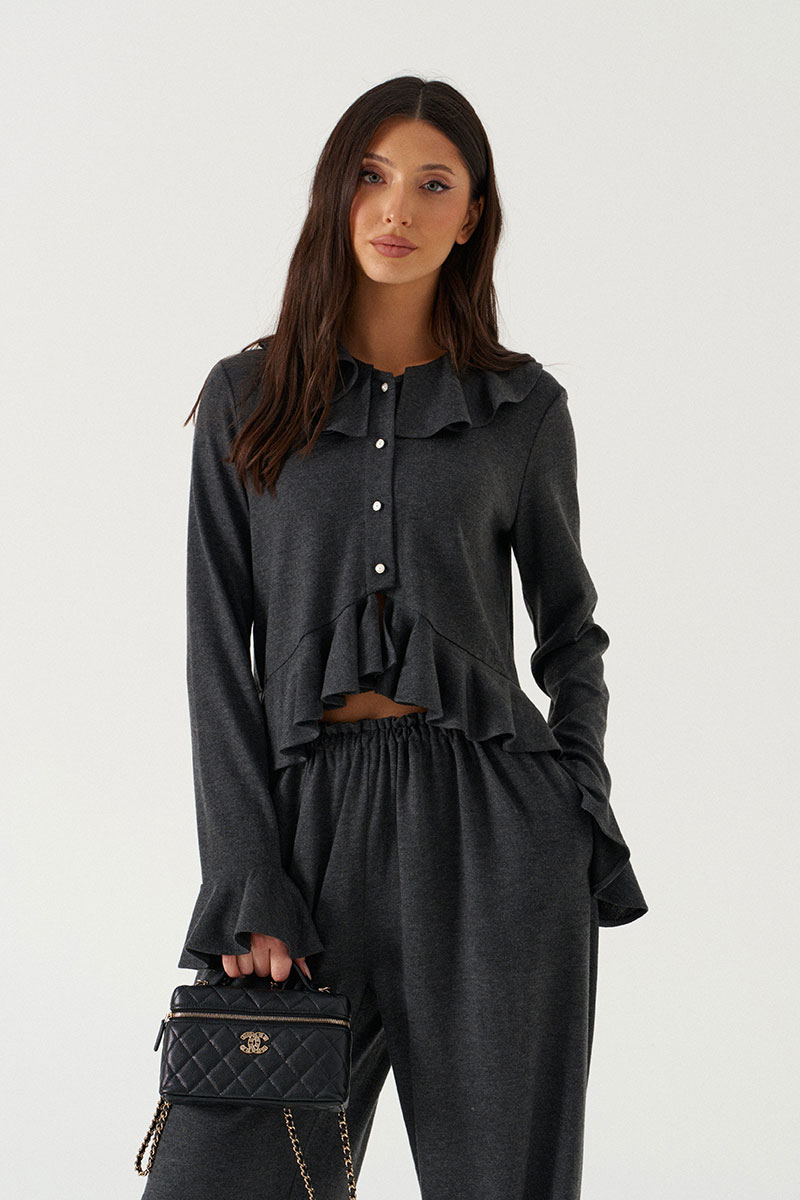 Джемпер прямого силуэта с воланом по низу. Выполнен из трикотажного полотна в графитовом оттенке. Характеристика: вырез горловины круглый, с воланом по всей окружности. Рукав одношовный, втачной. По низу притачана манжета в виде волана. Застежка центральная, по цельнокроенной планке на пробивные петли и пришивные пуговицы.