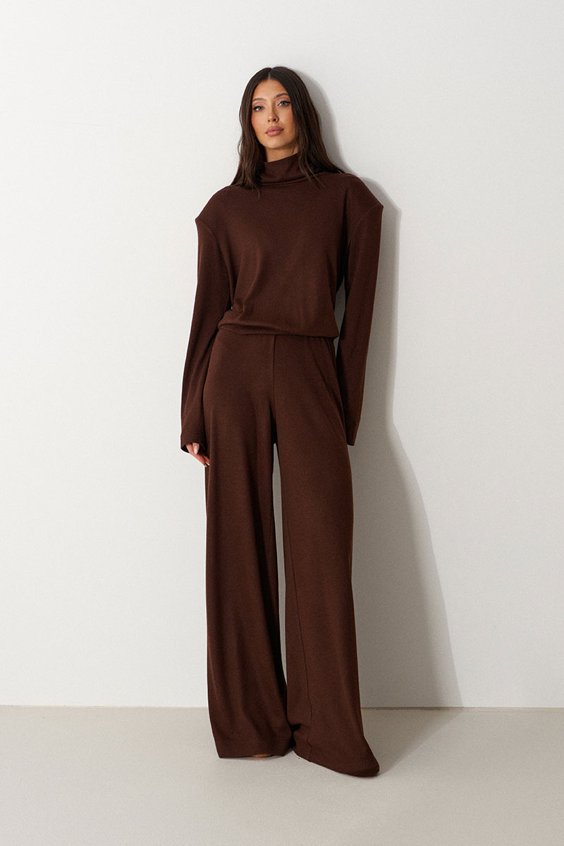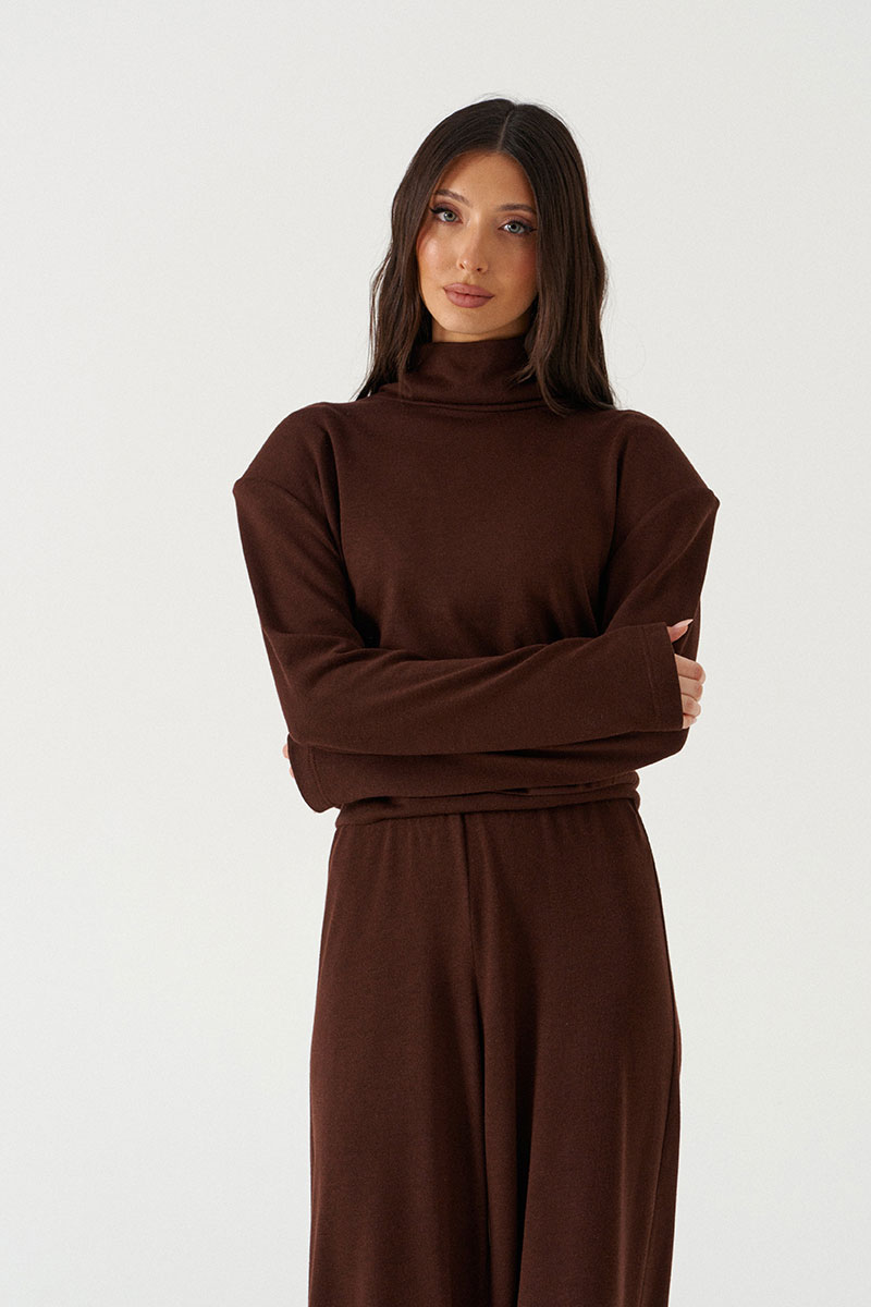Джемпер укороченный прямого свободного кроя. Выполнен из мягкого трикотажа коричневого цвета. Горловина-стойка, в естественную складку. Есть подплечники (съёмные).