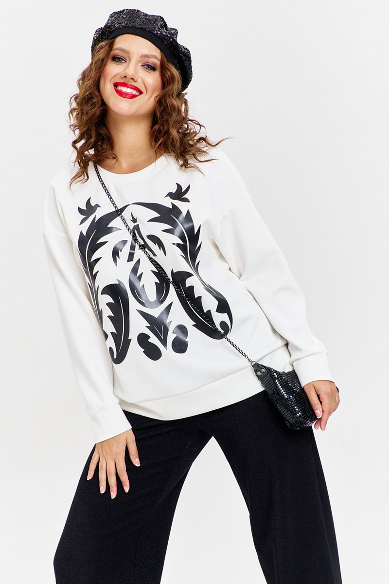 Свитшот из мягкого и пластичного трикотажа "дюпон", свободного силуэта, с круглой горловиной, длинным рукавом и спущенной линией плеча. Низ изделия и рукавов с притачными манжетами. Изделие декорировано авторским принтом и нашивкой.