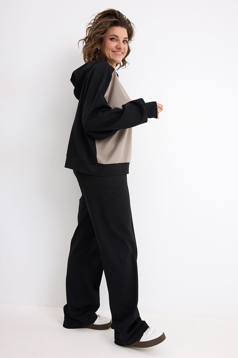 Перед выполнен из ткани контрастного цвета. В районе горловины декорирован термонаклейкой. Рукав реглан, на манжете.