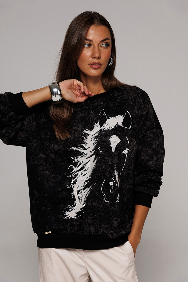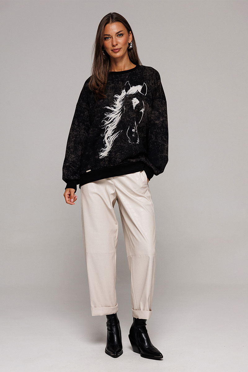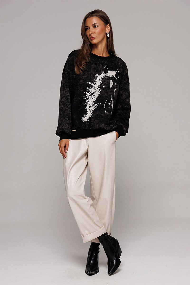 Джемпер из трикотажного полотна свободного силуэта, слегка заужен к низу, с втачным рукавом и спущенной линией плеча, с манжетой из отделочной ткани по низу рукава. По переду печать "HORSE" и нашивка с гравировкой "BUTER", низ фигурный. Спинка длиннее переда. По горловине и низу изделия притачная планка из довяза.