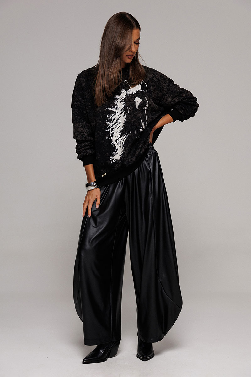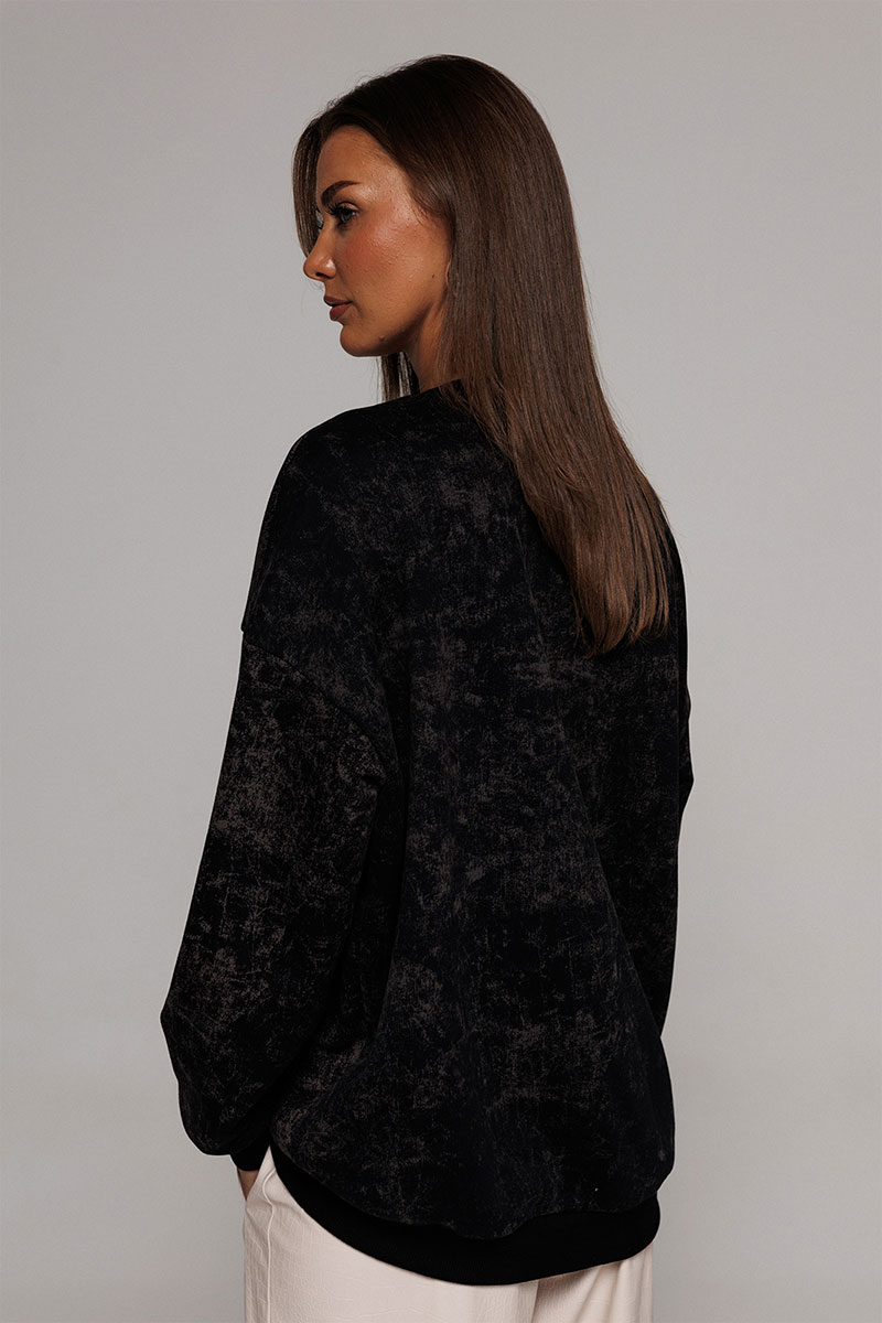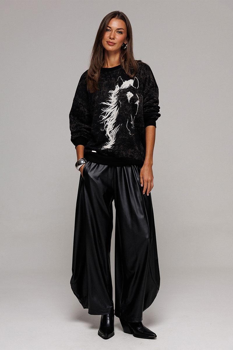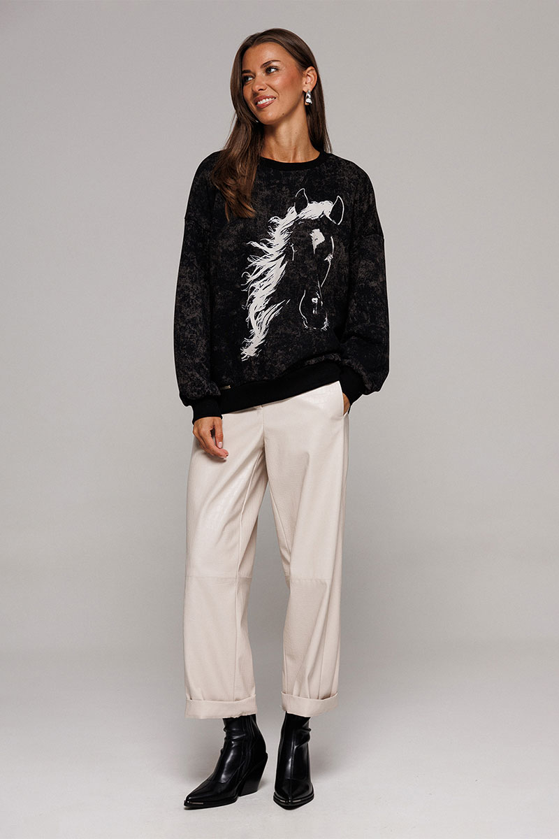 Джемпер из трикотажного полотна свободного силуэта, слегка заужен к низу, с втачным рукавом и спущенной линией плеча, с манжетой из отделочной ткани по низу рукава. По переду печать "HORSE" и нашивка с гравировкой "BUTER", низ фигурный. Спинка длиннее переда. По горловине и низу изделия притачная планка из довяза.