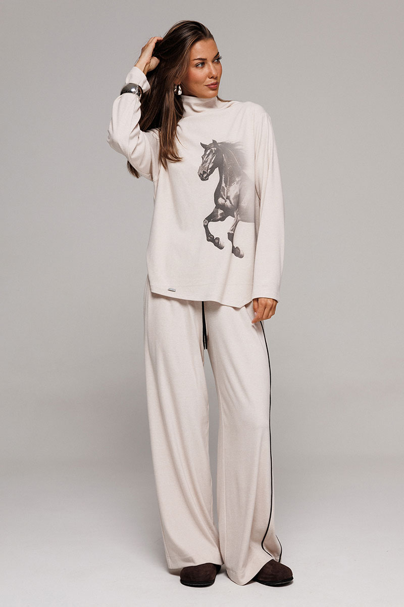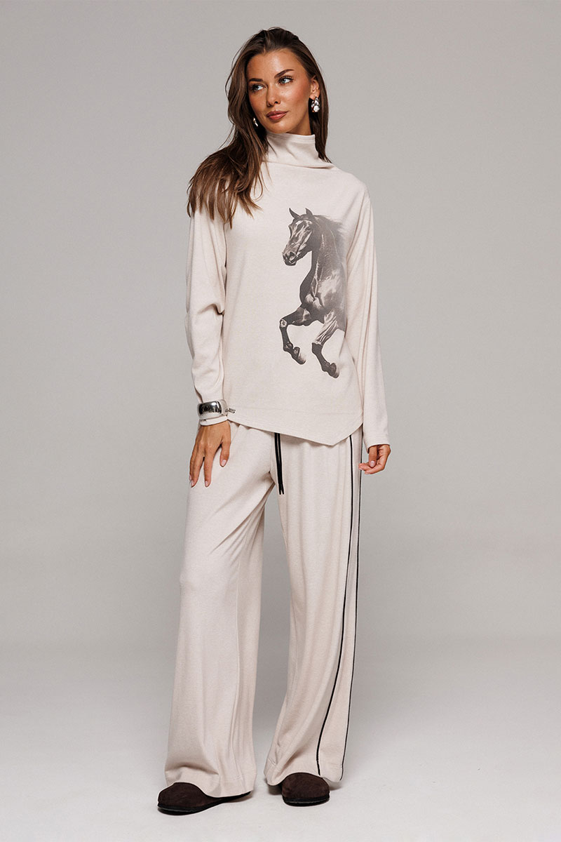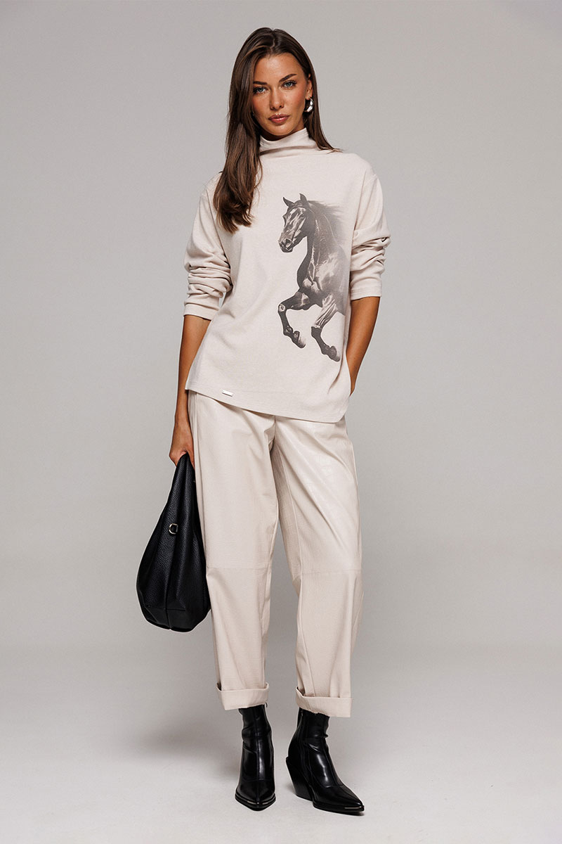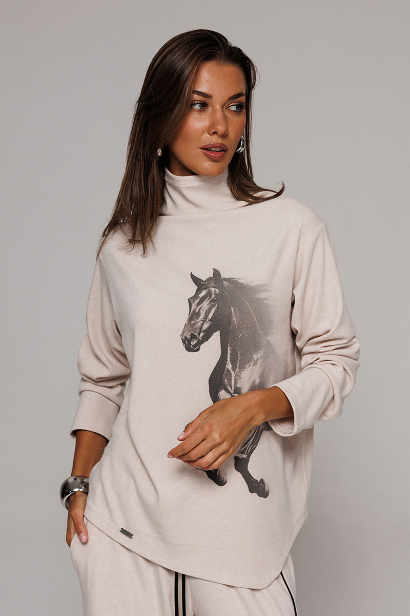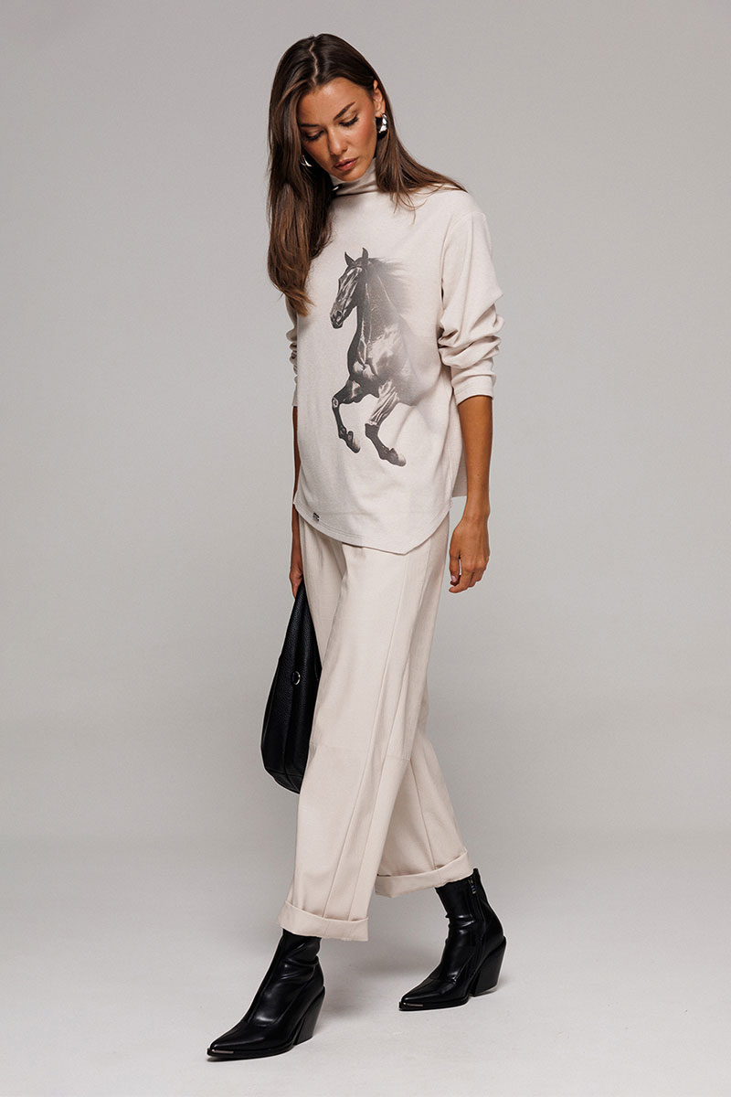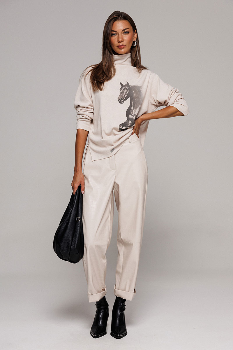 Джемпер из трикотажного полотна с велюровым эффектом прямого силуэта со спущенной линией плеча. Рукав втачной. По переду печать "Лошадь" и нашивка с гравировкой "BUTER". Низ джемпера по переду фигурный ассиметричный. Внизу по правому боковому шву обработан разрез. Воротник-стойка цельнокроеный.