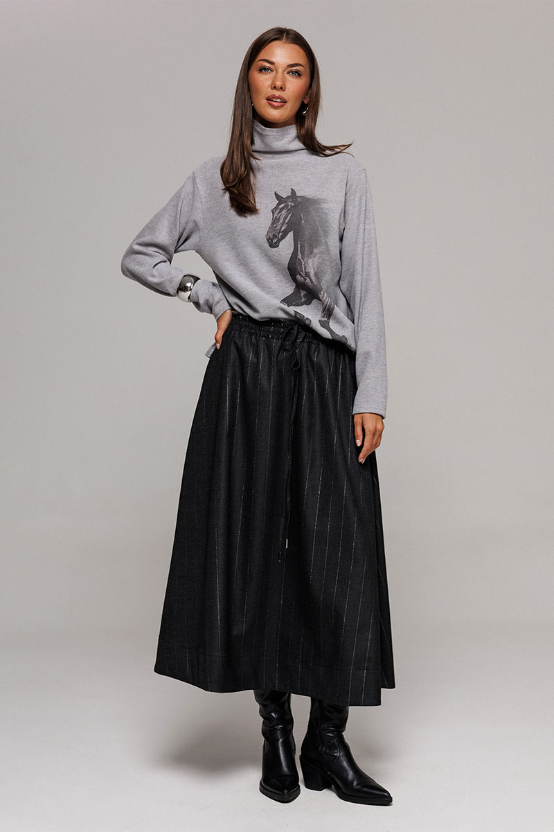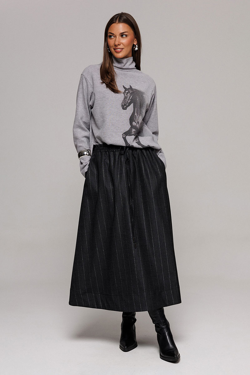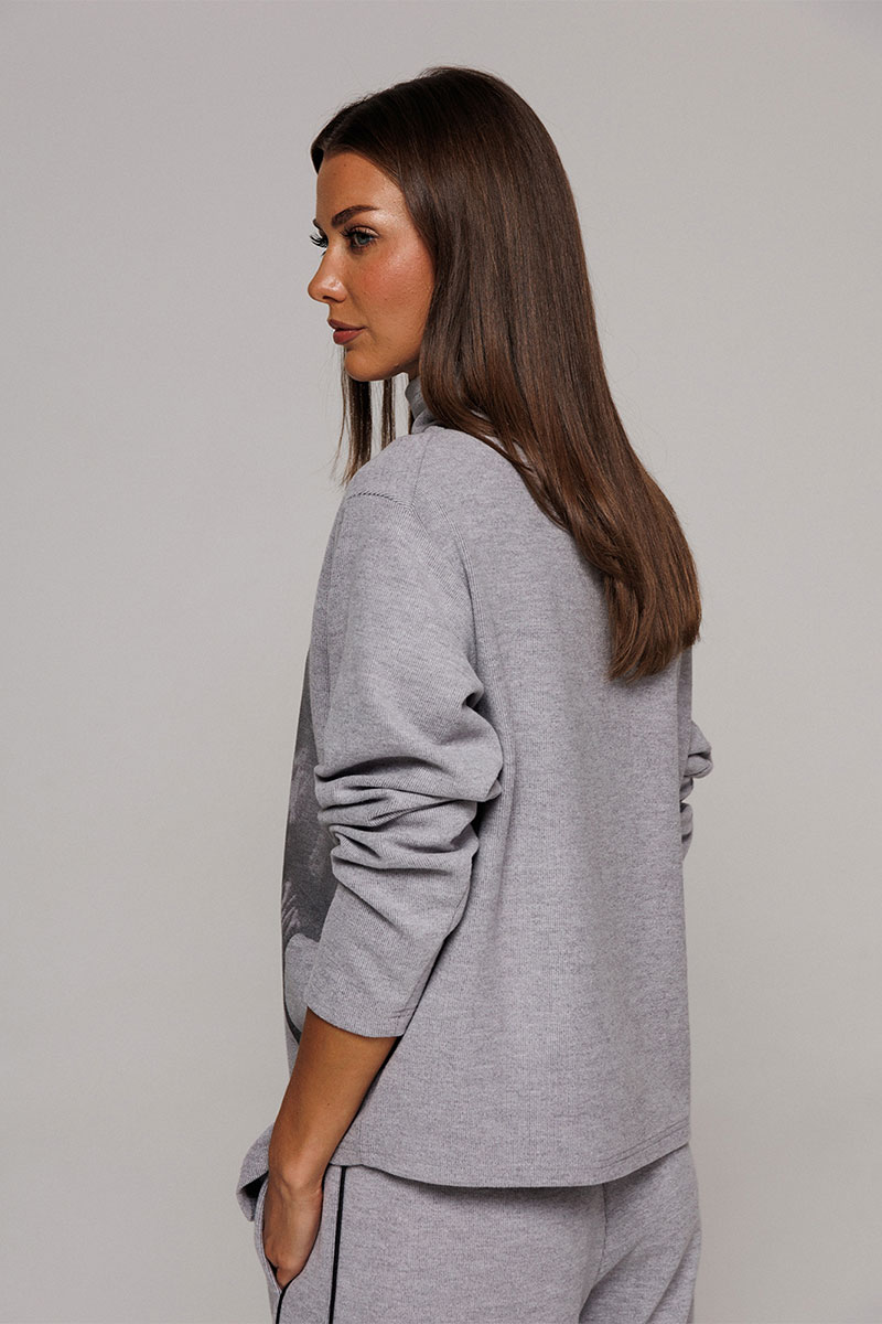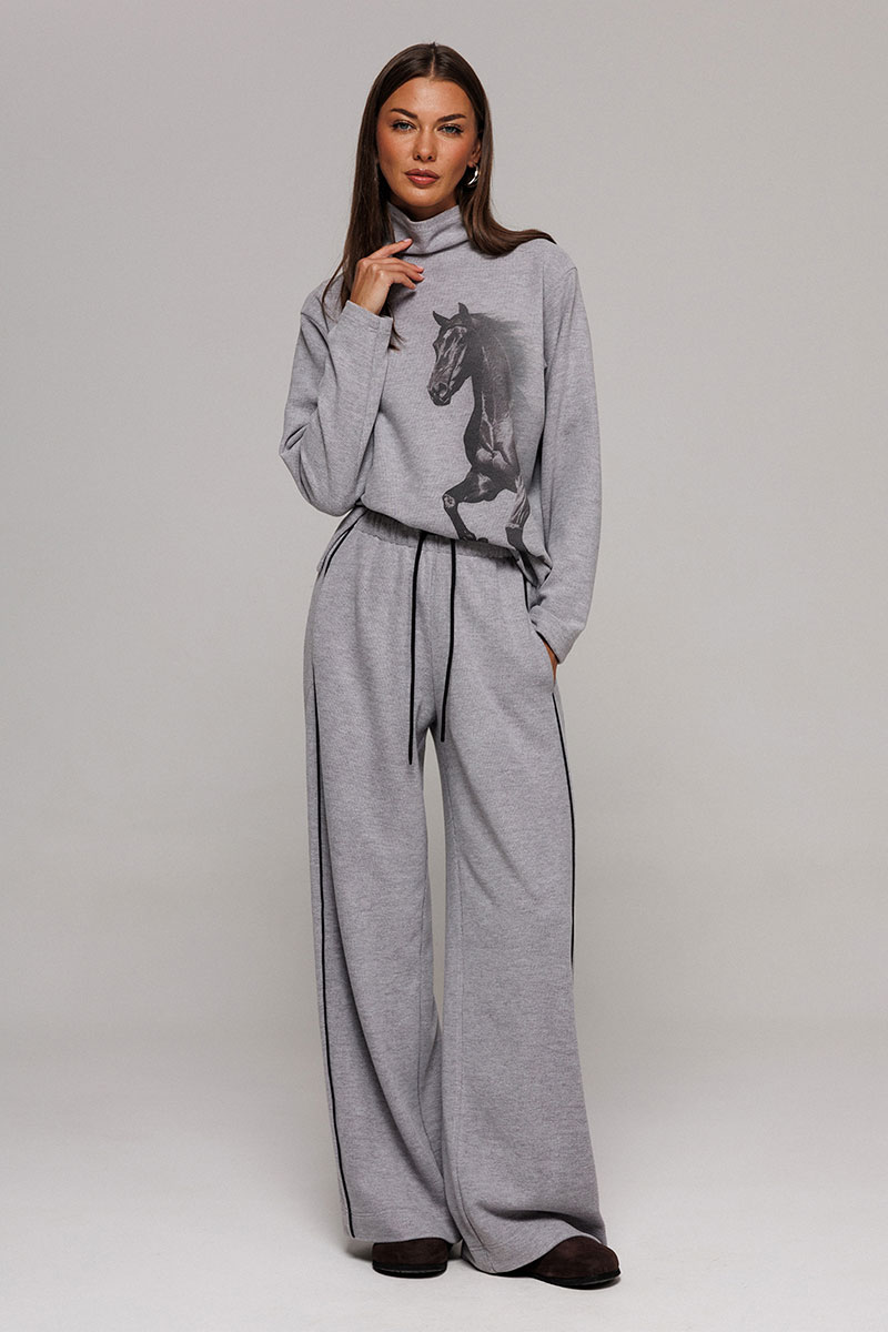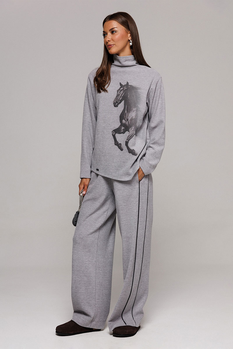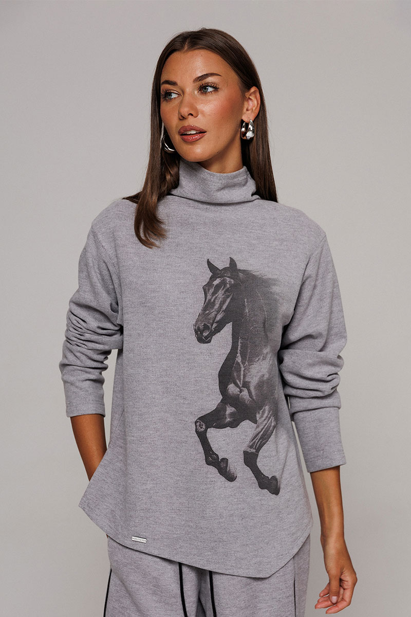 Джемпер из трикотажного полотна с велюровым эффектом прямого силуэта со спущенной линией плеча. Рукав втачной. По переду печать "Лошадь" и нашивка с гравировкой "BUTER". Низ джемпера по переду фигурный ассиметричный. Внизу по правому боковому шву обработан разрез. Воротник-стойка цельнокроеный.