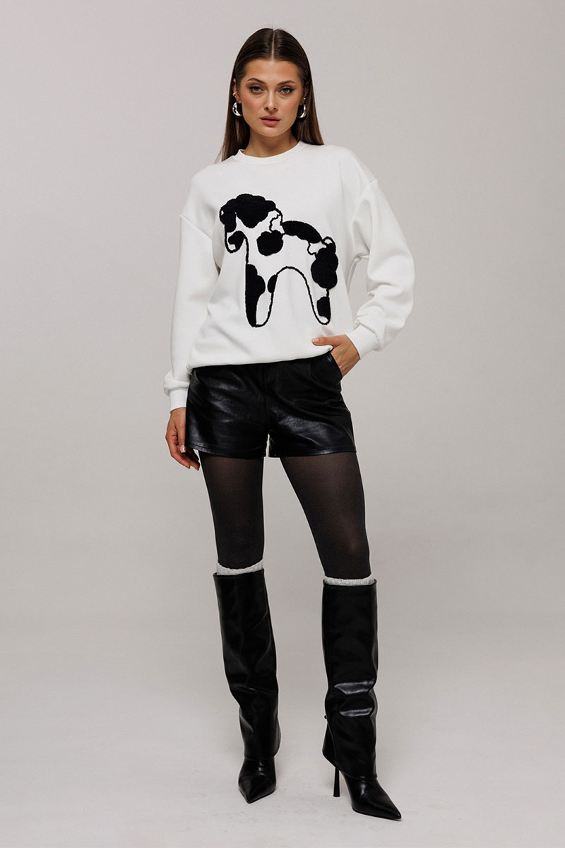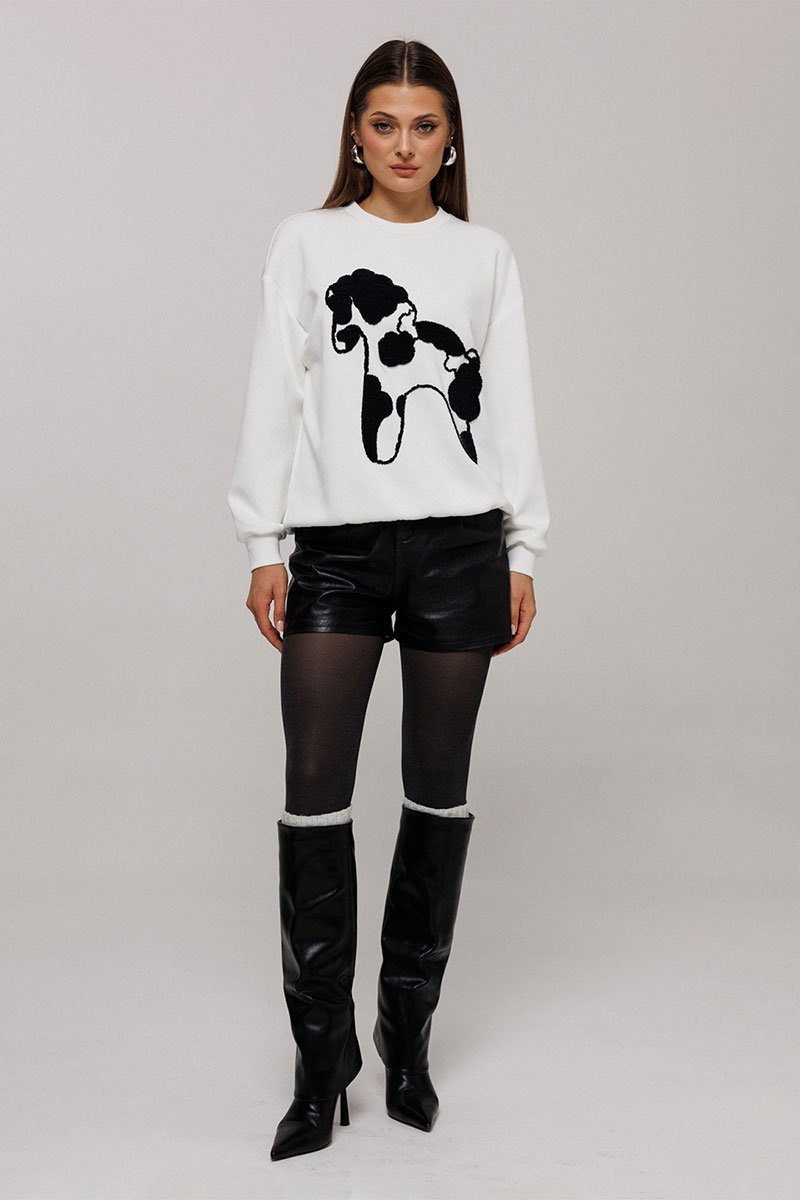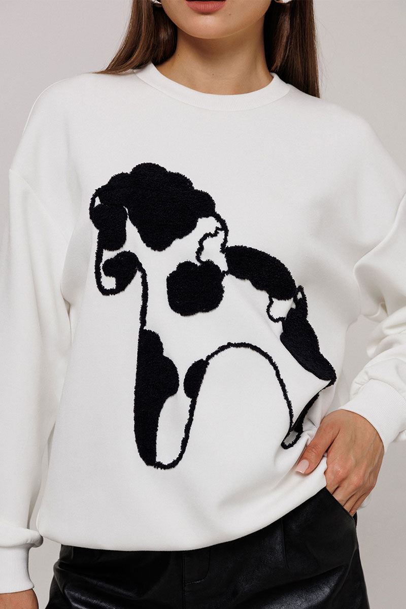 Джемпер из технологичного трикотажного полотна с эффектом peach. Прямого силуэта с втачным рукавом и спущенной линией плеча, с манжетой из отделочной ткани по низу рукава. По переду вышивка "Лошадка". По горловине и низу изделия притачная планка из отделочной ткани.