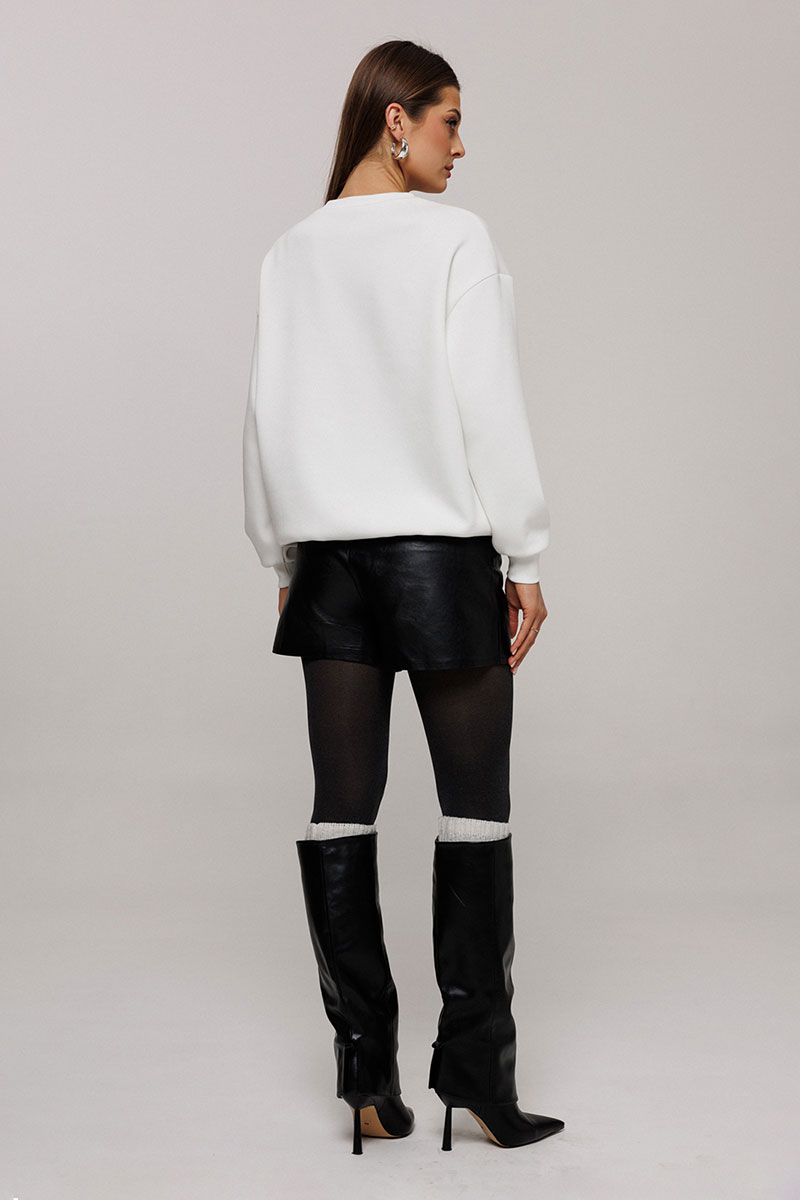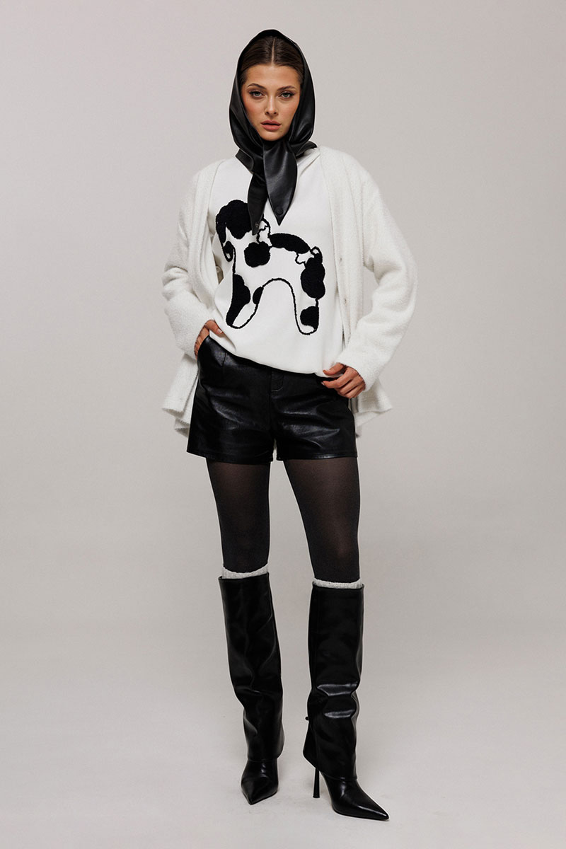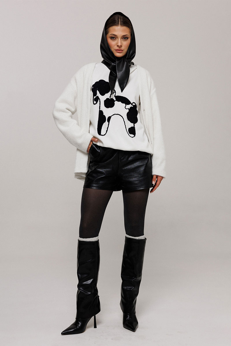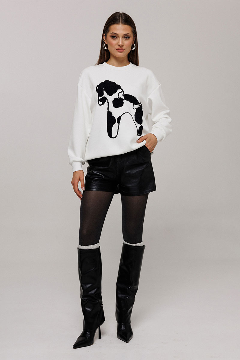 Джемпер из технологичного трикотажного полотна с эффектом peach. Прямого силуэта с втачным рукавом и спущенной линией плеча, с манжетой из отделочной ткани по низу рукава. По переду вышивка "Лошадка". По горловине и низу изделия притачная планка из отделочной ткани.