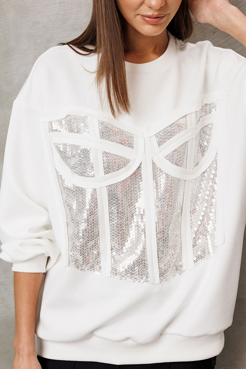 Джемпер из технологичного трикотажного полотна с эффектом peach. Прямого силуэта с втачным рукавом и спущенной линией плеча, с манжетой из отделочной ткани по низу рукава. По переду имитация корсета из пайеток. По горловине и низу изделия притачная планка из отделочной ткани.