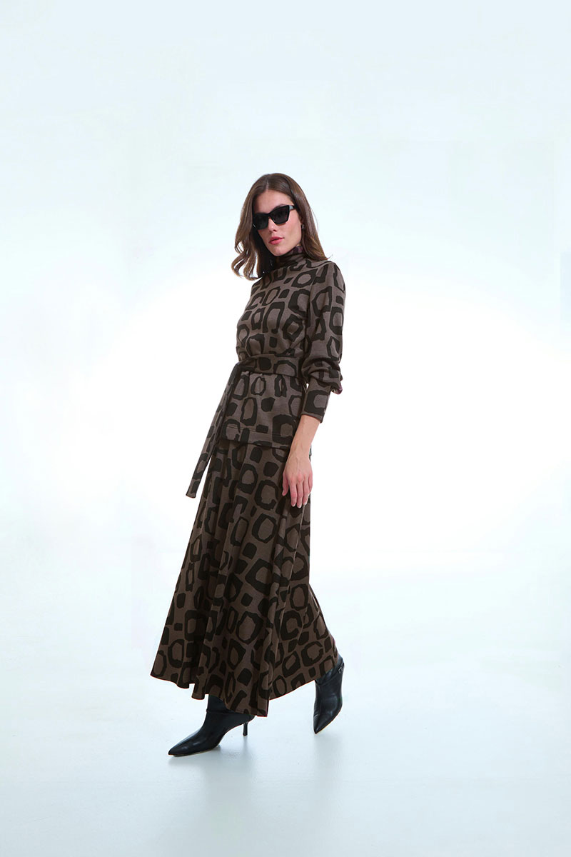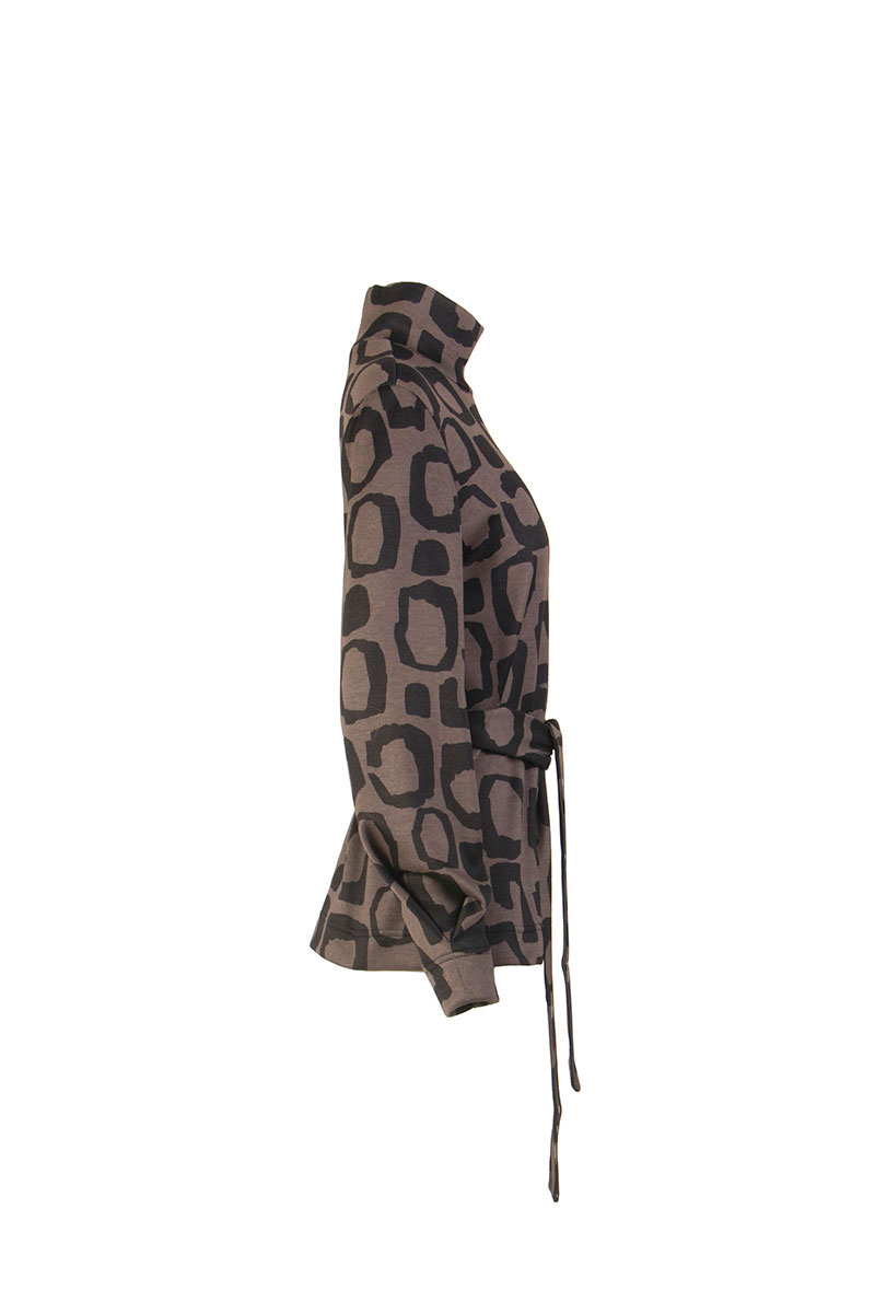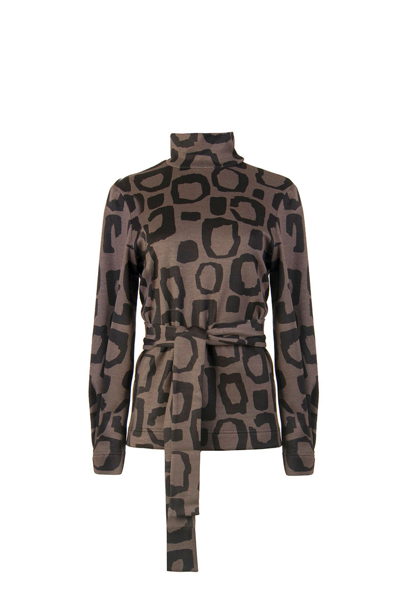 Джемпер женский прямого силуэта с длинными рукавами, воротник - стойка. В нижней части рукава складка. В комплекте съемный пояс.