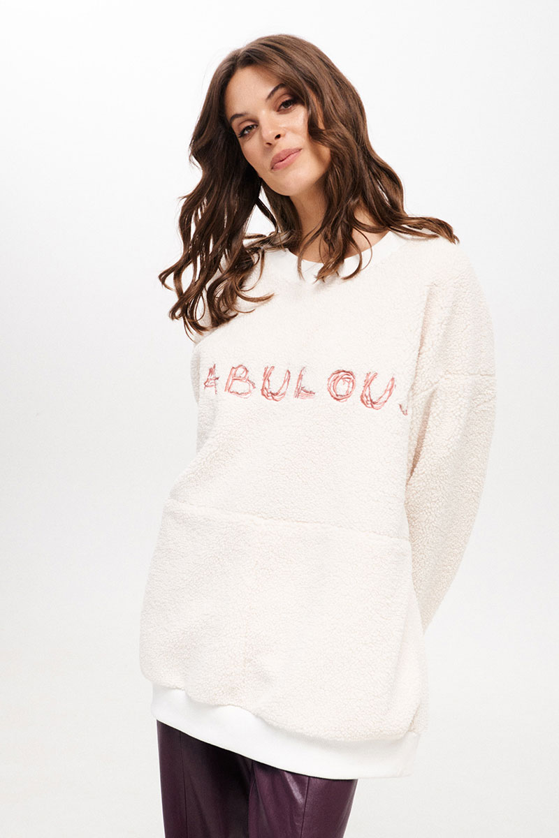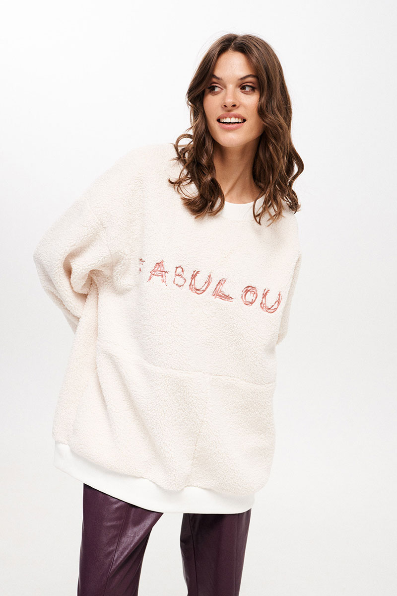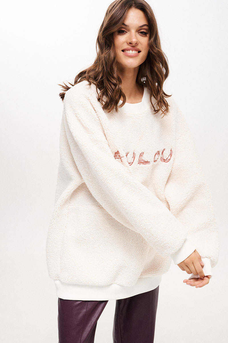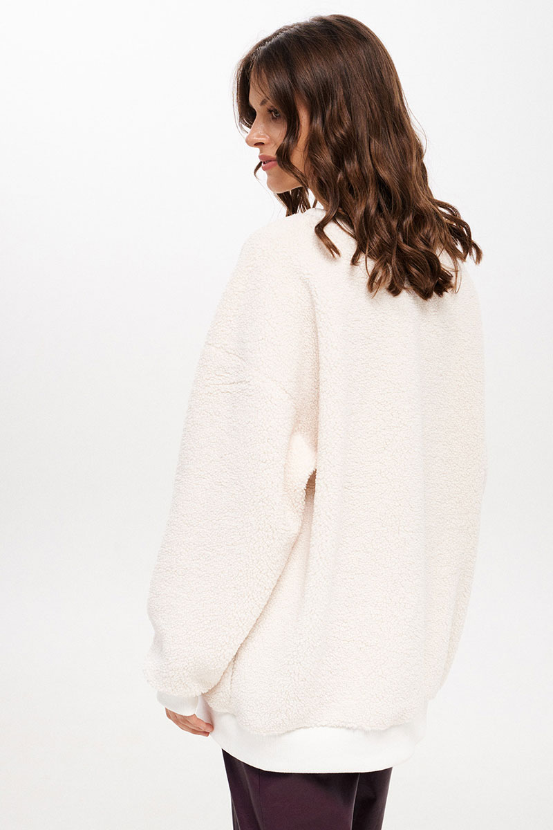 Джемпер женский, свободного силуэта, длиной ниже линии бедер из трикотажного полотна. Со спущенной линией плеча. Перед разрезной, на верхней части переда декоративная вышивка. В боковых швах функциональные карманы. Рукав одношовный, длинный с притачной манжетой. Вырез горловины круглый. Низ изделия на притачной манжете. Планка горловины, манжеты рукава и низа из отделочного трикотажного полотна - довяза.