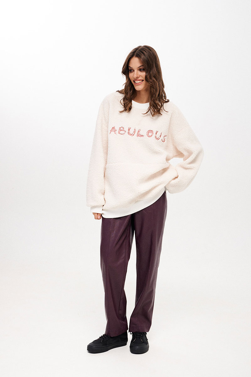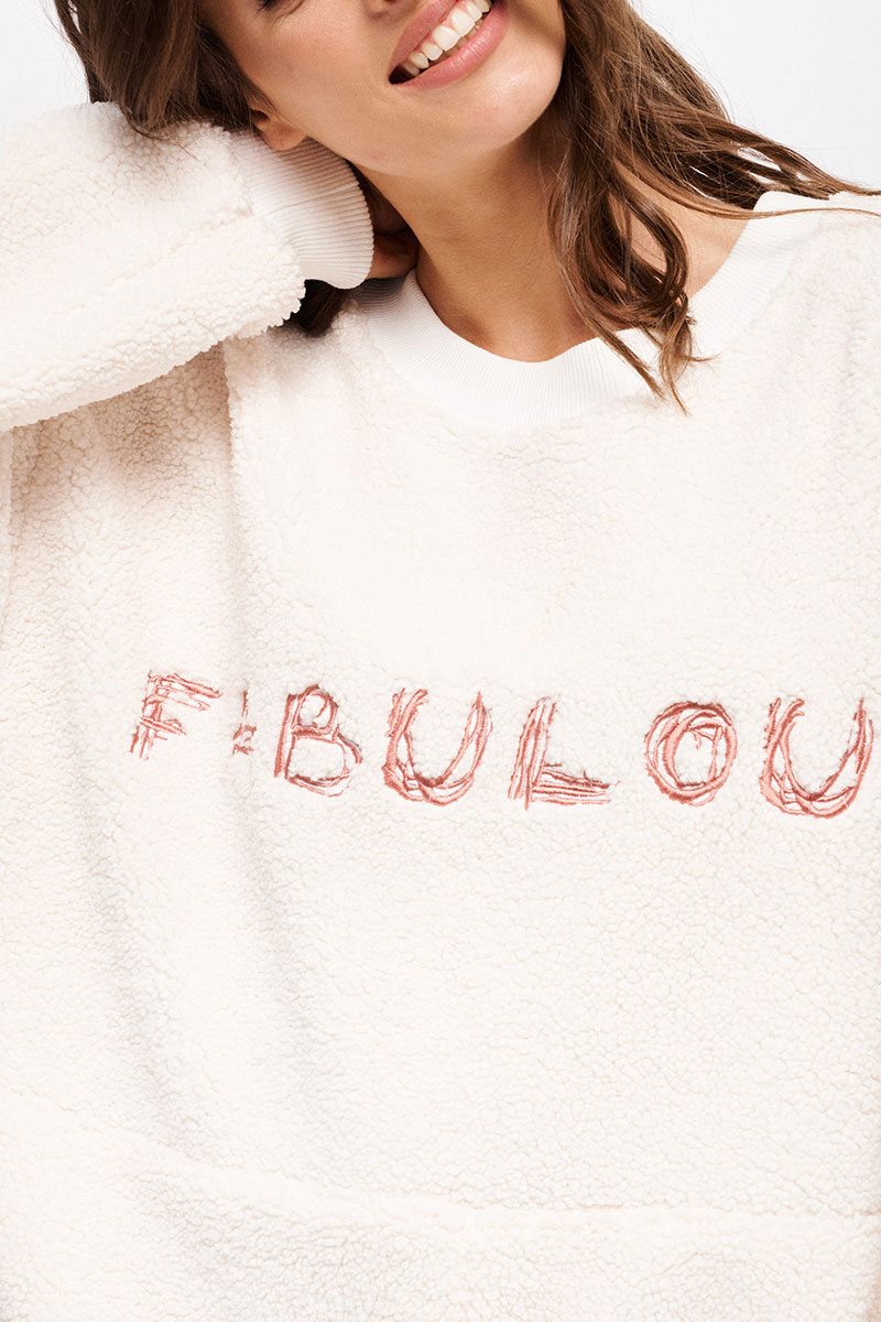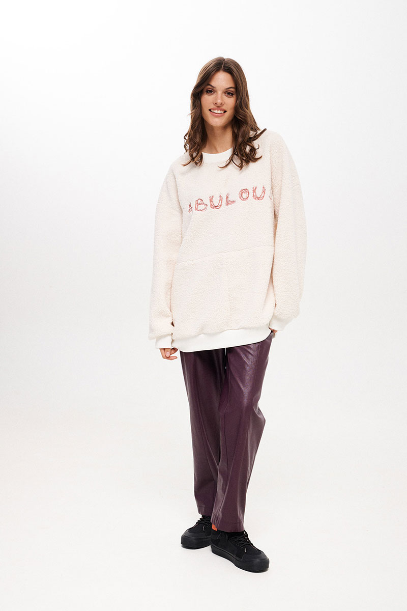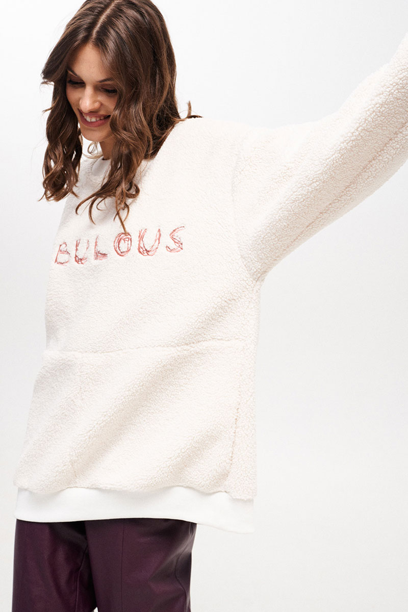Джемпер женский, свободного силуэта, длиной ниже линии бедер из трикотажного полотна. Со спущенной линией плеча. Перед разрезной, на верхней части переда декоративная вышивка. В боковых швах функциональные карманы. Рукав одношовный, длинный с притачной манжетой. Вырез горловины круглый. Низ изделия на притачной манжете. Планка горловины, манжеты рукава и низа из отделочного трикотажного полотна - довяза.