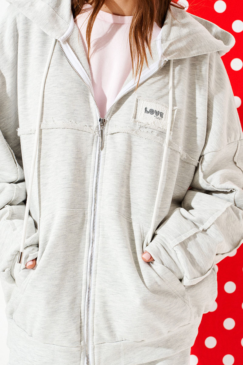 Толстовка из трикотажного полотна свободного объема, прямого силуэта, с капюшоном и центральной застежкой на тесьму-молнию. Детали переда с накладными карманами и отрезной кокеткой. На левой детали переда настрочная деталь с нашивкой. Спинка с отрезной кокеткой и средним швом. Рукав втачной, двухшовный, длинный. Низ изделия и рукава обработаны притачной манжетой. Капюшон на обтачке, одношовный, через обметанные петли в кулиску продет декоративный шнур с металлическими наконечниками. Кокетка и настрочная деталь переда, кокетка и средний шов спинки, шов капюшона, швы рукавов – с необработанным краем.