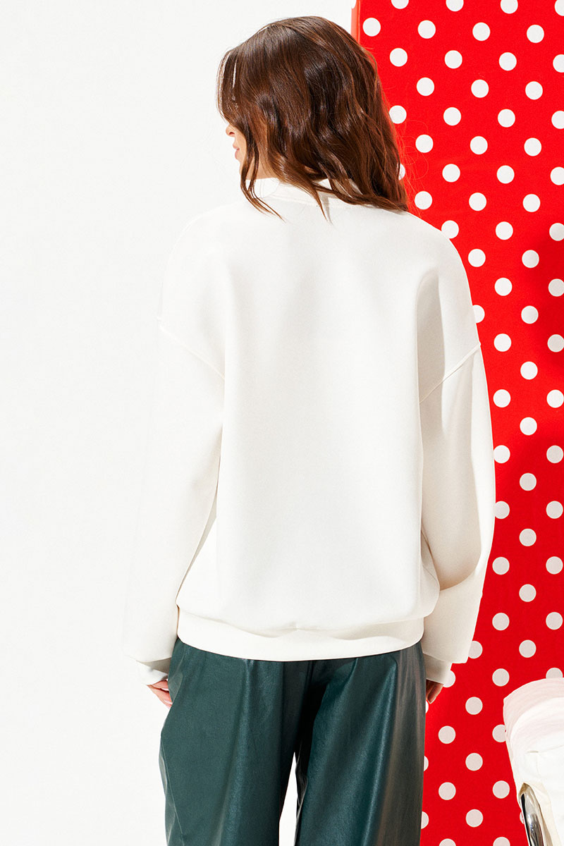 Бомбер из трикотажного полотна свободного объема, прямого силуэта, с центральной застежкой на тесьму-молнию и круглым вырезом горловины. Воротник-стойка. Детали переда и спинки с отрезной кокеткой. На левой кокетке переда выполнена вышивка «Пульс». В боковых швах расположены карманы. Рукав втачной, одношовный, длинный. Низ рукава, переда и спинки обработаны притачной манжетой.