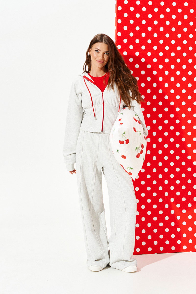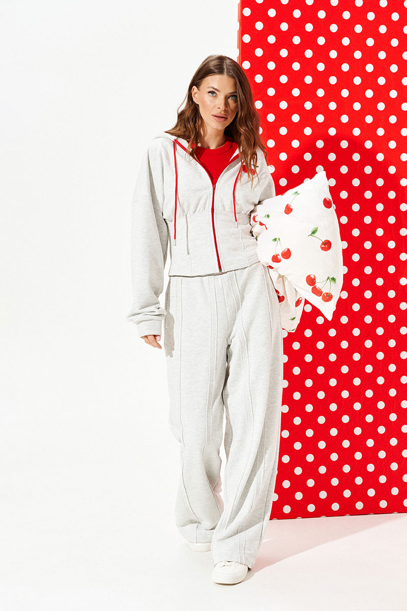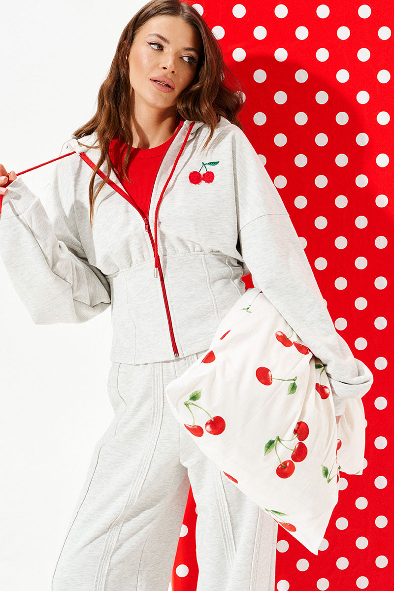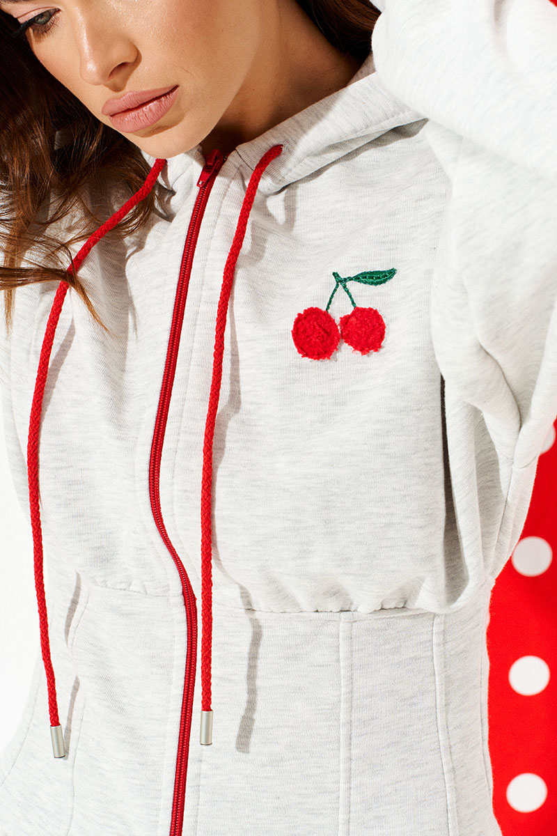 Толстовка из трикотажного полотна, приталенного силуэта, с капюшоном и центральной застежкой на тесьму-молнию. Перед и спинка отрезные. На левой детали переда выполнена вышивка «Вишня». Нижняя часть переда и спинки состоит из нескольких деталей. По швам стачивания деталей проложены отделочные строчки. Рукав втачной, одношовный, длинный. Низ рукава обработан притачной манжетой. Капюшон на обтачке, одношовный, через обметанные петли в кулиску продет декоративный шнур с металлическими наконечниками.