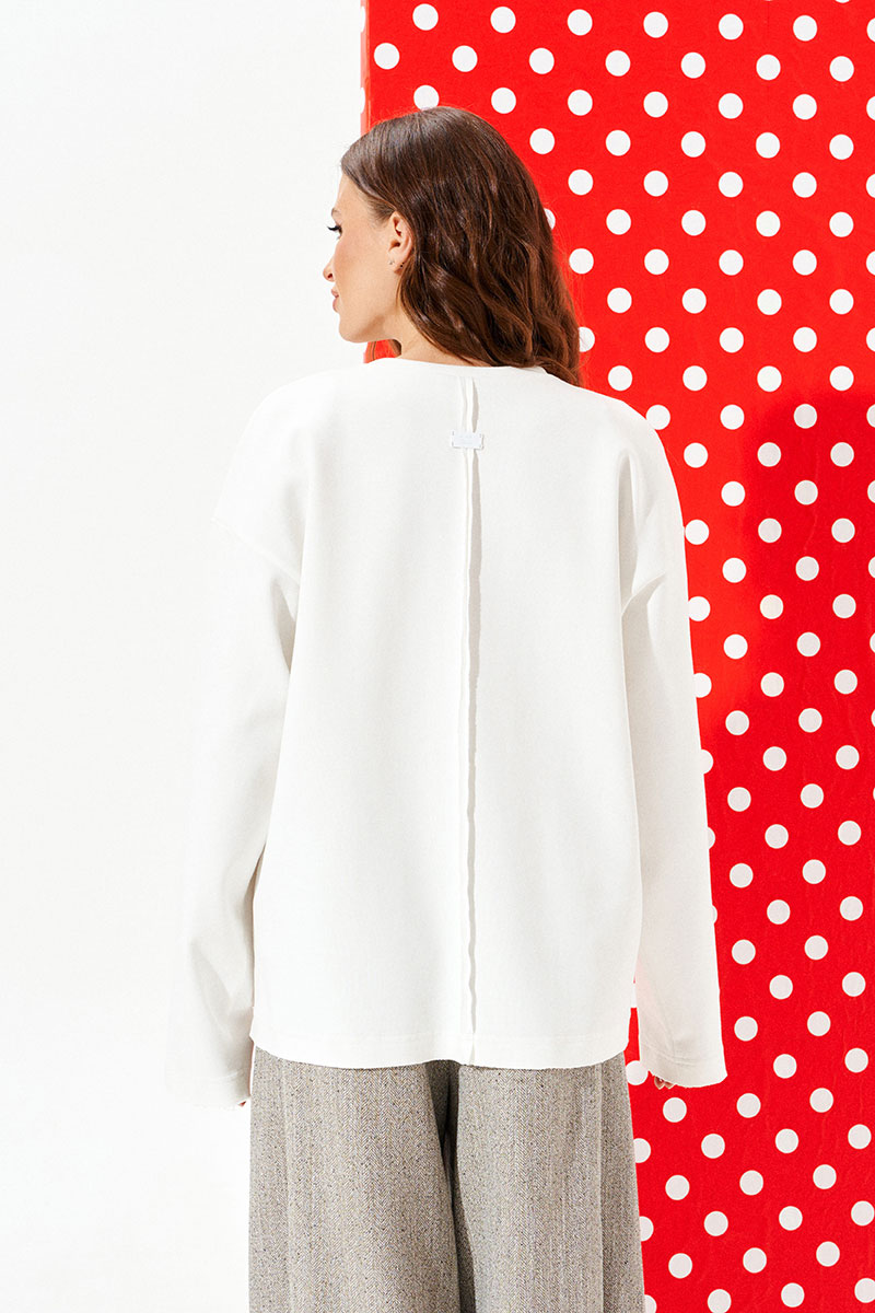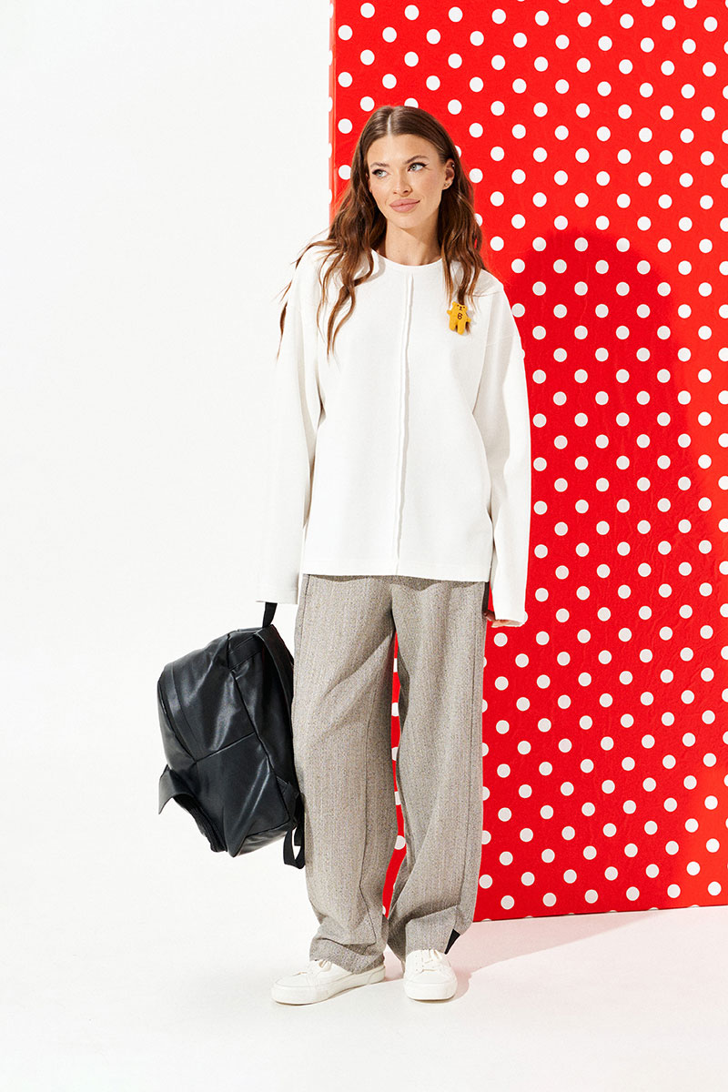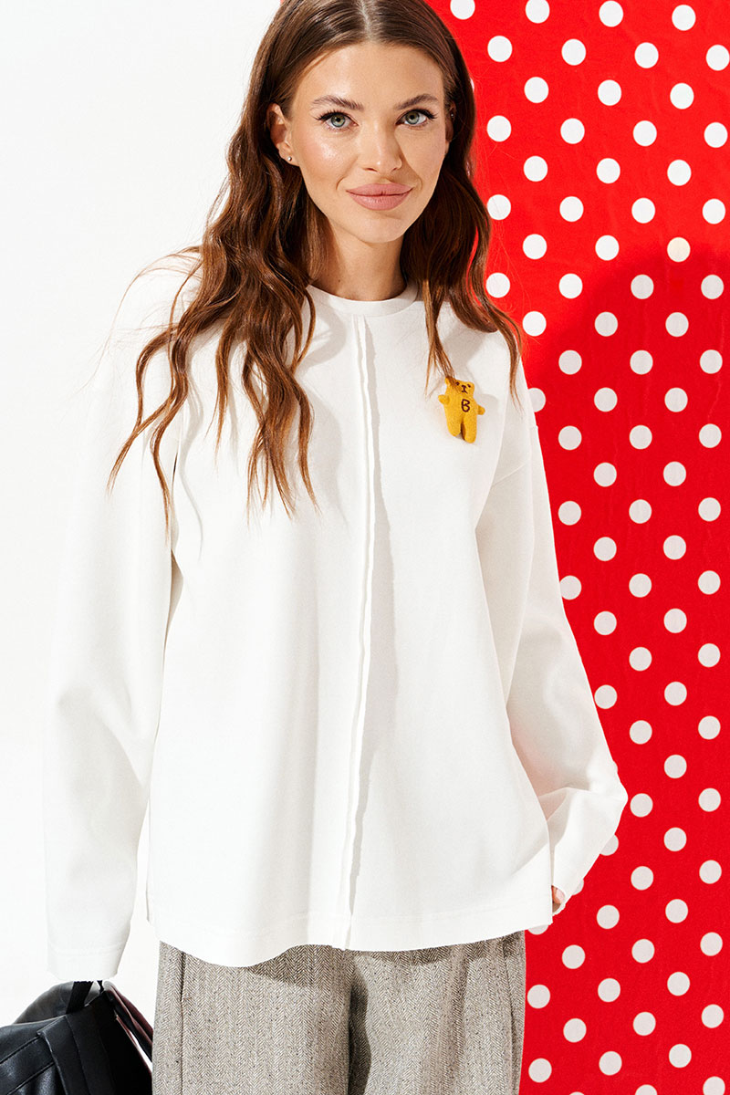 Джемпер из трикотажного полотна свободного объема, прямого силуэта, с круглым вырезом горловины. Перед и спинка со средним швом вразутюжку. Левая деталь переда со съемной брошью «Медвежонок». На спинке декоративная металлическая нашивка. Рукав втачной, одношовный, длинный. Низ изделия и рукава, средний шов переда и спинки с необработанным краем.