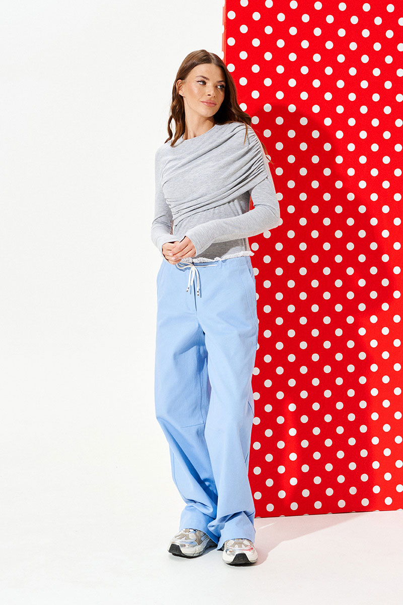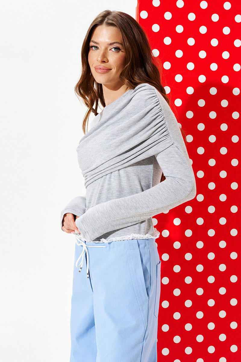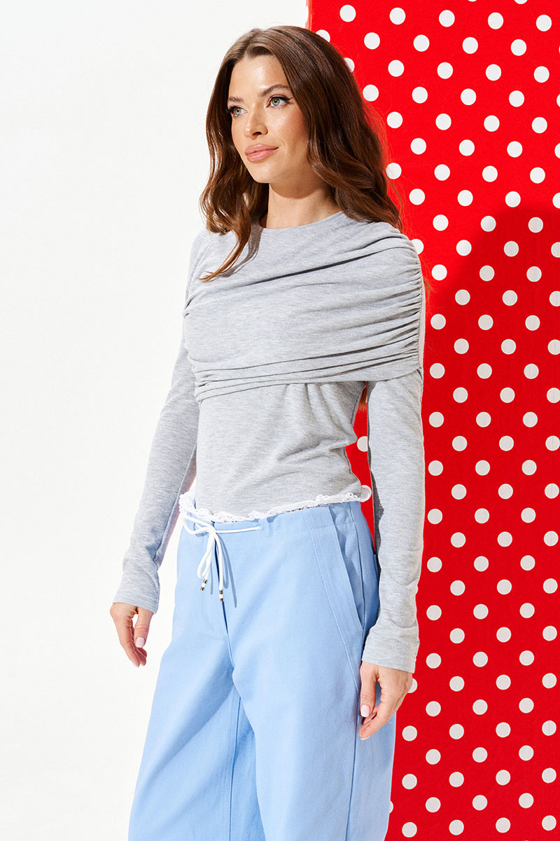 Джемпер из трикотажного полотна прилегающего силуэта с круглым вырезом горловины. Вырез горловины обработан притачной обтачкой. Перед с драпировкой. Спинка цельная. Рукав покроя реглан.