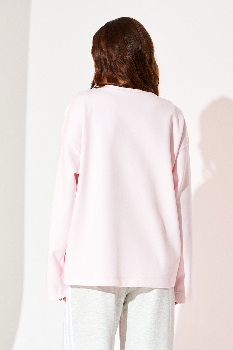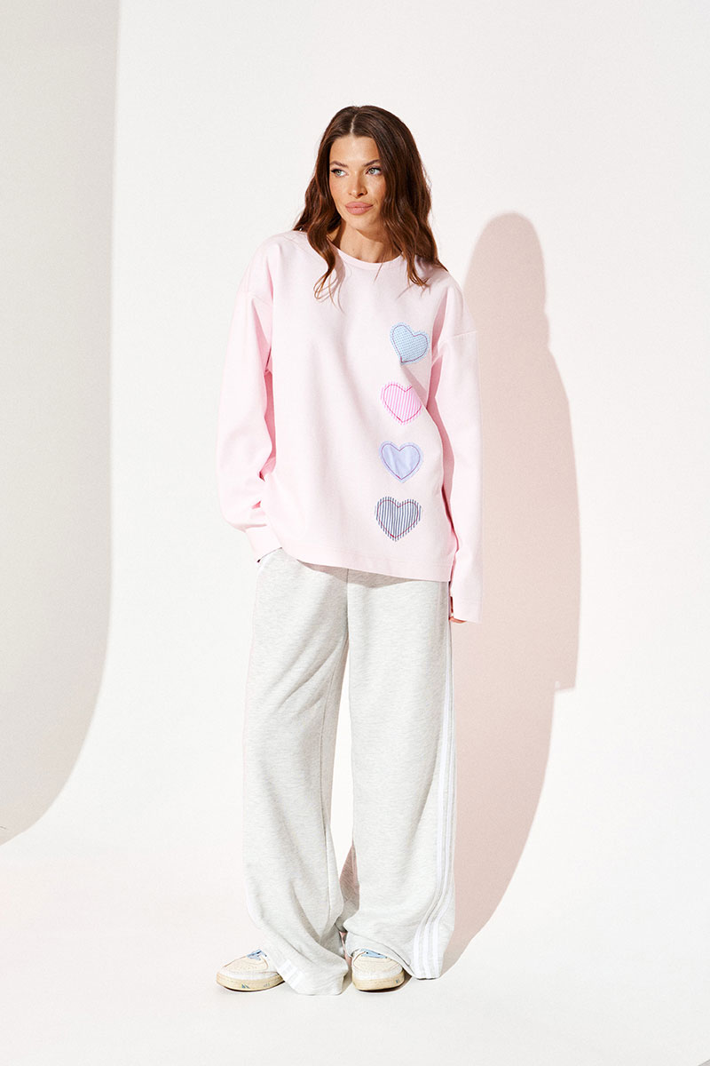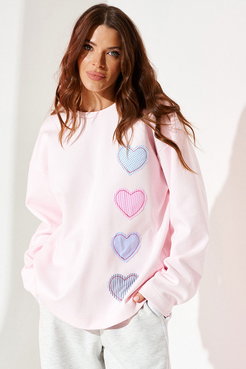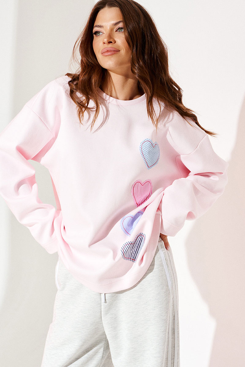 Джемпер из трикотажного полотна свободного объема, прямого силуэта, с круглым вырезом горловины. Вырез горловины обработан притачной обтачкой. Перед и спинка цельные. По переду выполнена вышивка-аппликация «Сердечки» из контрастных материалов. Рукав втачной, одношовный, длинный.