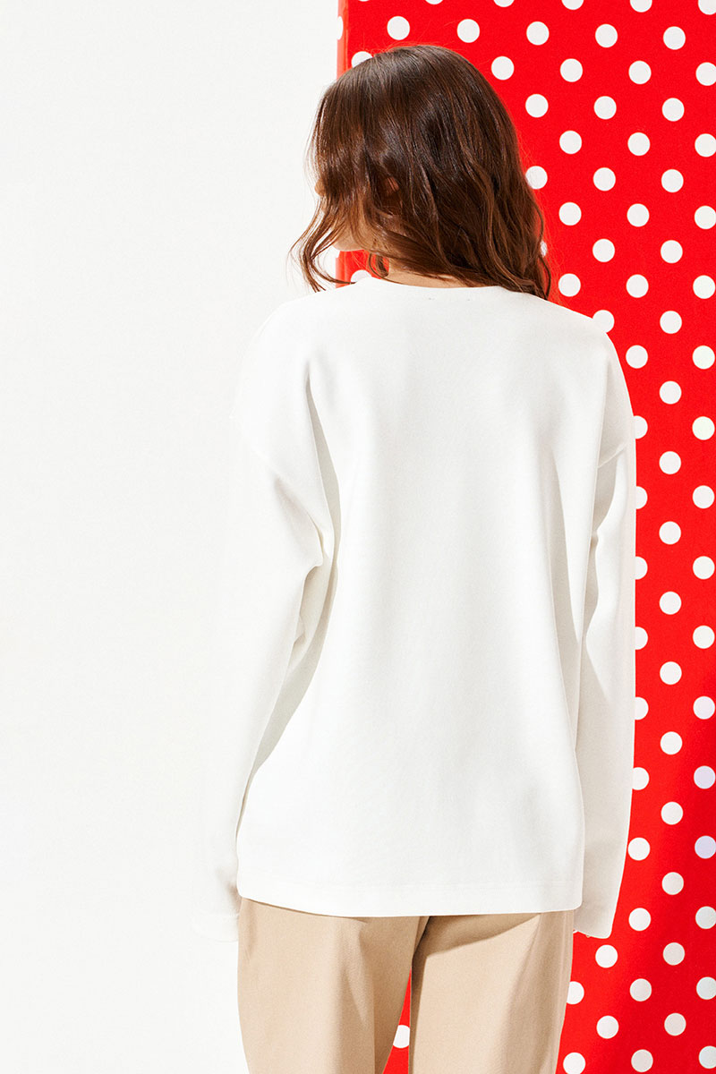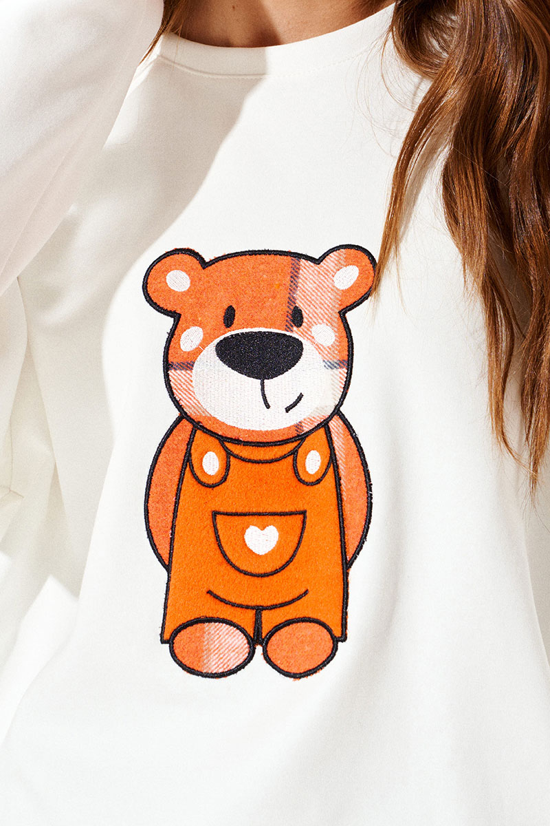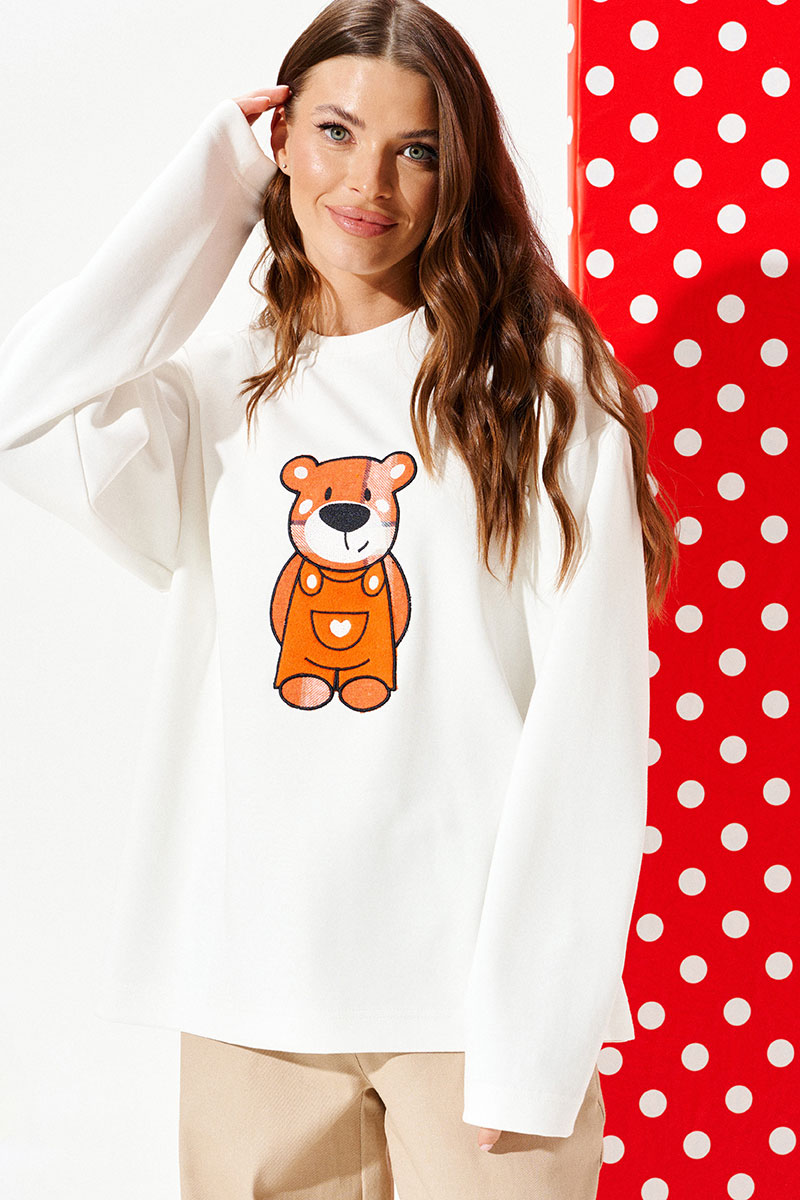 Джемпер из трикотажного полотна свободного объема, прямого силуэта, с круглым вырезом горловины. Вырез горловины обработан притачной обтачкой. Перед и спинка цельные. По переду выполнена вышивка-аппликация «Медвежонок» из контрастных материалов. Рукав втачной, одношовный, длинный.