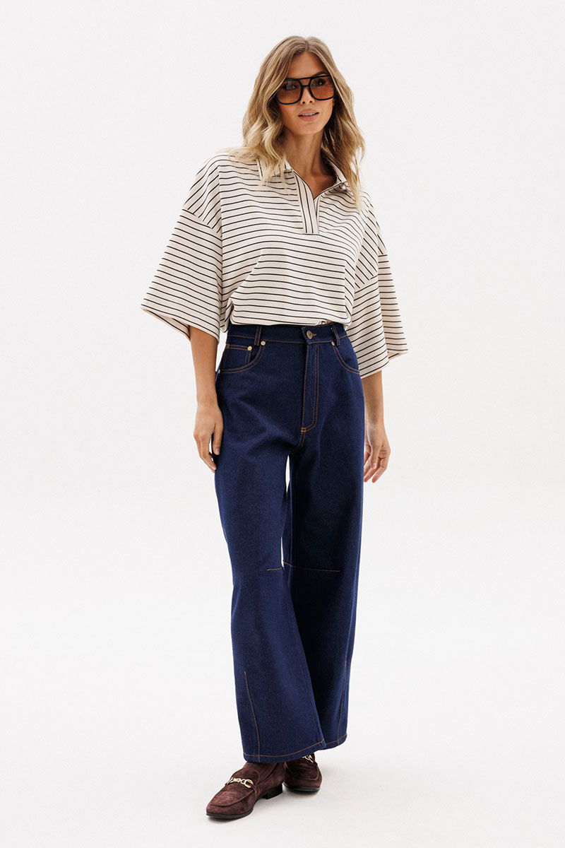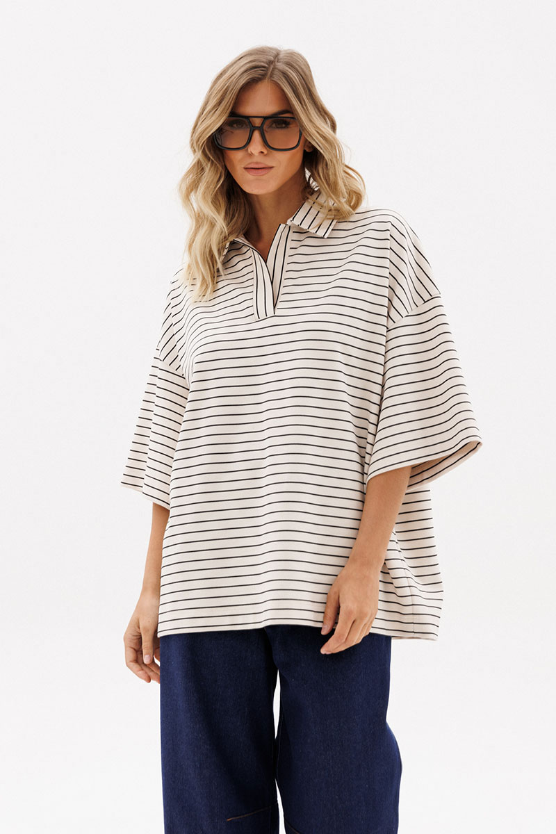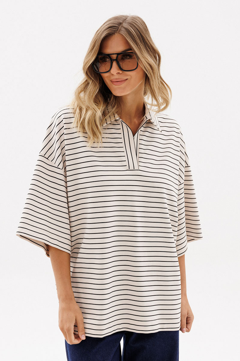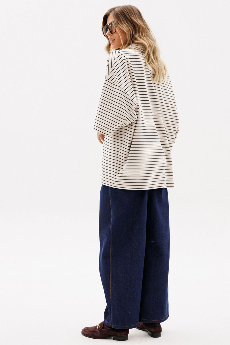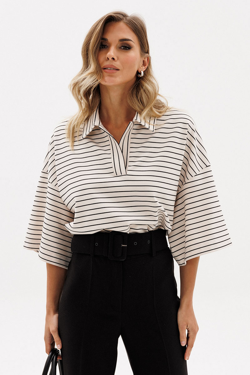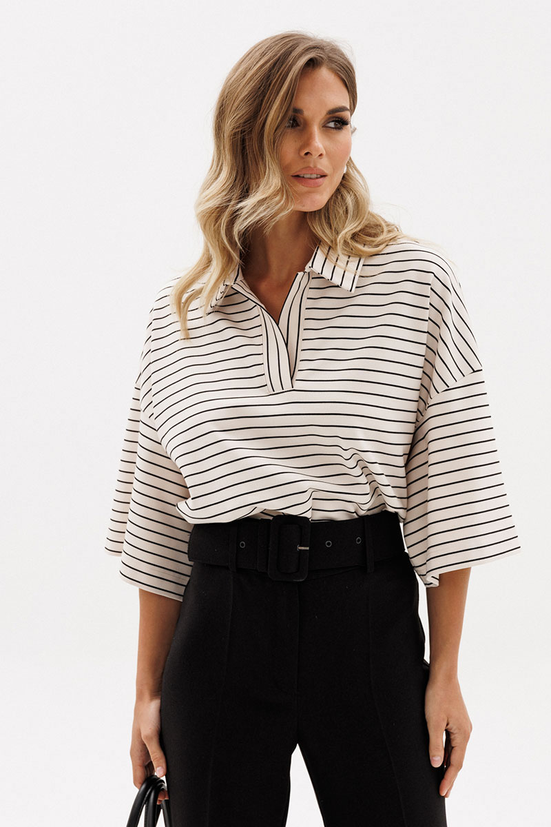Джемпер выполнен из трикотажного полотна. Джемпер прямого силуэта, длиной до линии бедер. Перед и спинка цельные.Воротник стояче-отложной. Плечевой шов удлинен. Рукав рубашечного покроя, одношовный, длиной до линии локтя.