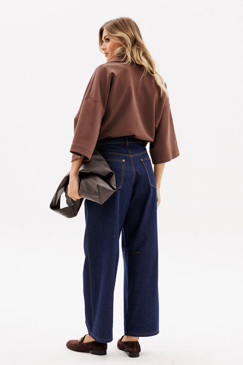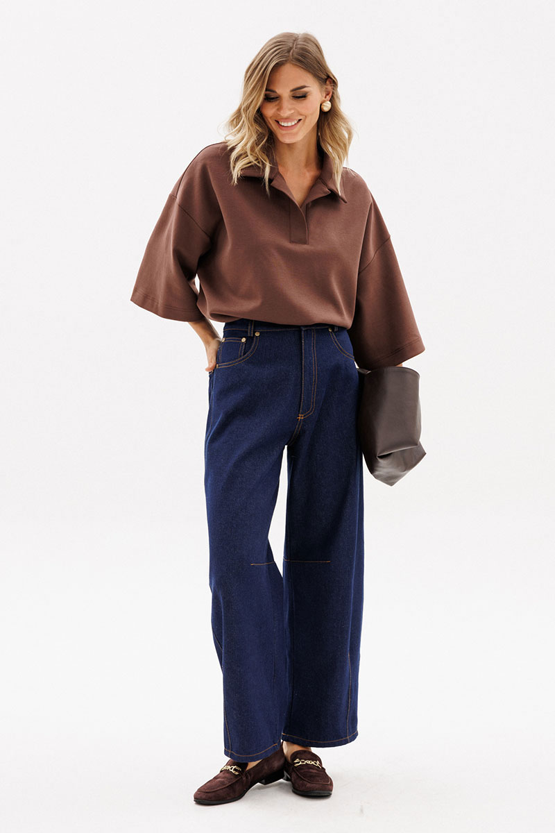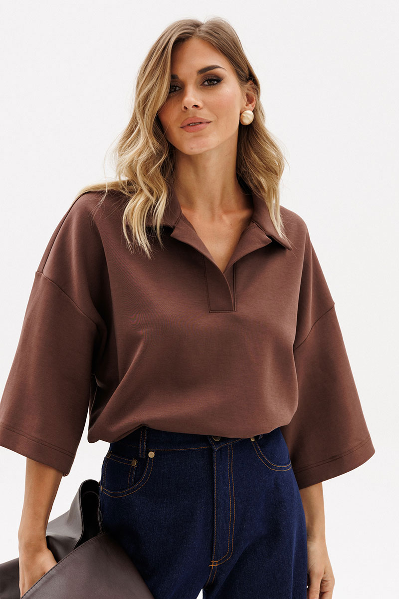 Джемпер выполнен из трикотажного полотна. Джемпер прямого силуэта, длиной до линии бедер. Перед и спинка цельные.Воротник стояче-отложной. Плечевой шов удлинен. Рукав рубашечного покроя, одношовный, длиной до линии локтя.