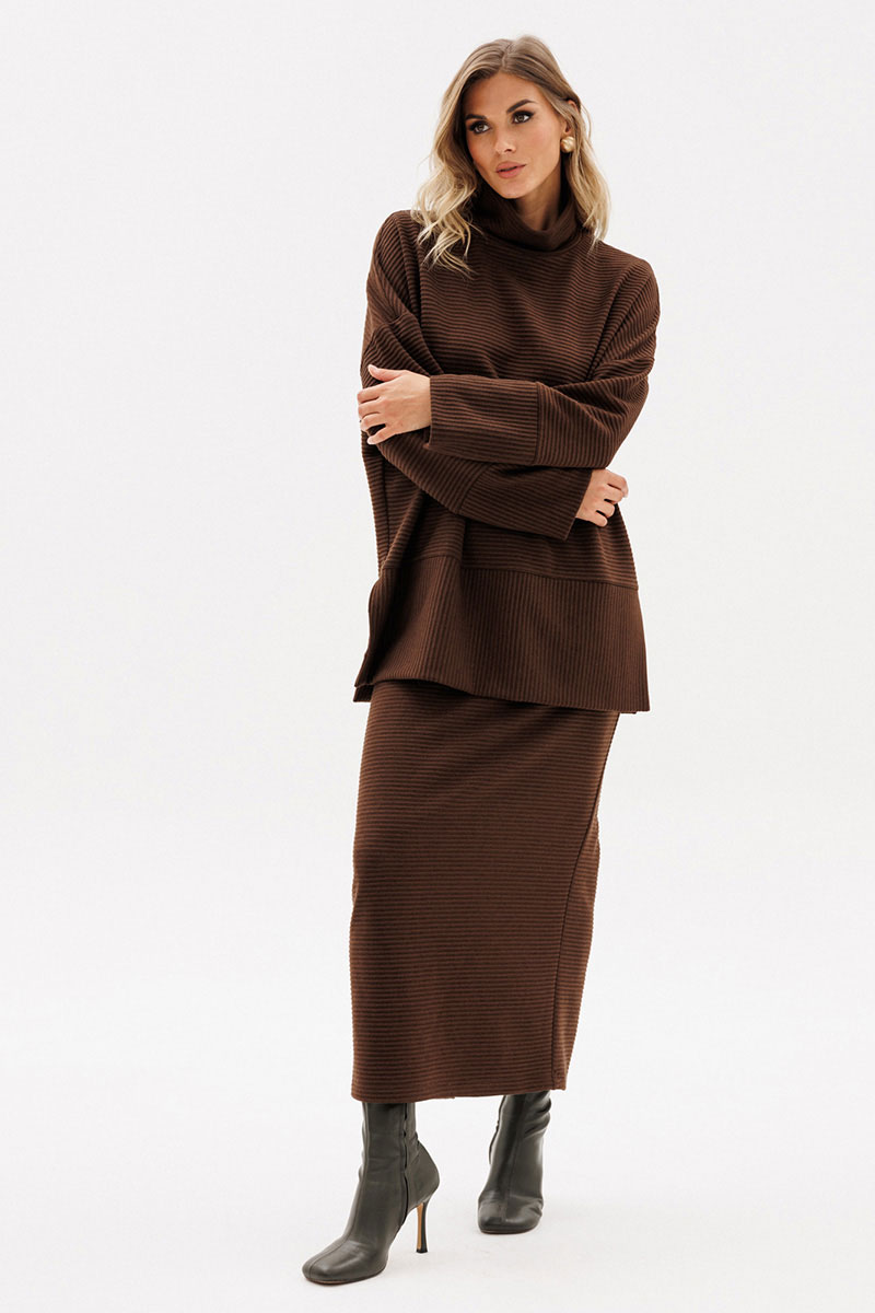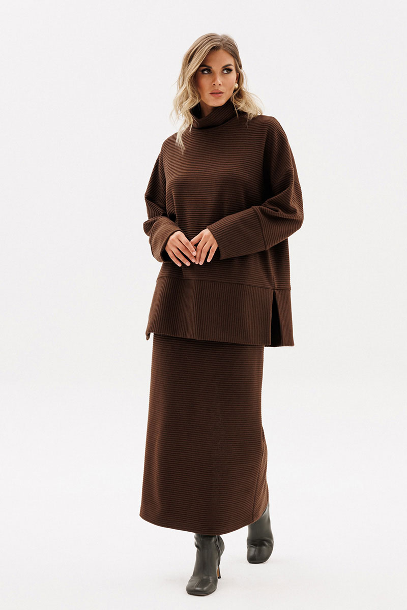 Джемпер выполнен из трикотажного полотна в рубчик. Джемпер прямого силуэта, покроя "oversize", длиной до линии бедер. Спереди и на спинке отрезные части. Воротник-стойка. Плечевой шов удлинен. Рукав рубашечного покроя, одношовный, с широкой манжетой по низу. В боковых швах разрезы.