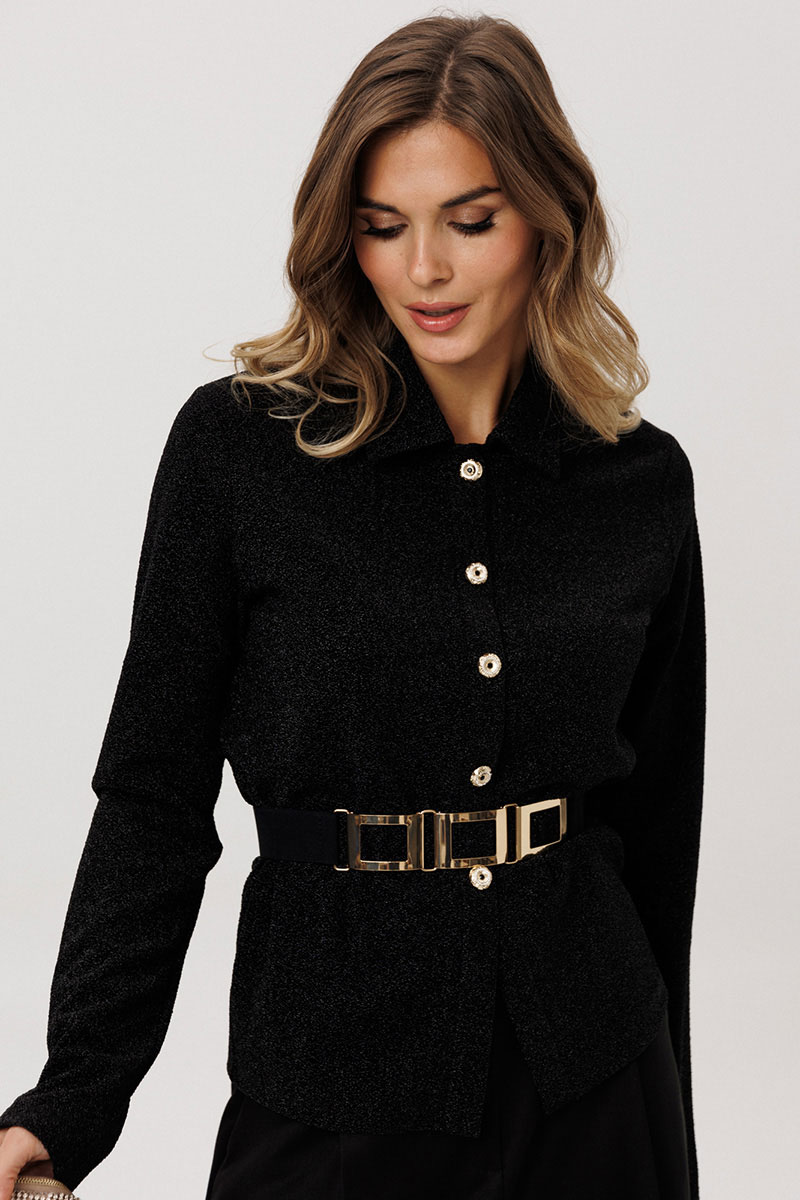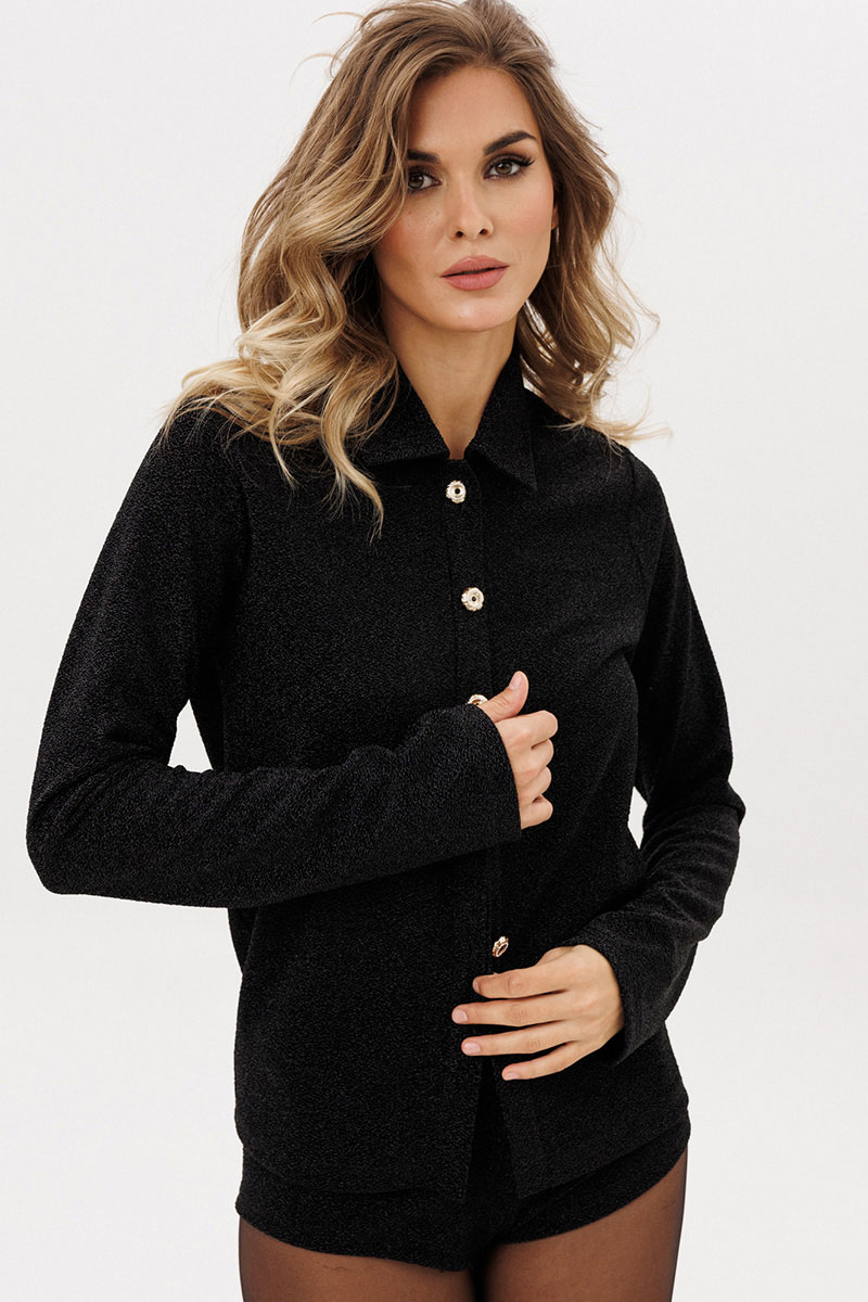 Джемпер выполнен из трикотажного полотна с блеском. Джемпер полуприлегающего силуэта, длиной выше линии бедер. Воротник стояче-отложной. Плечевой шов удлинен. Рукав втачного покроя, одношовный. Застежка по планке на петли и декоративные пуговицы.