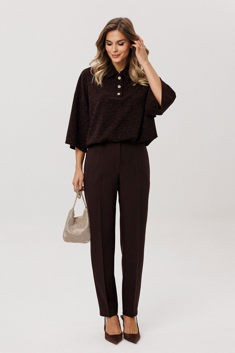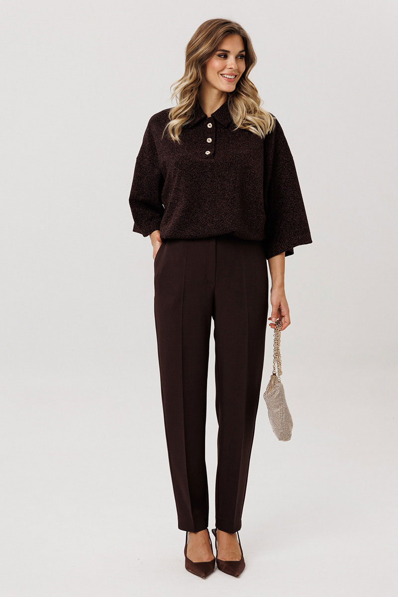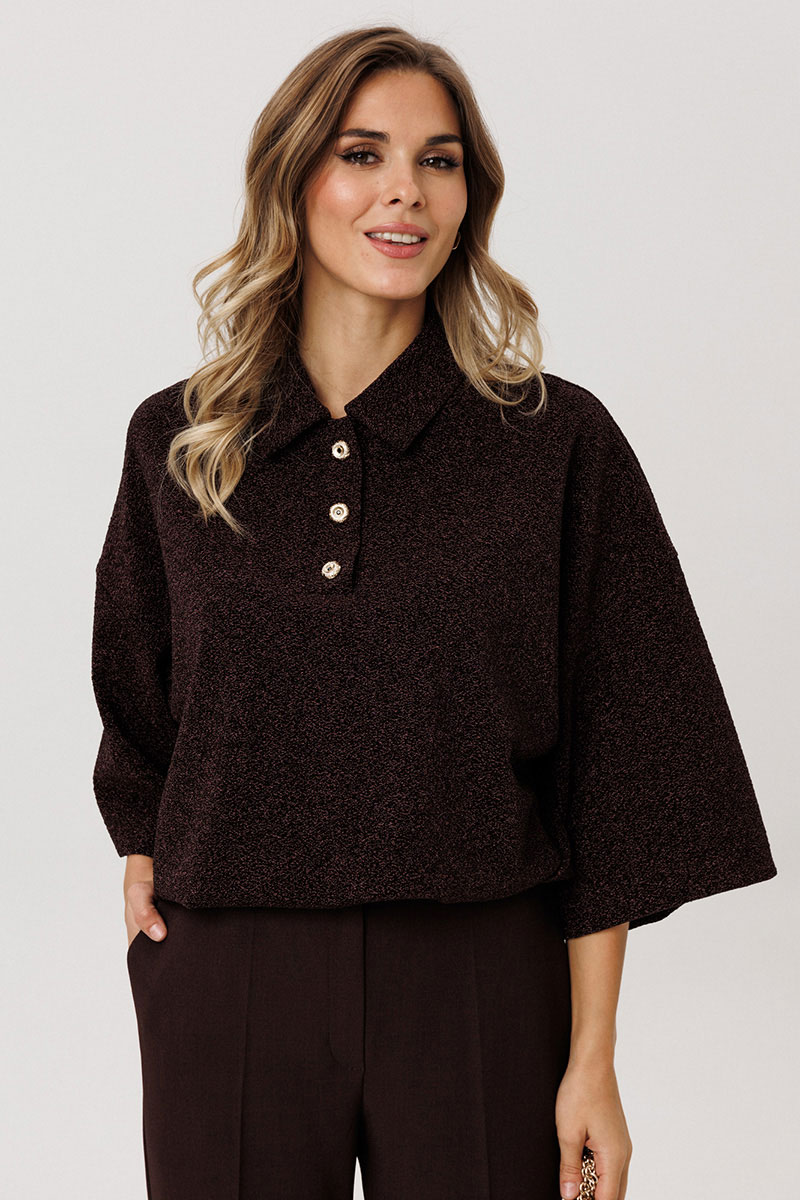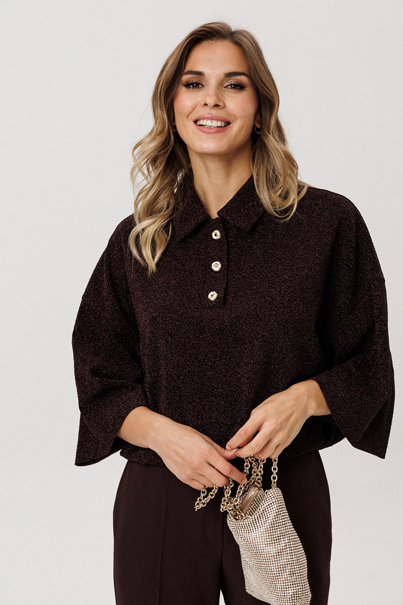 Джемпер выполнен из трикотажного полотна с блеском. Джемпер О-образного силуэта, длиной выше линии бедер. Спереди центральная застежка на декоративные пуговицы. Спинка цельная. Воротник стояче-отложной. Плечевой шов удлинен. Рукав рубашечного покроя, одношовный, длиной до линии локтя. Низ джемпера присобран на эластичную тесьму.
