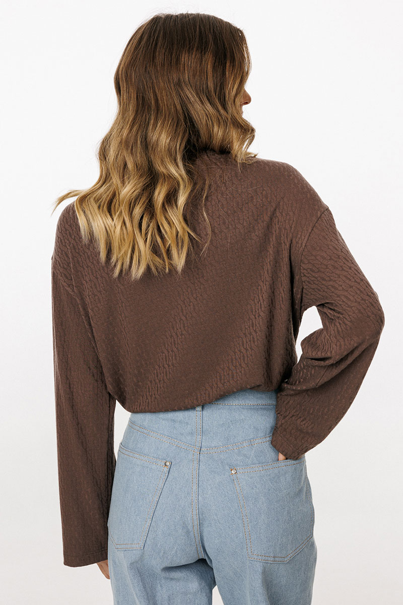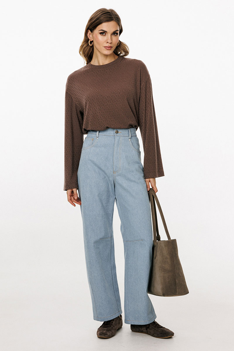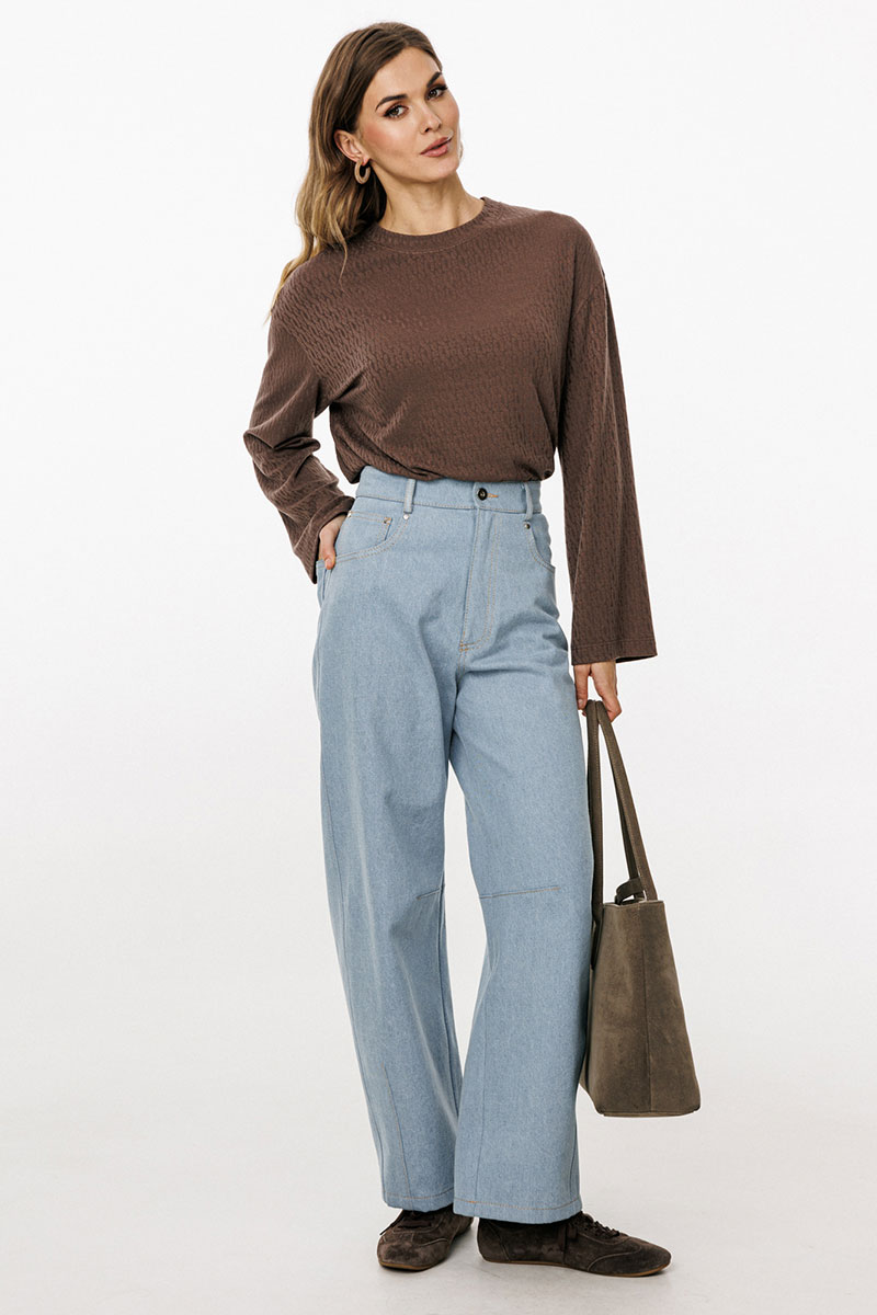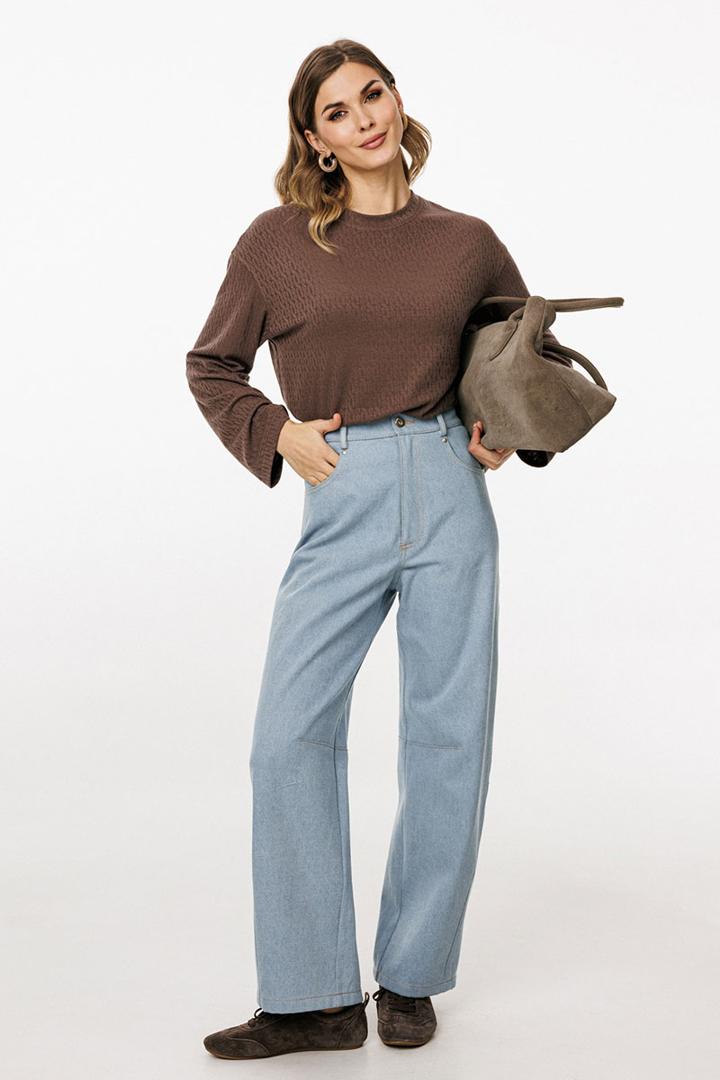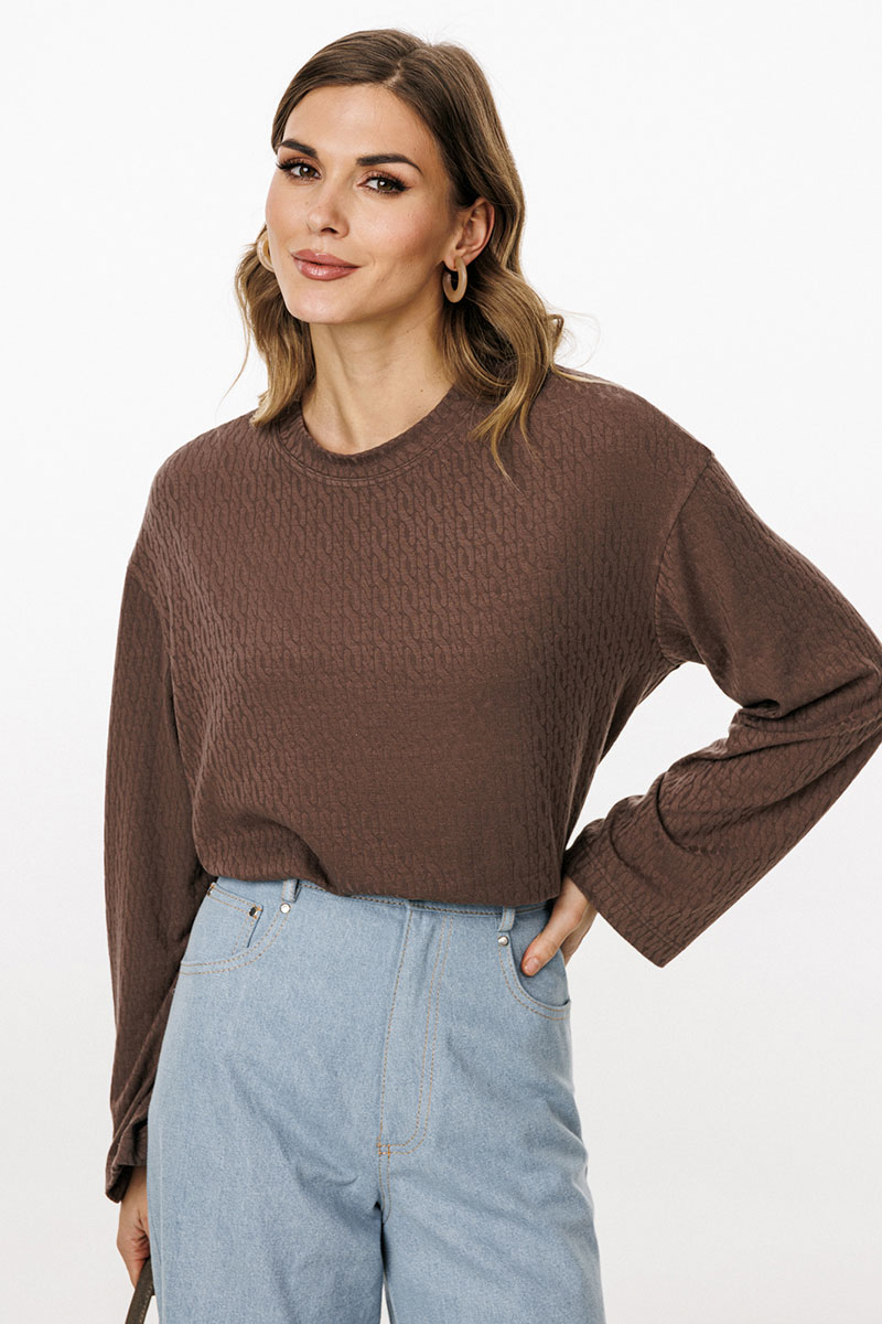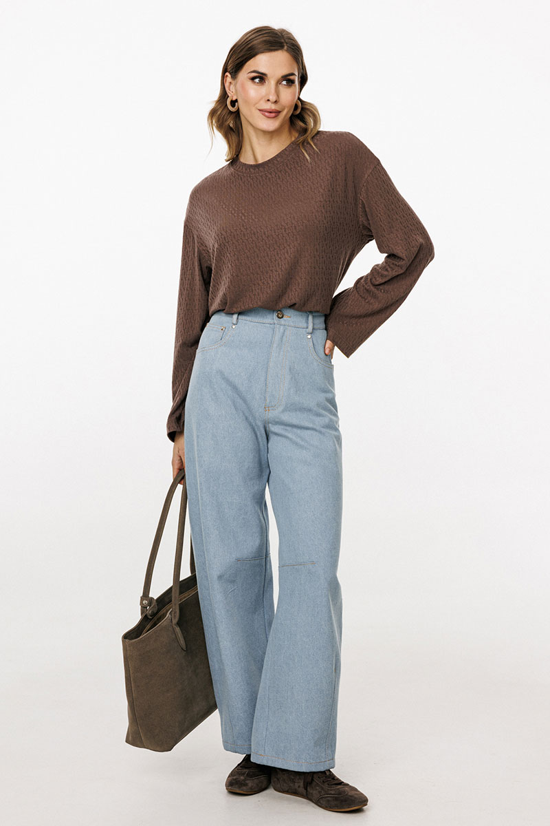 Джемпер выполнен из трикотажного полотна с рисунком. Джемпер прямого силуэта, длиной до линии бедра. Перед и спинка цельные. Горловина округлой формы, обработана широкой бейкой. Плечевой шов удлинен. Рукав одношовный, прямой.