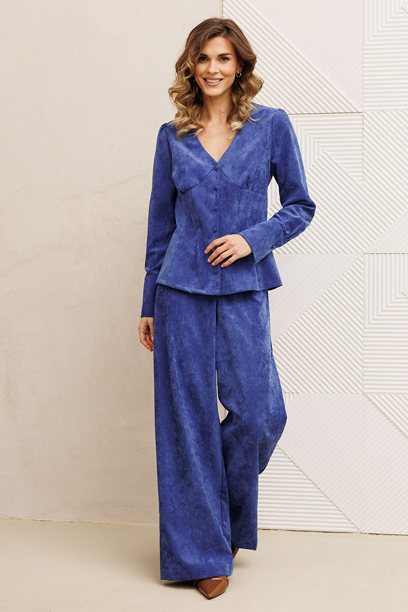 Блузка оригинальная приталенного силуэта из вельветовой ткани. Перед с подрезом под грудью, сборкой в районе груди и талиевыми вытачками. Затсежка на петли и пуговицы. Горловина V-образной формы. Спинка со средним швом и  талиевыми вытачками. Рукав втачной со сборкой по окату и с манжетой по низу. Манжета высокая с двумя петлями и пуговицами.