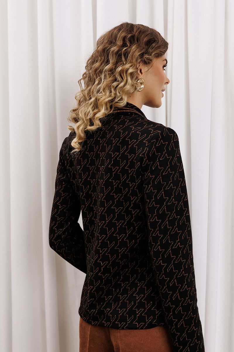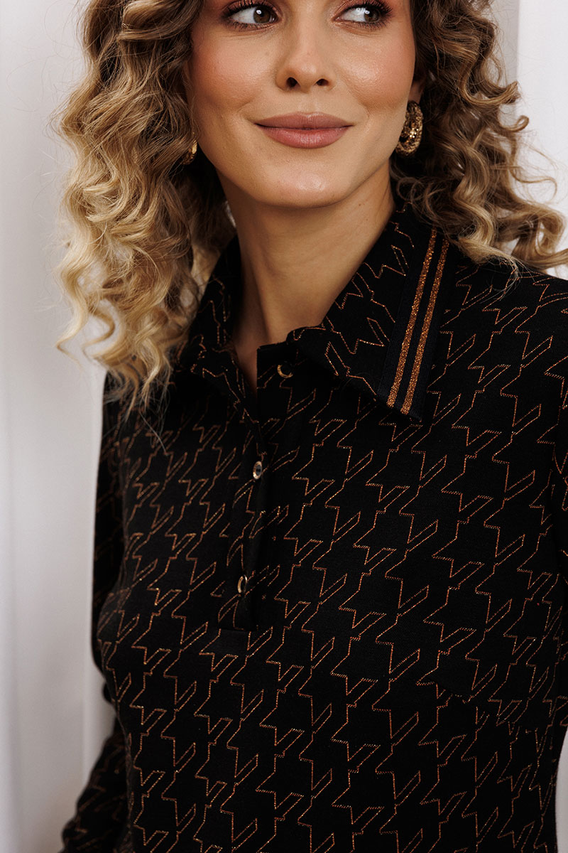 Джемпер прямого силуэта из плотного трикотажного полотна с оригинальным рисунком из люрекса. Перед с застежкой поло и нагрудными вытачками. По воротнику настрочена декоративная тесьма.