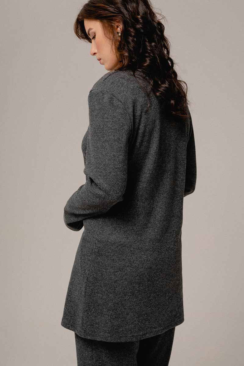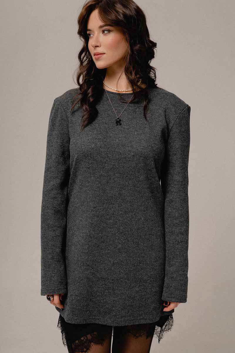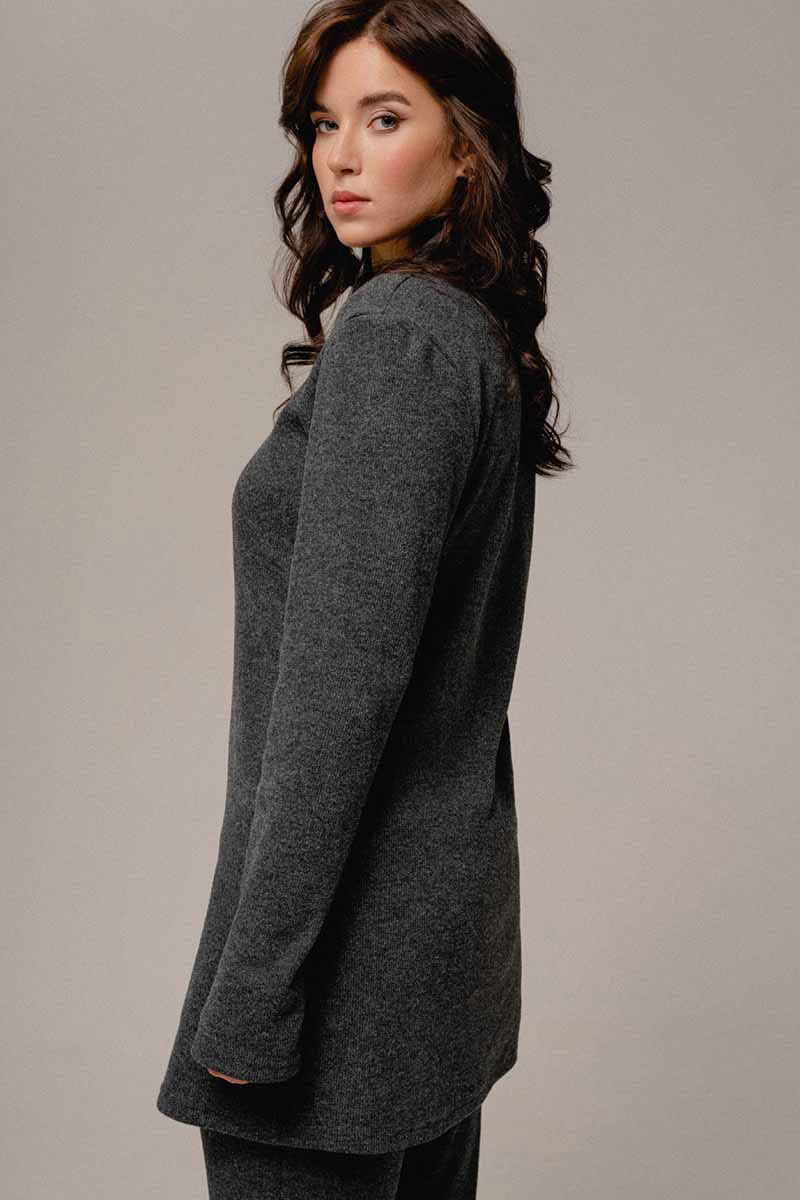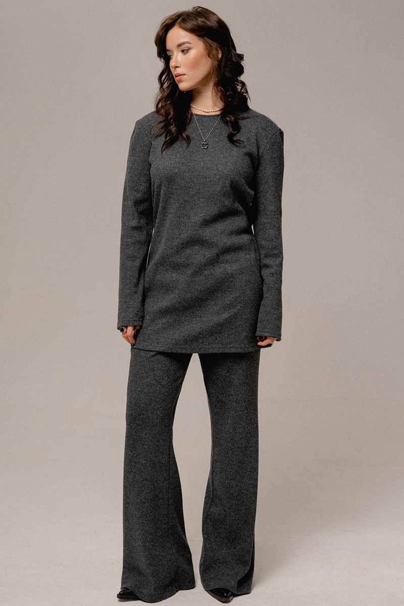 Джемпер молодежный удлиненный из трикотажного полотна в рубчик, полуприлегающего силуэта со слегка спущенной линией плеча и рукавом длиной до запястья, горловина округлой формы.